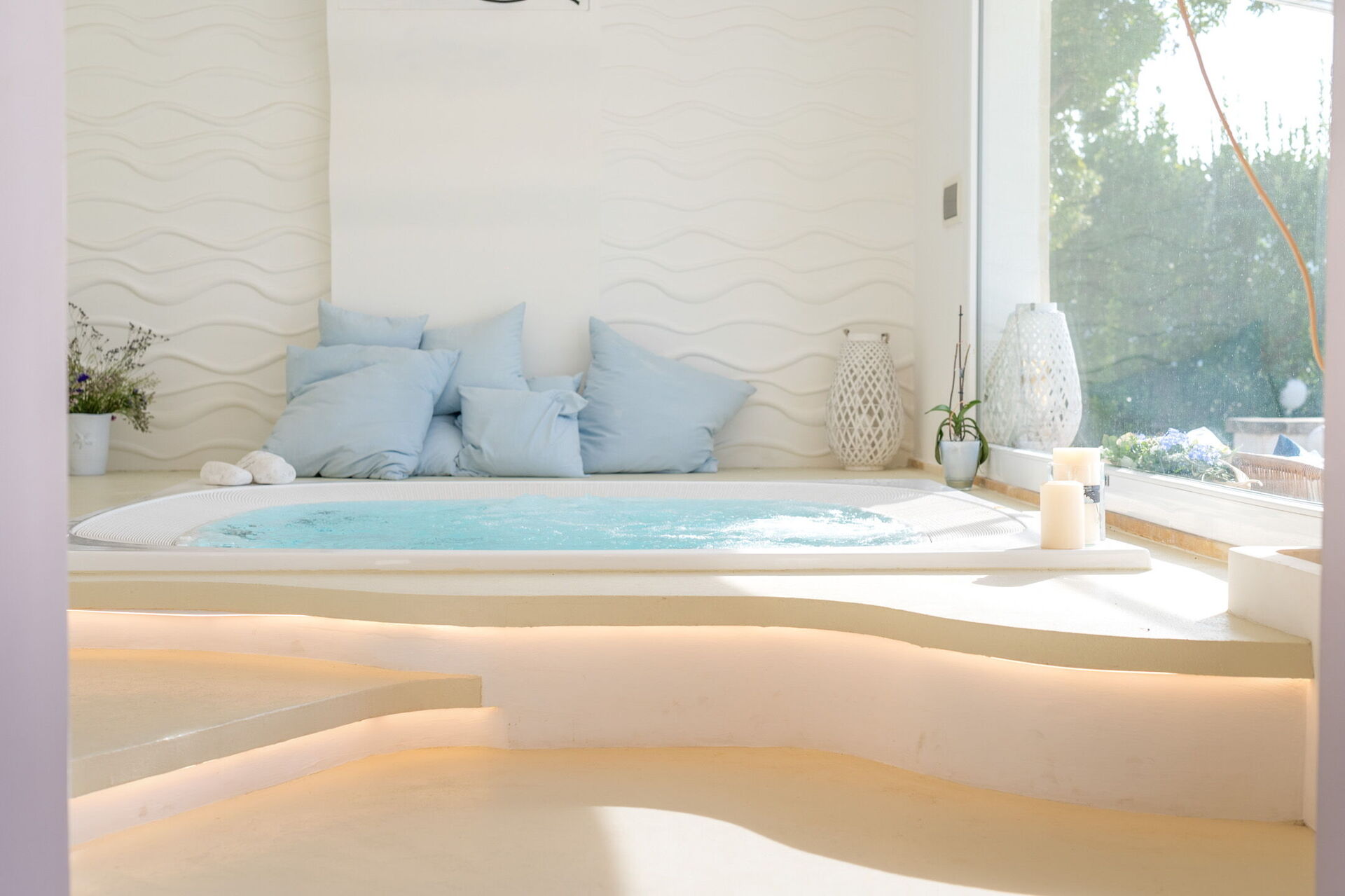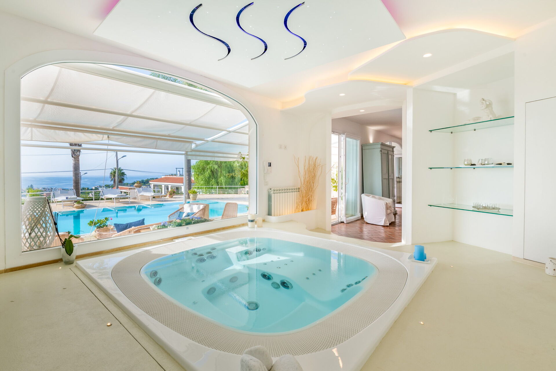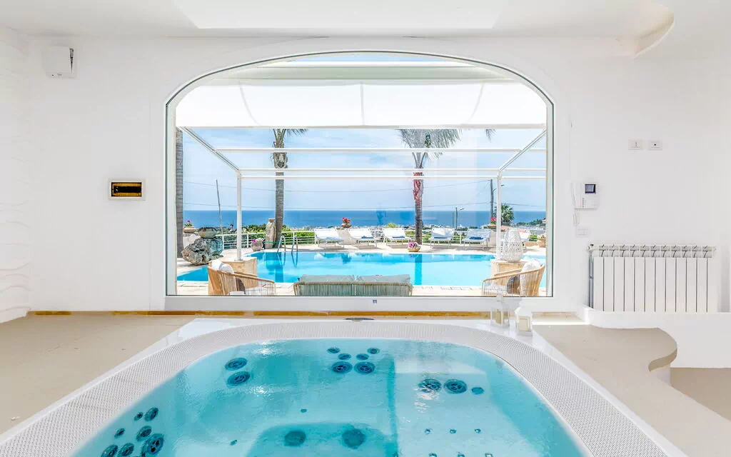 Relax e comfort: piscina privata (15x4m), jacuzzi interna con vista sul giardino, patii coperti e una cucina completamente attrezzata.