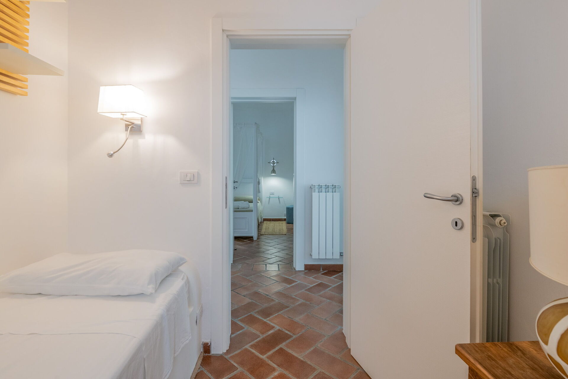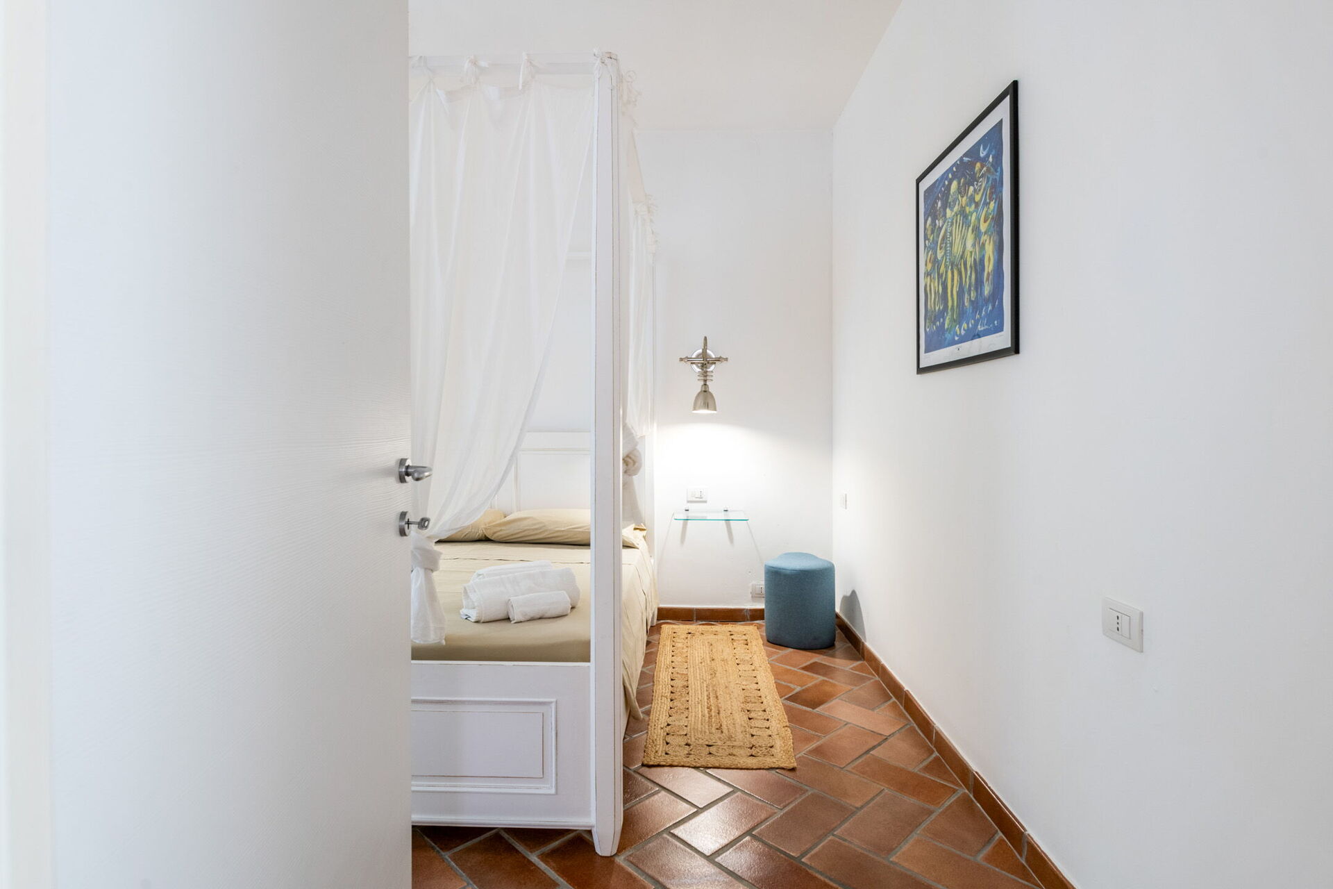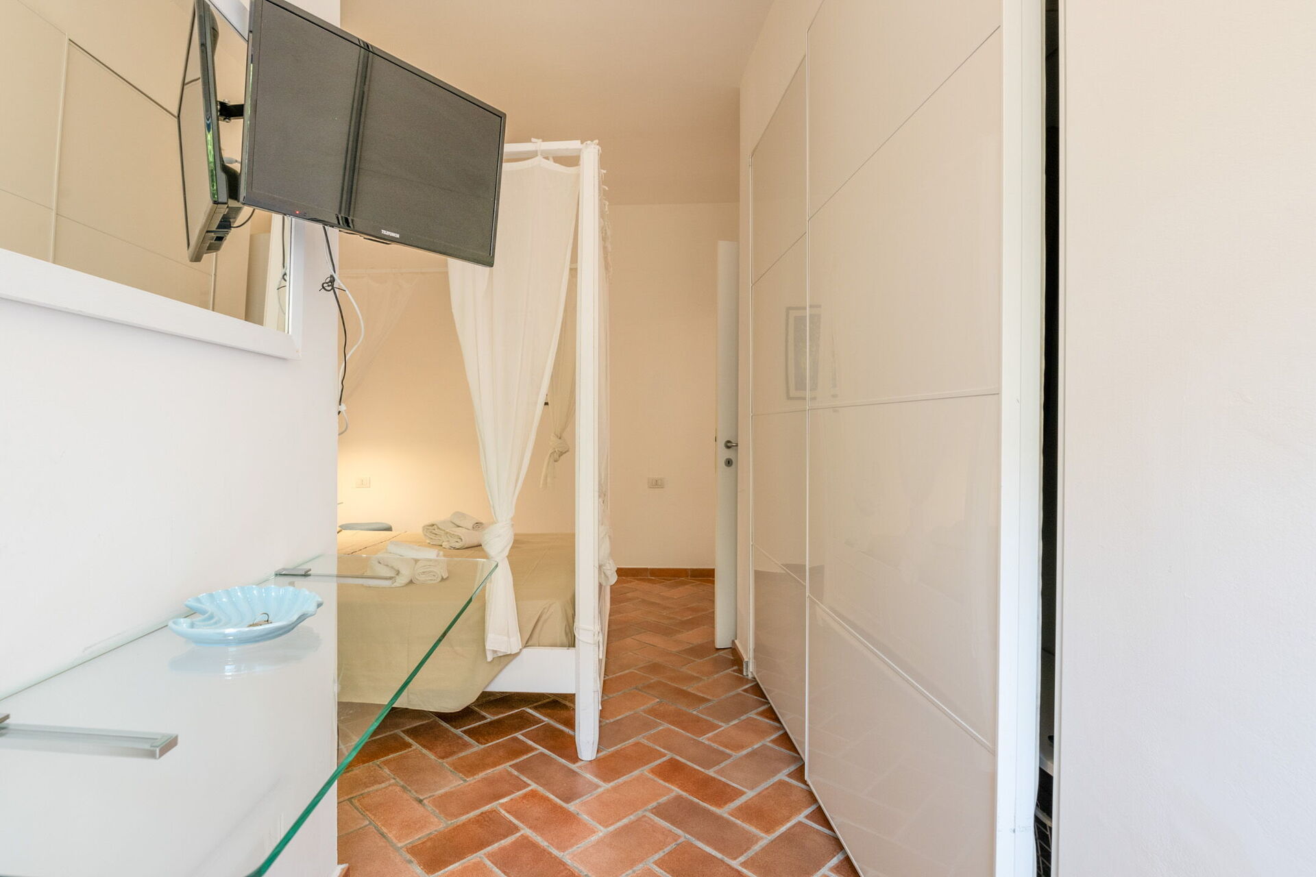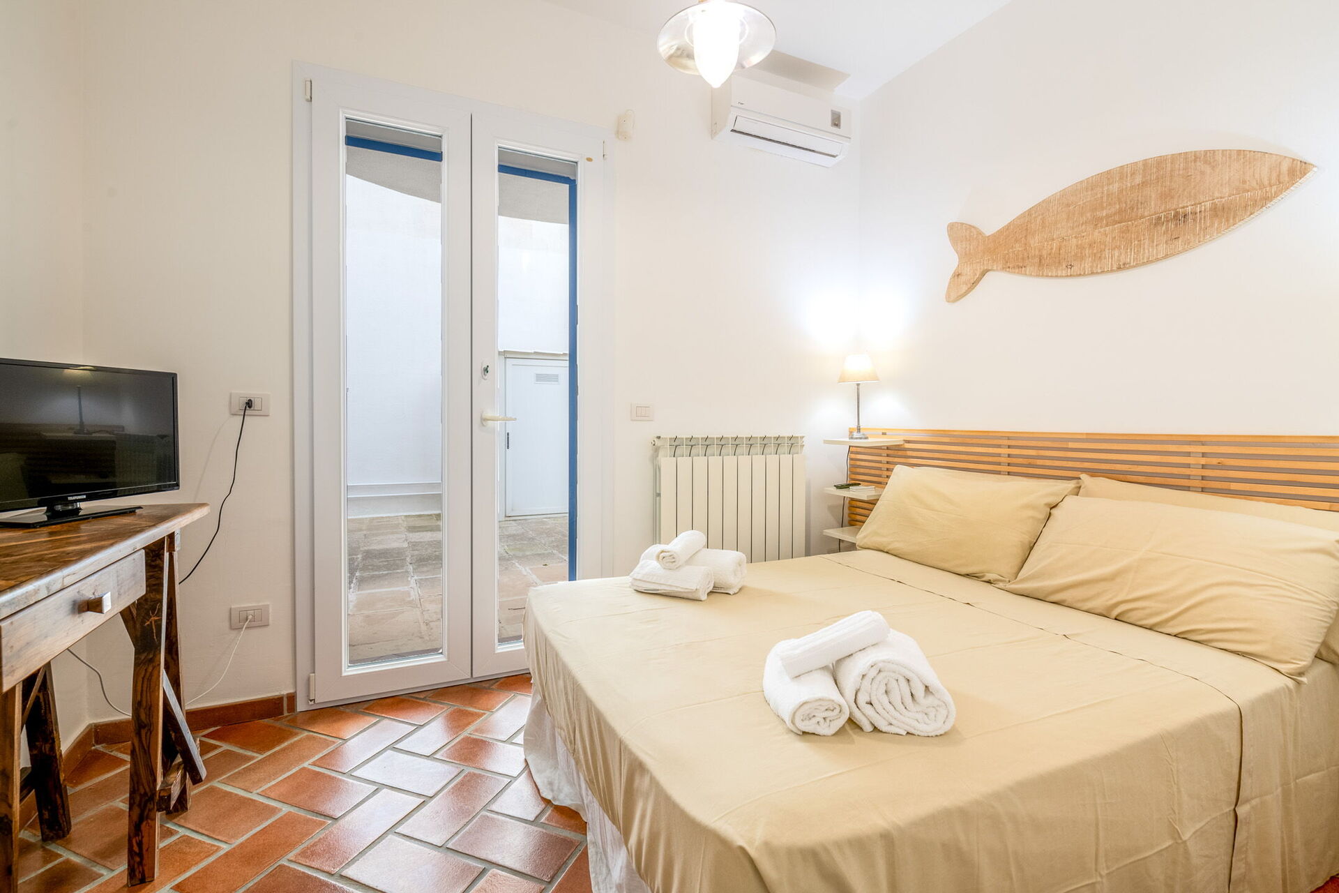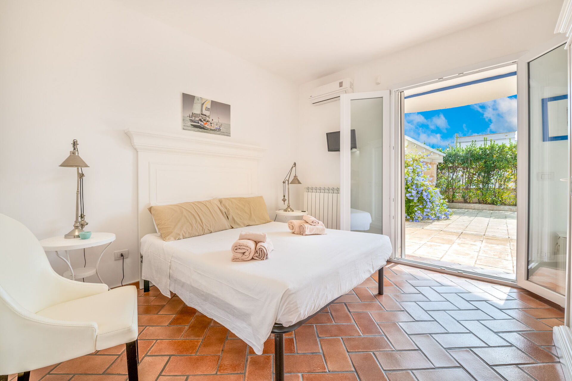 Camera da letto 3: letto matrimoniale (larghezza: 1.6m, lunghezza: 1.9m), aria condizionata, internet WIFI, uscita sul giardino.