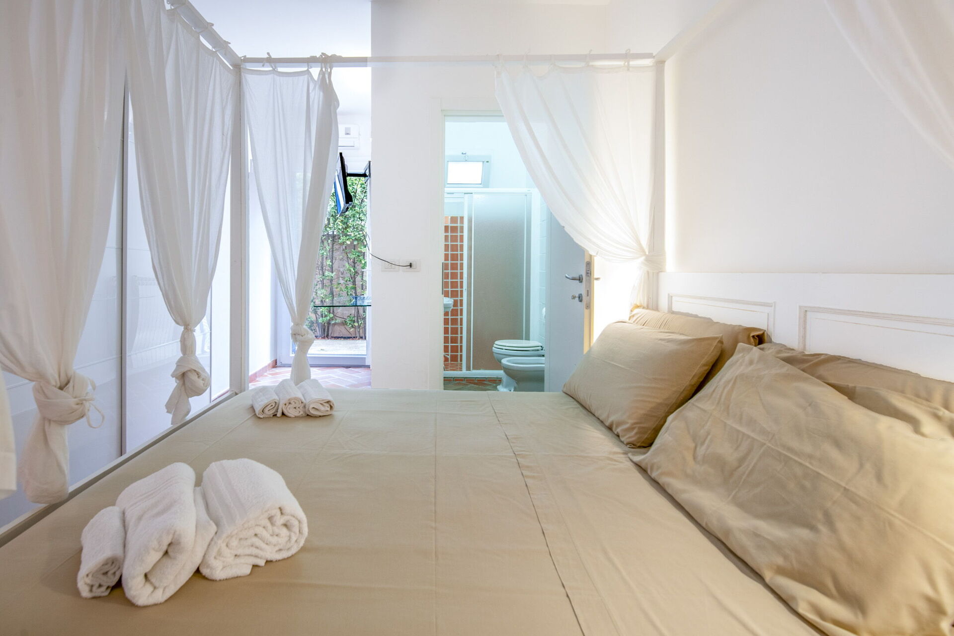 Camera da letto con bagno 1: letto matrimoniale (larghezza: 1.6m, lunghezza: 1.9m), aria condizionata, lavandino, bidet, wc, doccia, asciugacapelli, internet WIFI, uscita sul giardino.