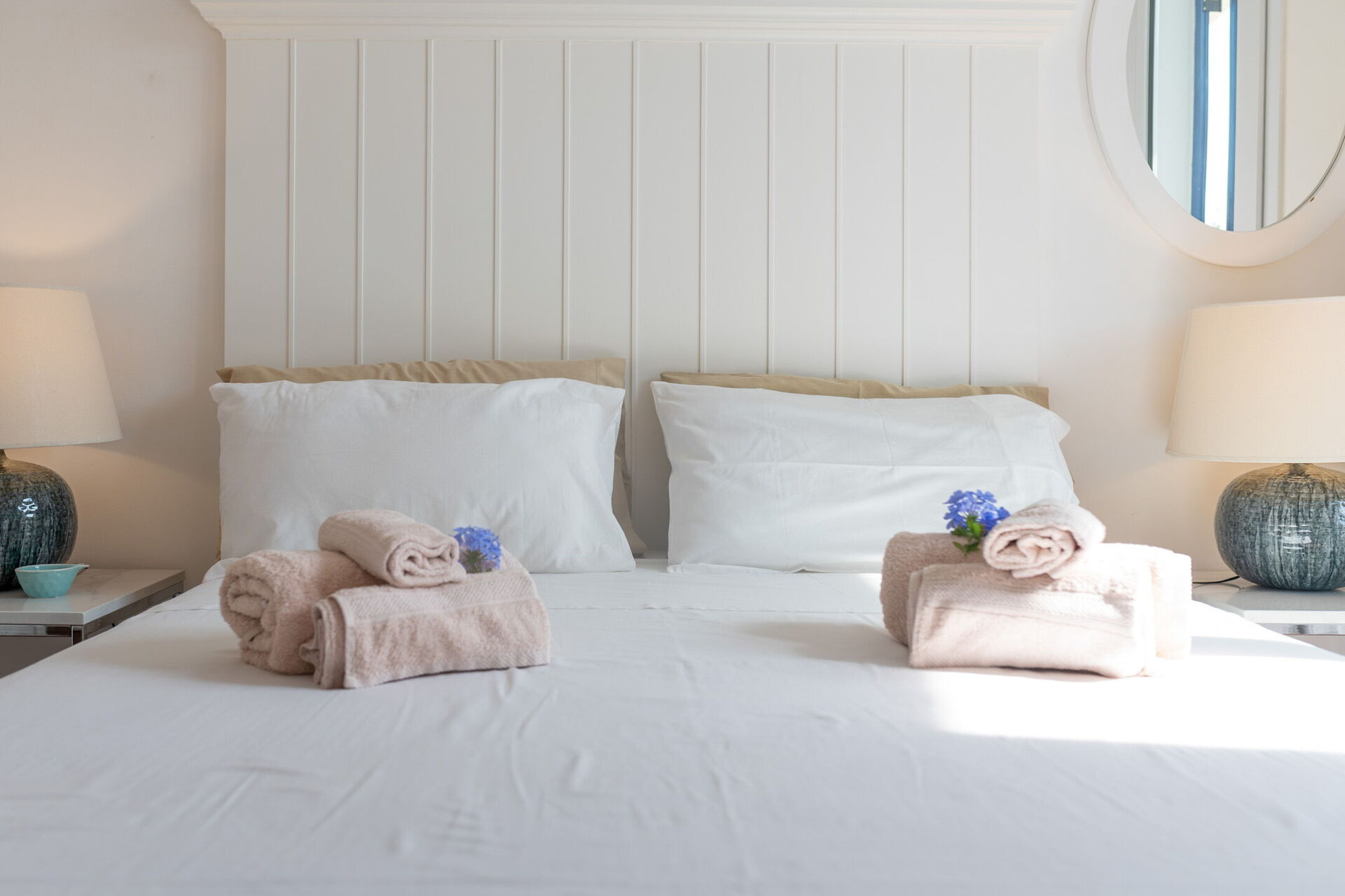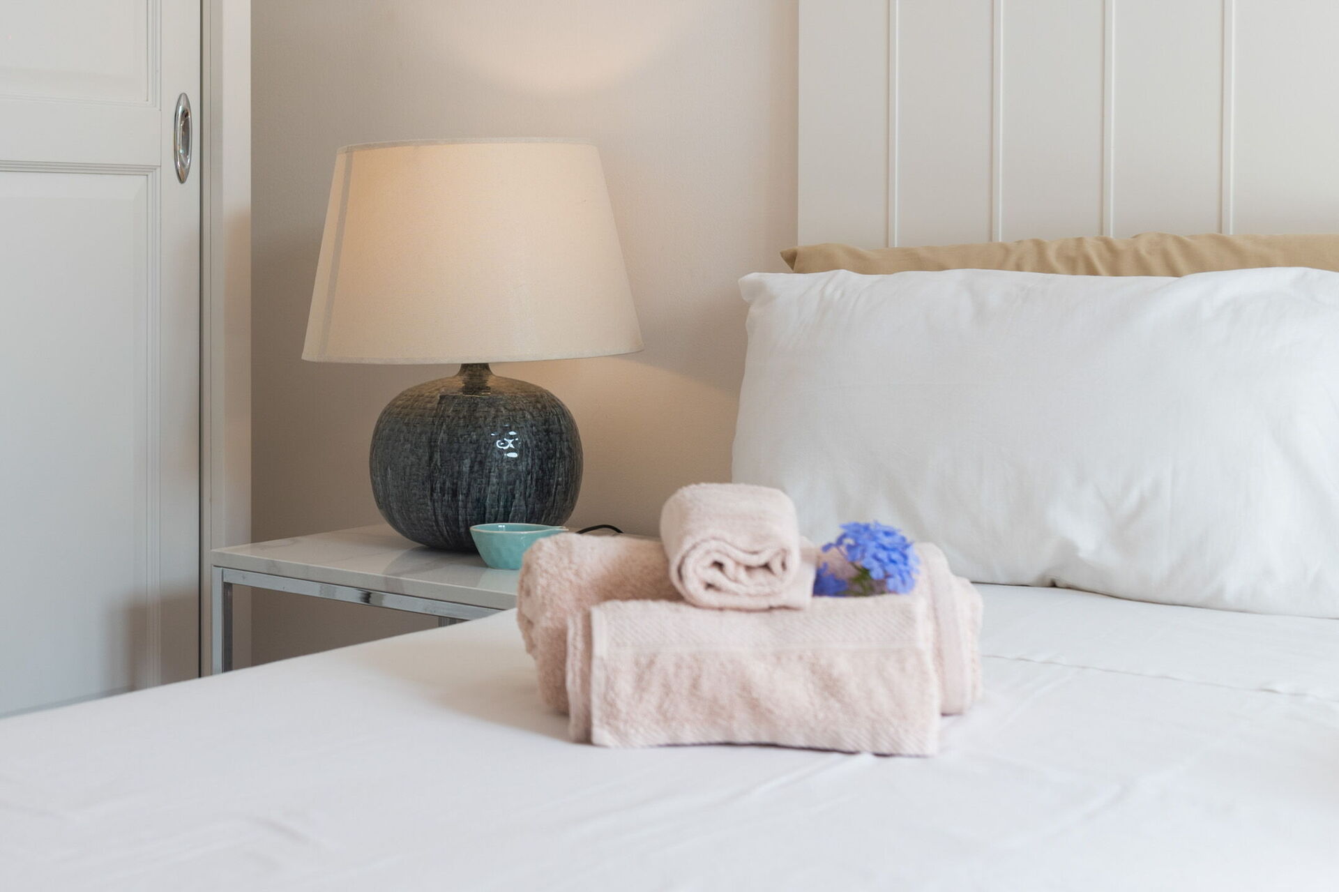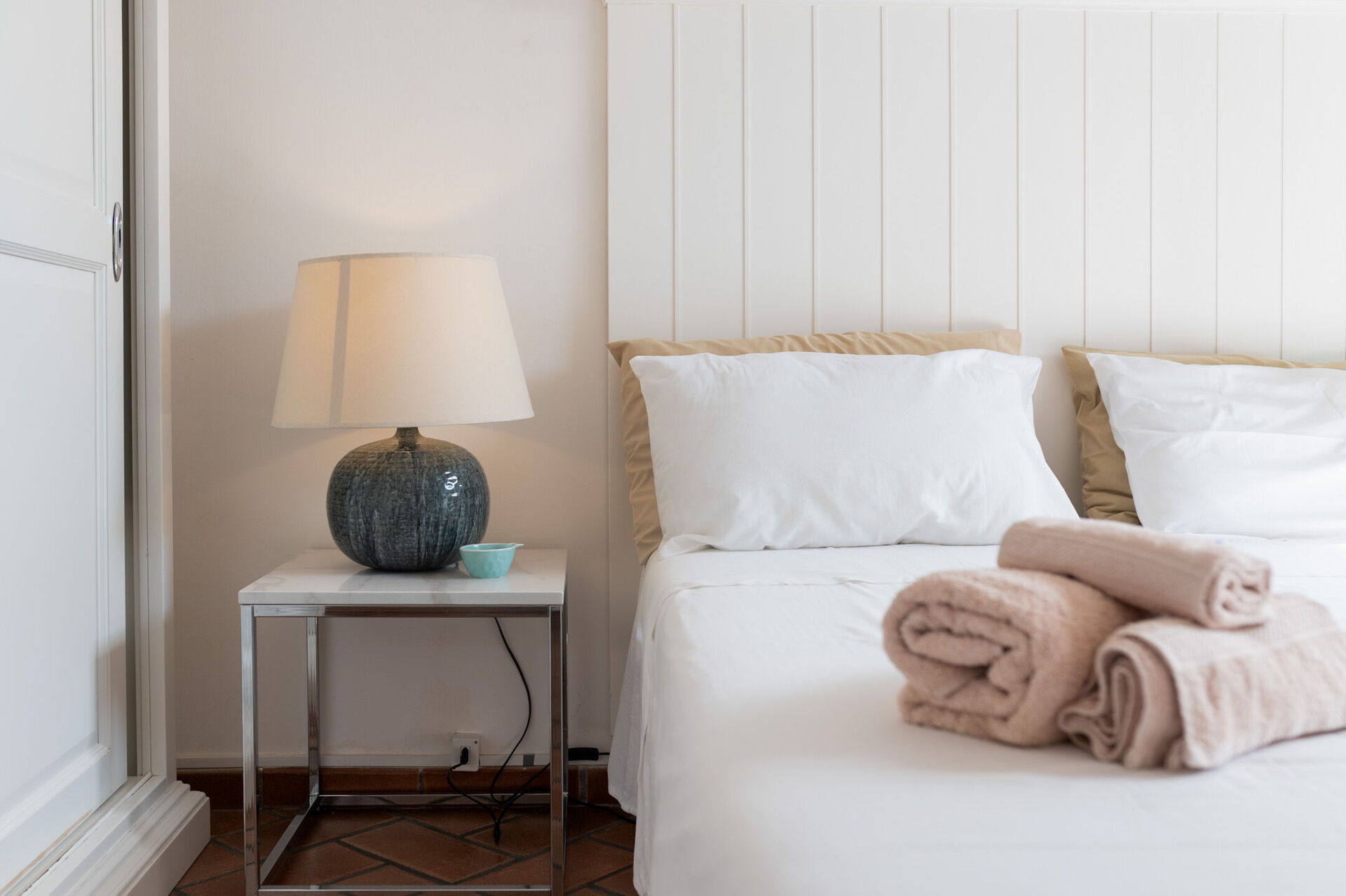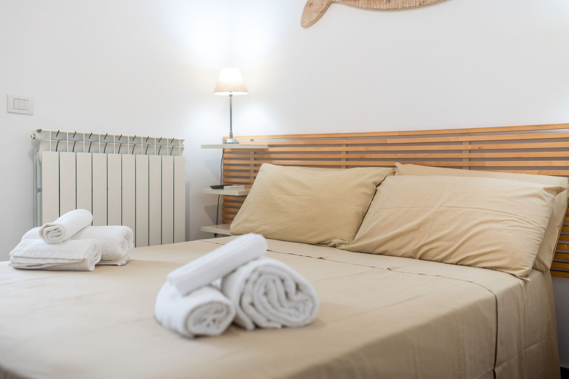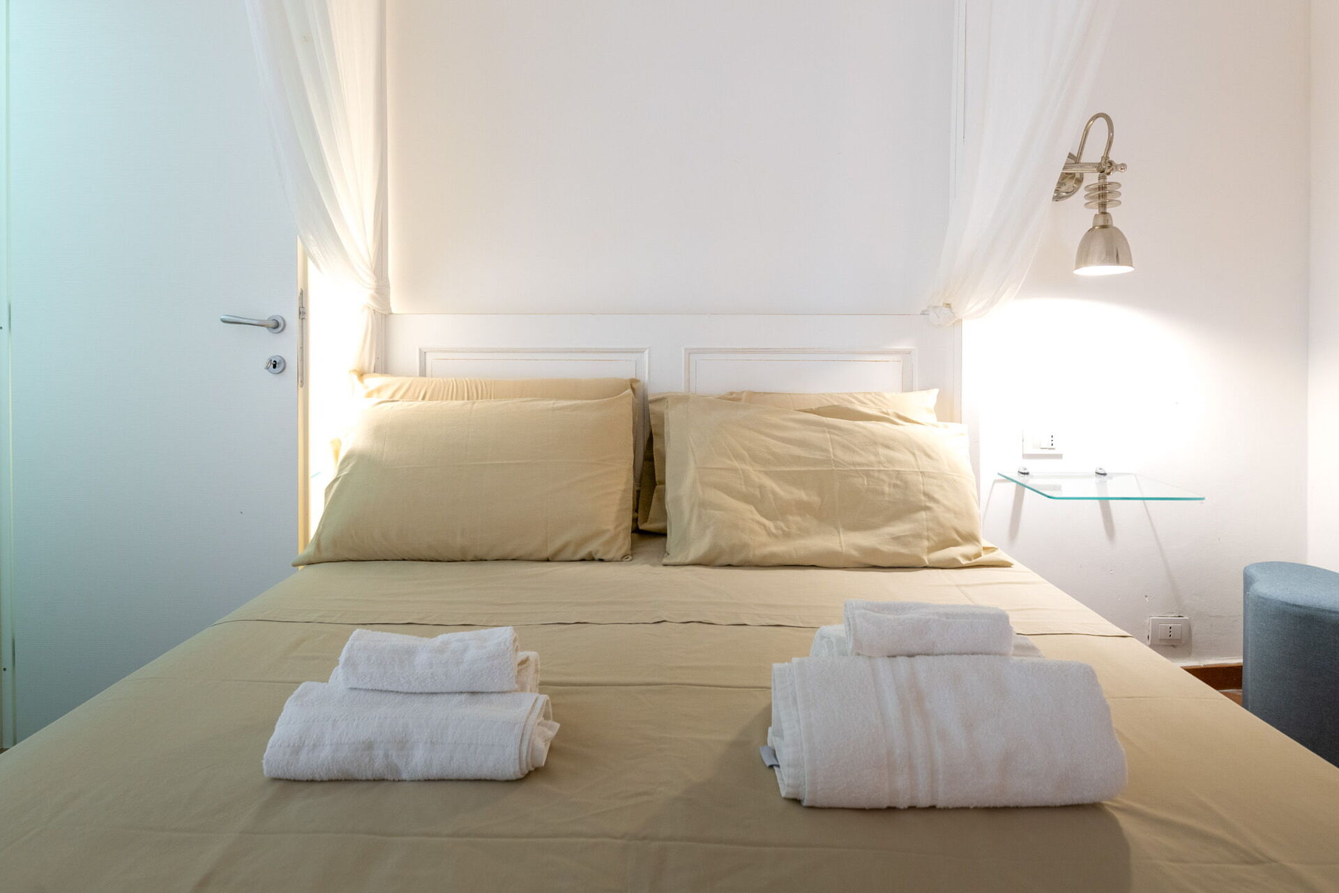 Fornitura di biancheria da letto e da bagno all'arrivo (4pp: telo viso, telo corpo, telo bidet, telo piscina e tappetino doccia).
