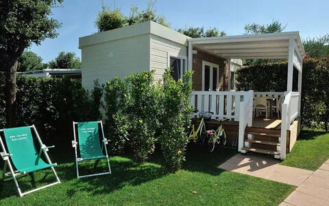 La casa mobile è dotata di arredi pratici, tra cui una cucina aperta con 4 piastre. È inoltre dotata di doccia/WC, aria condizionata, una terrazza coperta con mobili, un barbecue elettrico (portatile) e sdraio (2). Inoltre, un parcheggio per un'auto e un garage sono disponibili per la vostra comodità. La capacità massima è di 5 persone, con 2 camere da letto e 1 bagno.