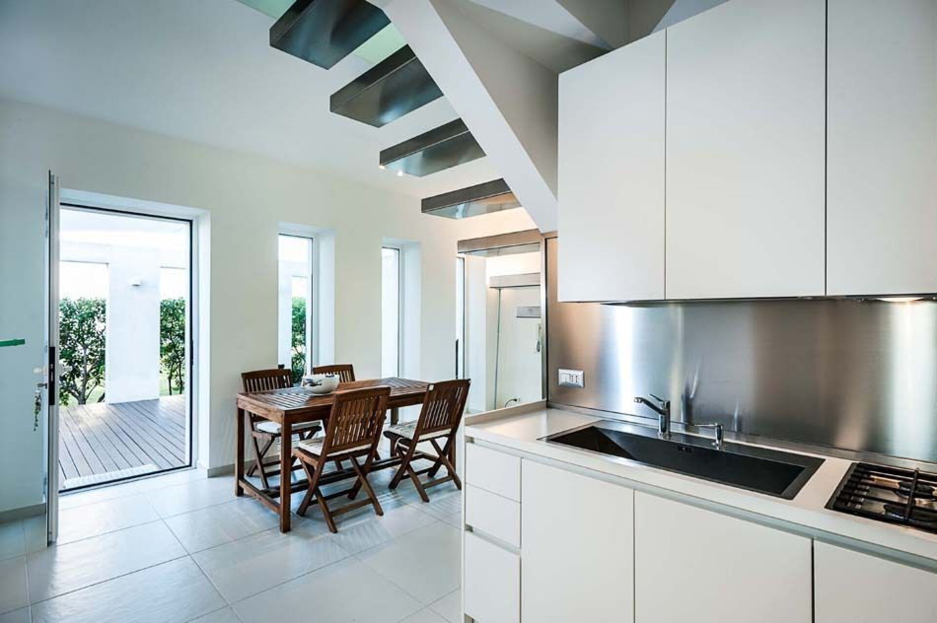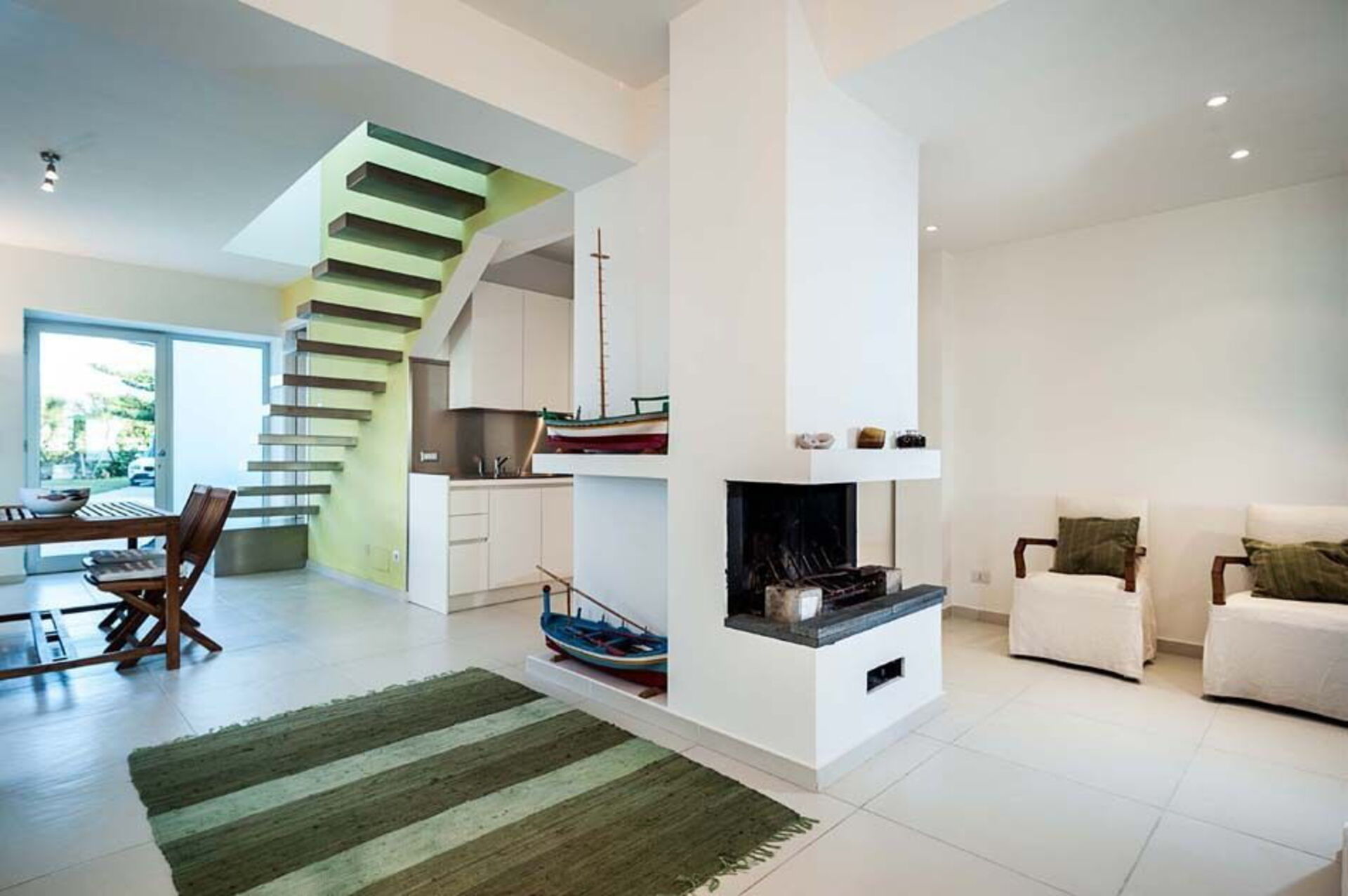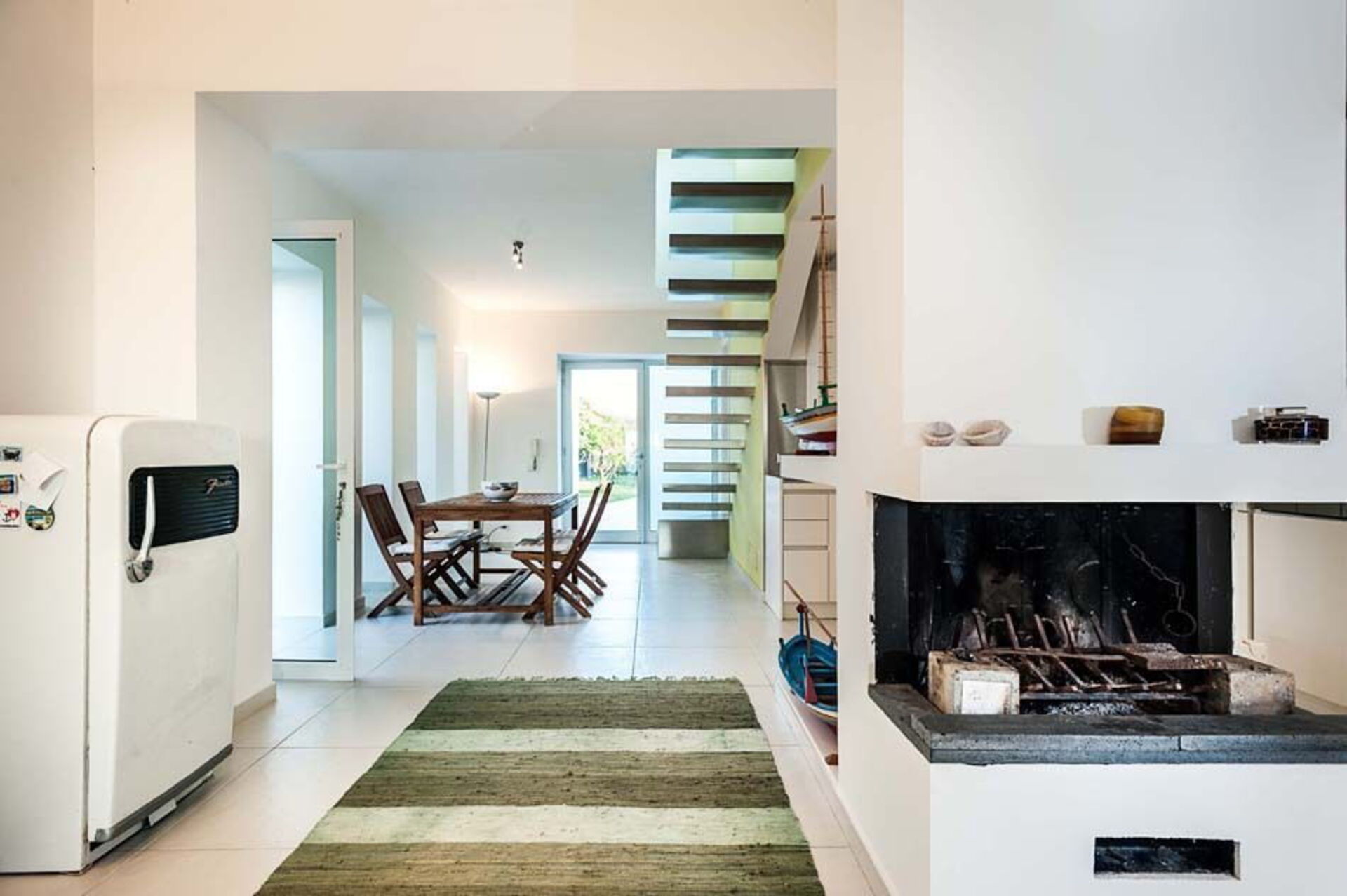 Al piano terra si trovano un luminoso soggiorno con camino e zona pranzo, la cucina e un bagno. Dal soggiorno attraverso un’originale scala sospesa si accede al primo piano mansardato che ospita tre camere da letto e due bagni.