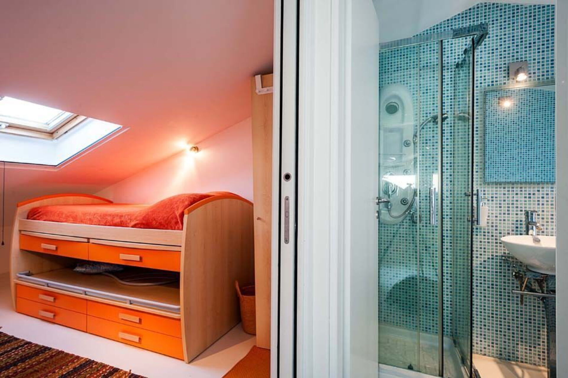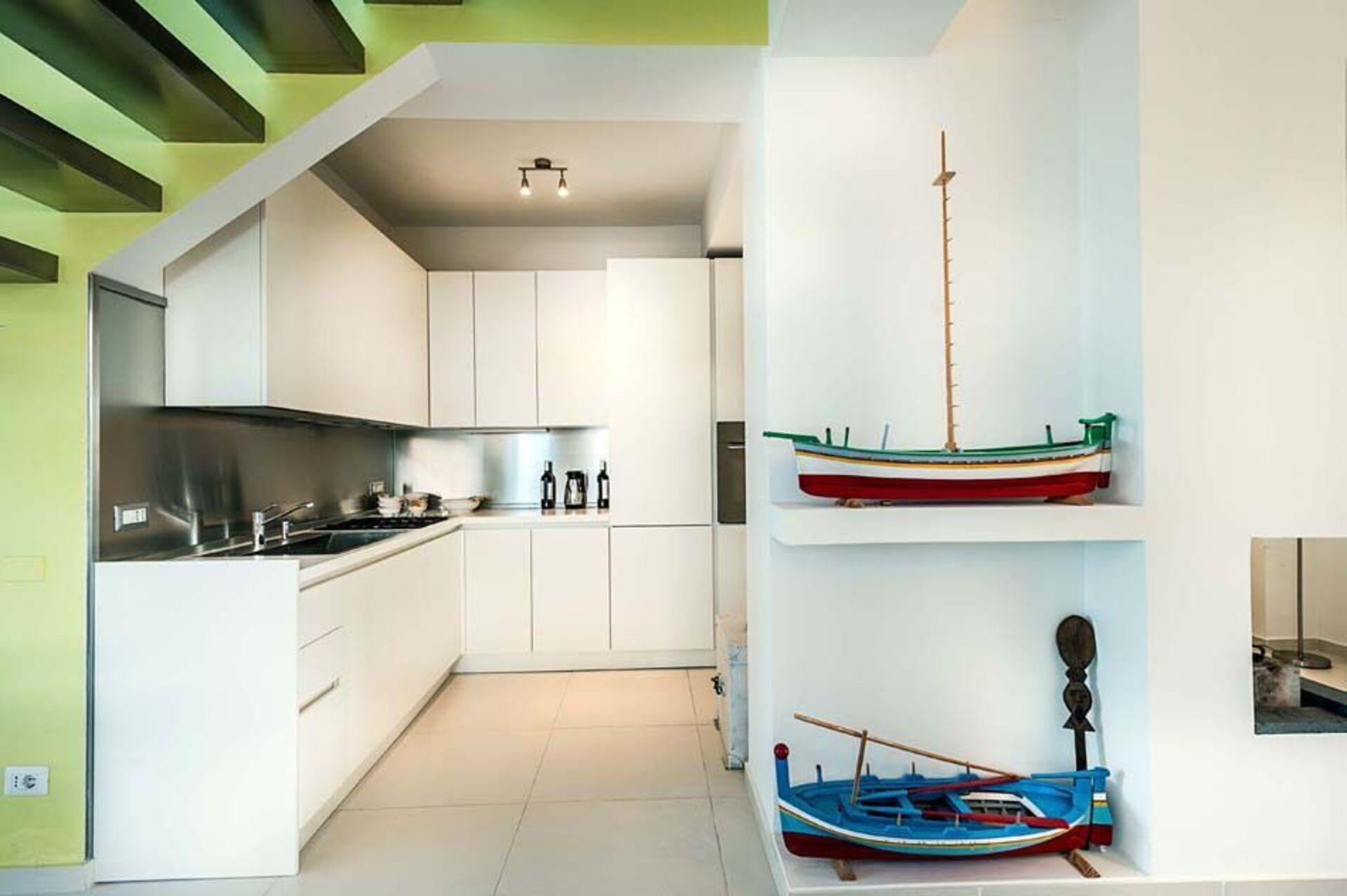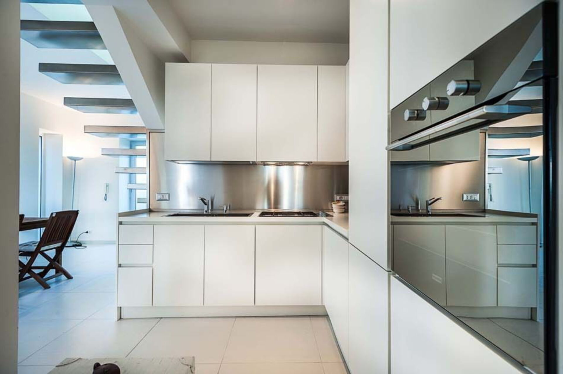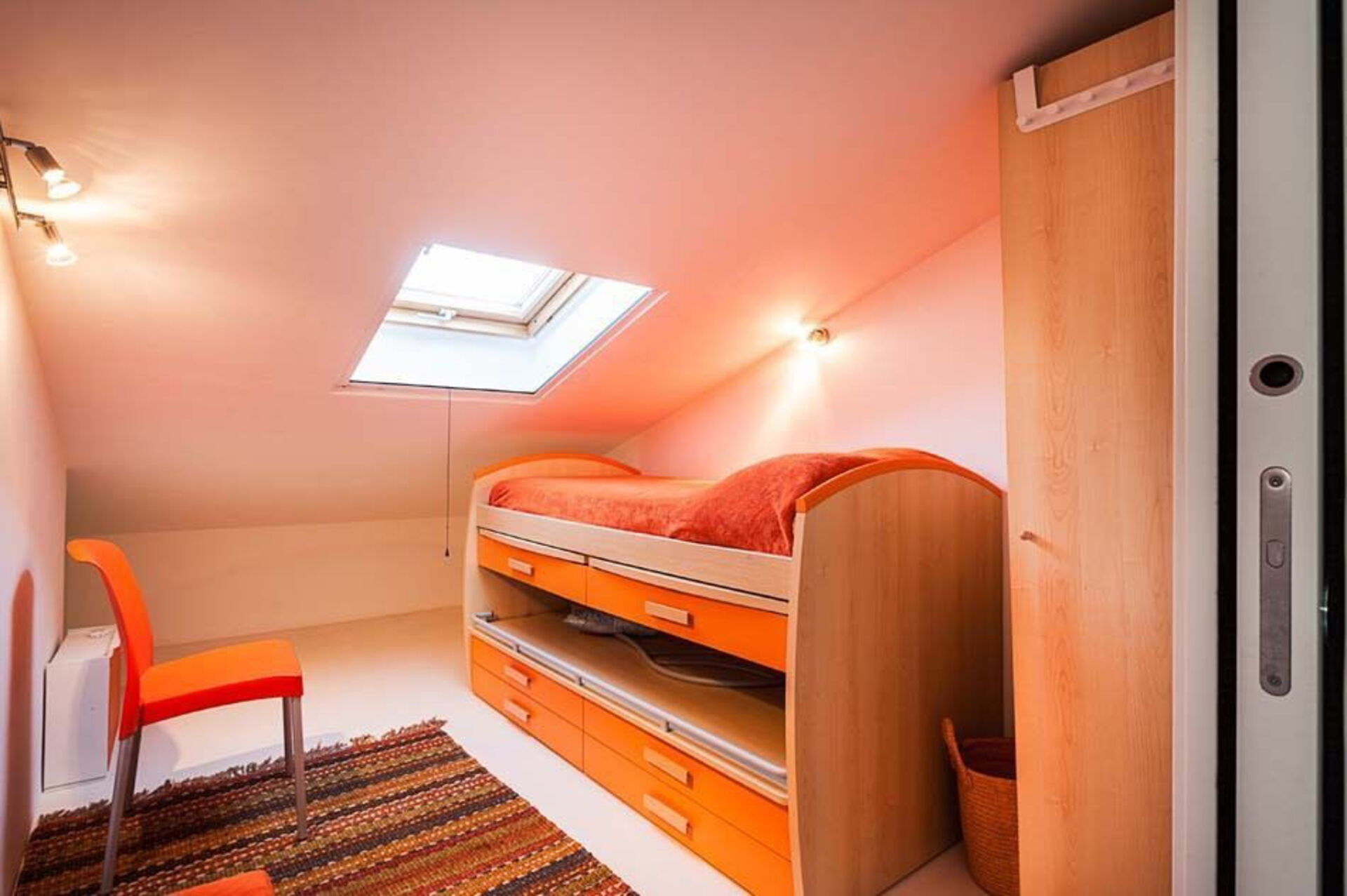 Al piano terra si trovano un luminoso soggiorno con camino e zona pranzo, la cucina e un bagno. Dal soggiorno attraverso un’originale scala sospesa si accede al primo piano mansardato che ospita tre camere da letto e due bagni.