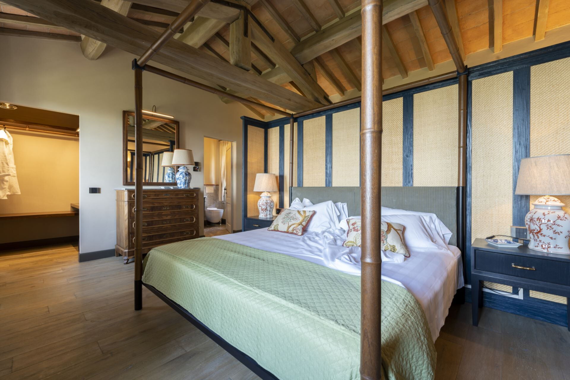 Camera da letto con bagno 4: letto king size (larghezza: 200m, lunghezza: 200m), internet WIFI, aria condizionata, zanzariere, divano, scrivania, lavandino, wc, bidet, doccia.