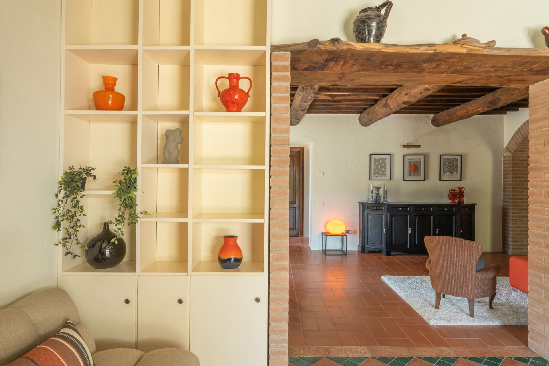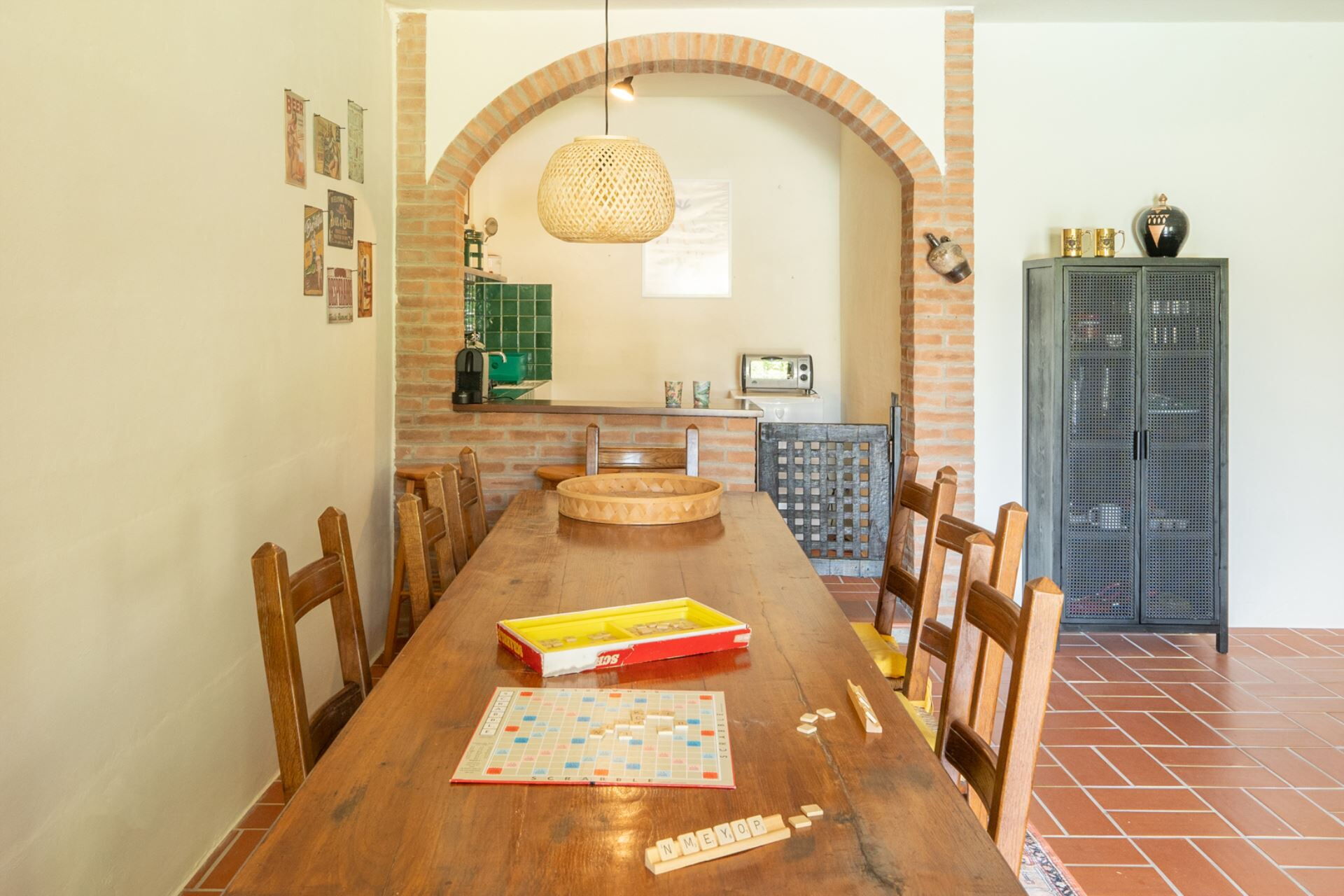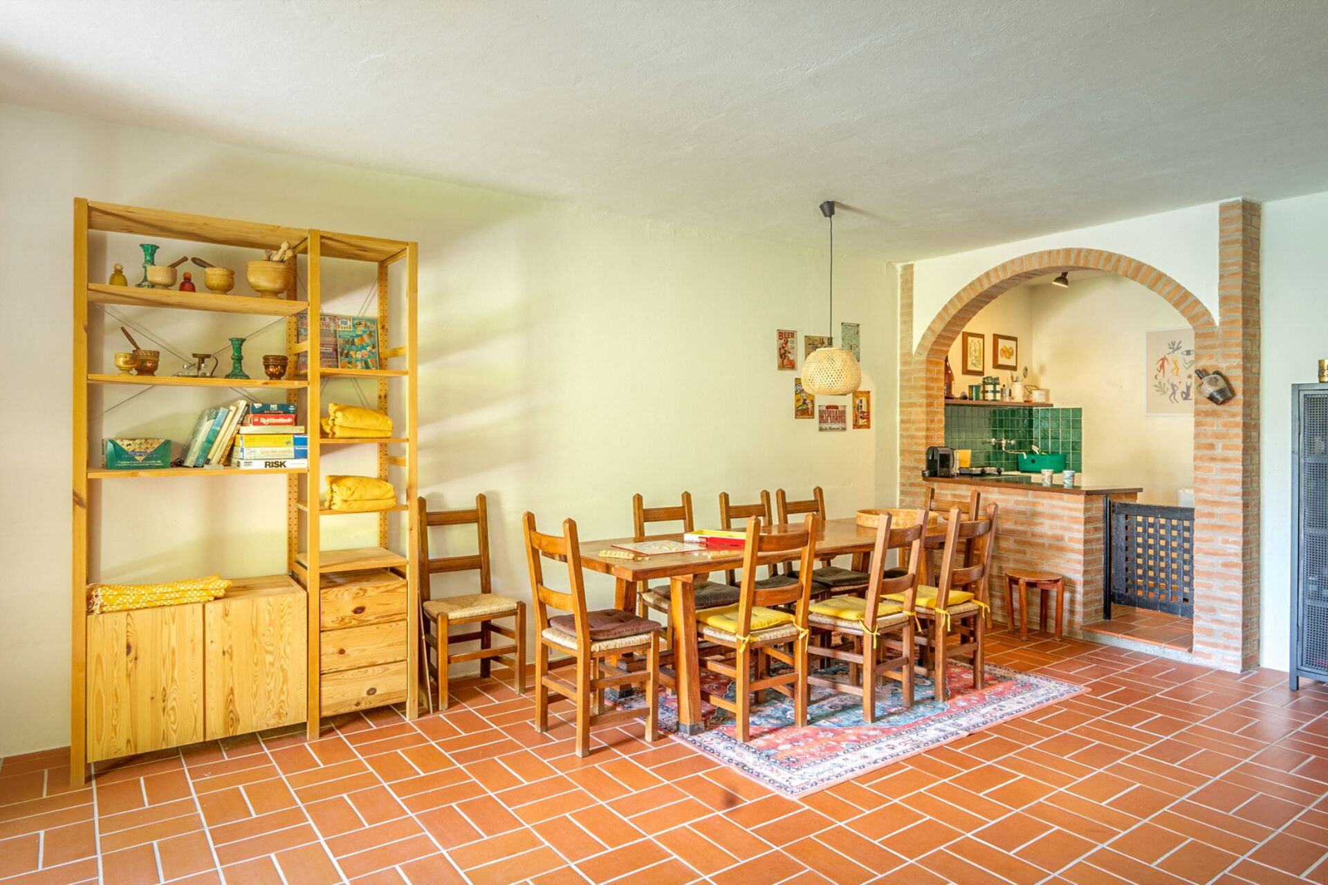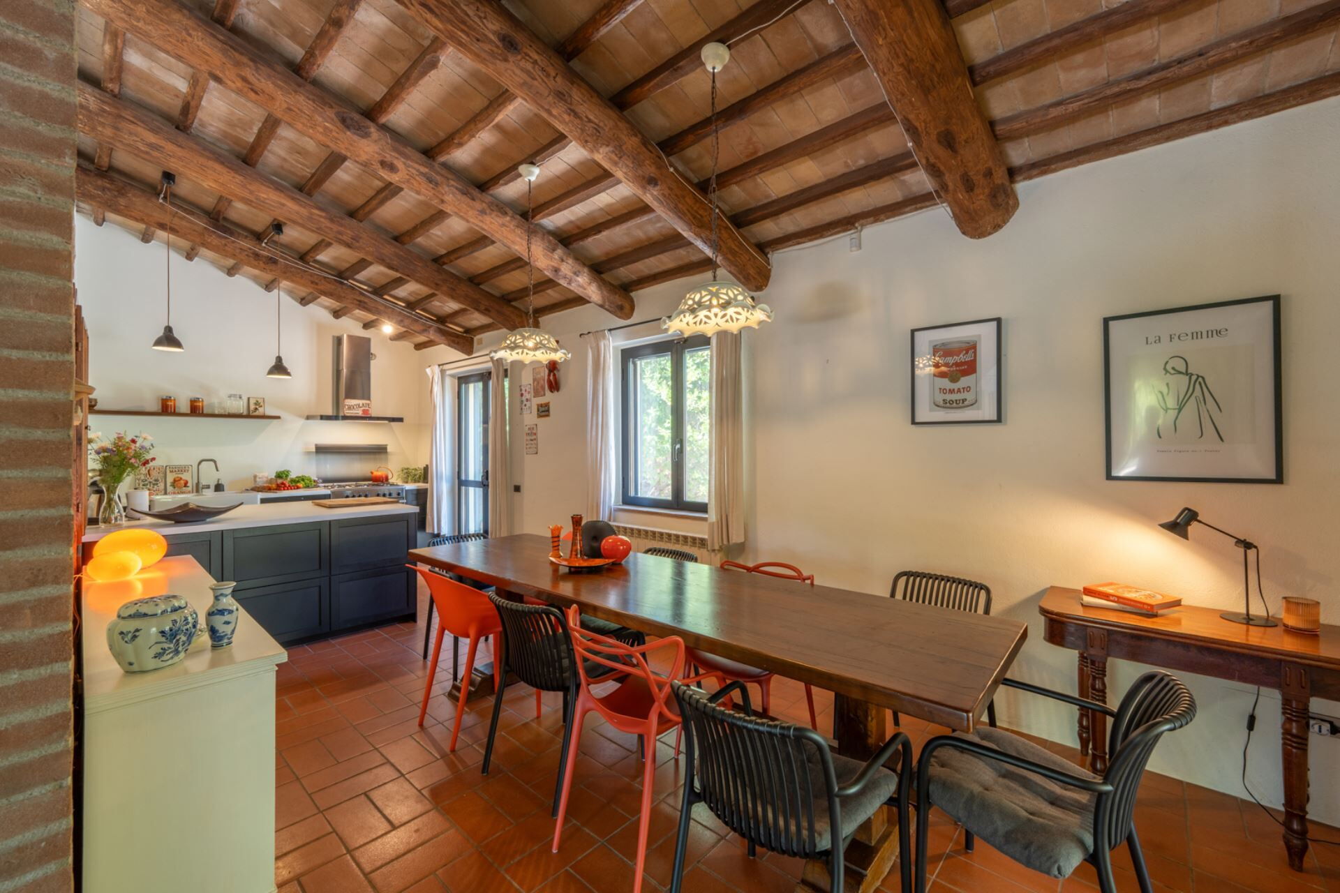 Entrando si accede subito alla zona living accogliente e moderna con divani e poltrone, attraversando un arco si arriva alla cucina con un lungo tavolo da pranzo e un comodo angolo cottura con penisola.