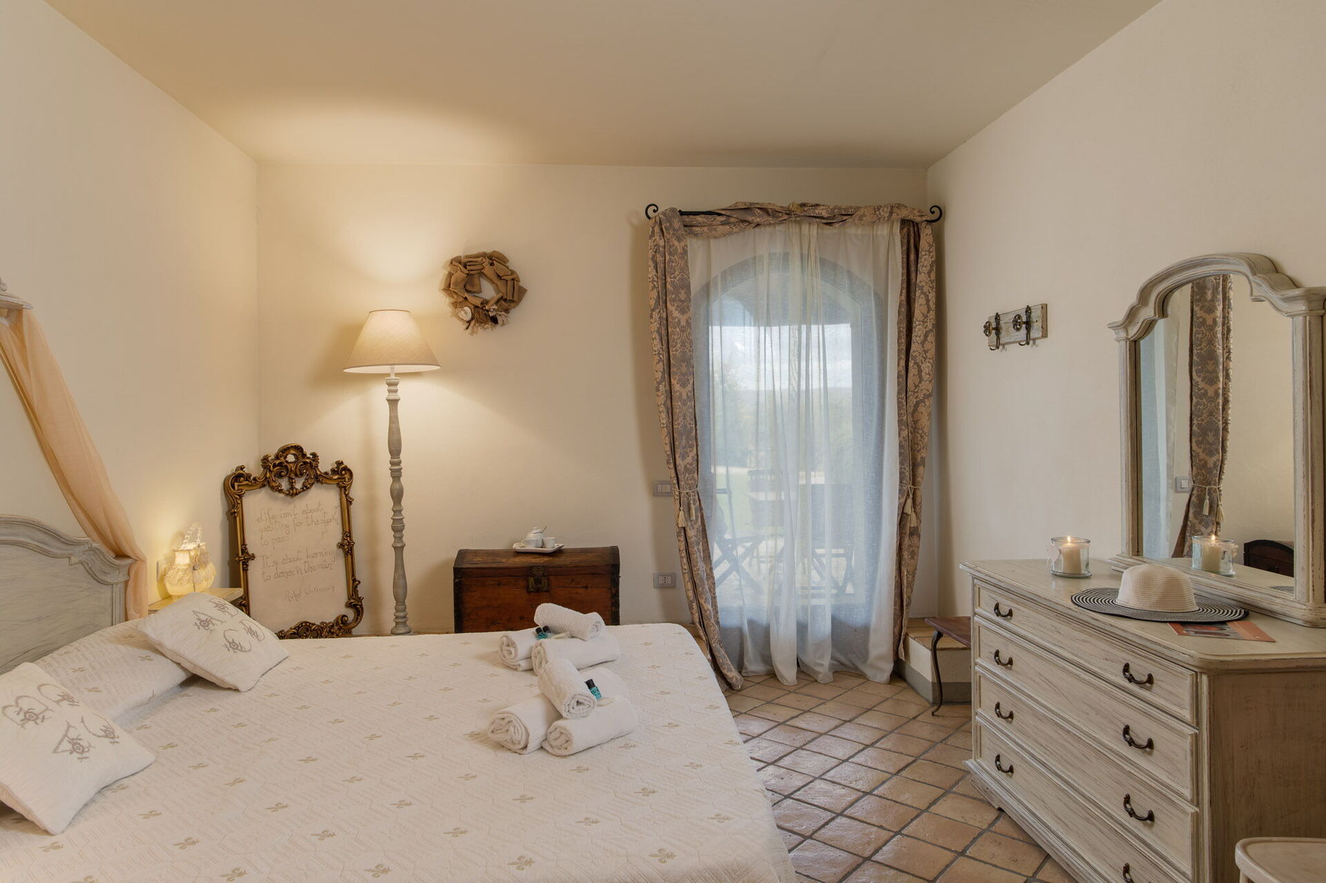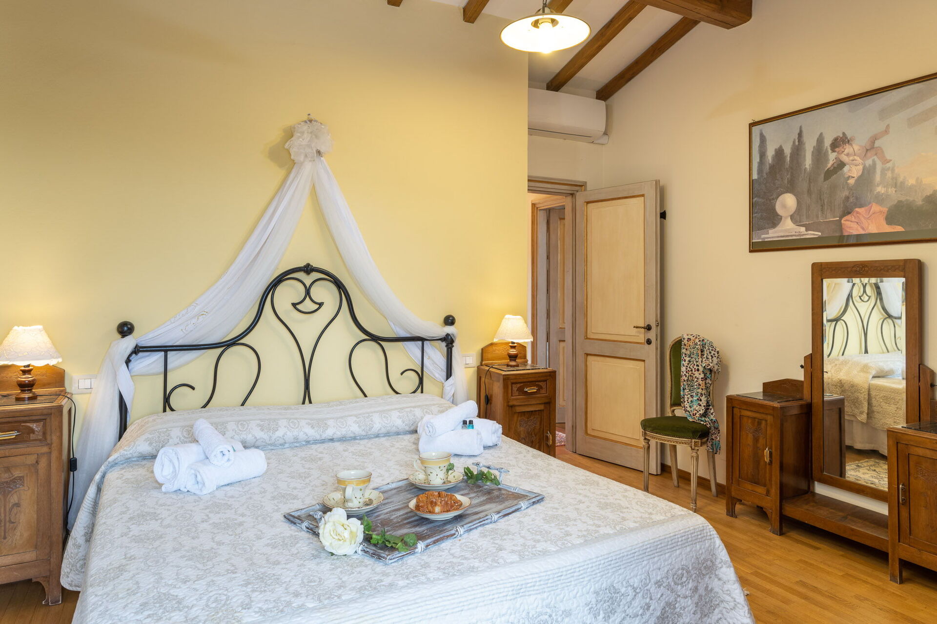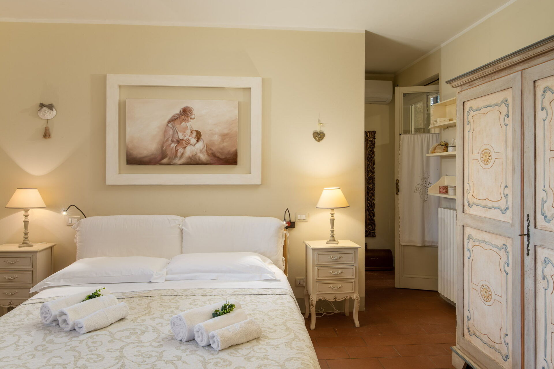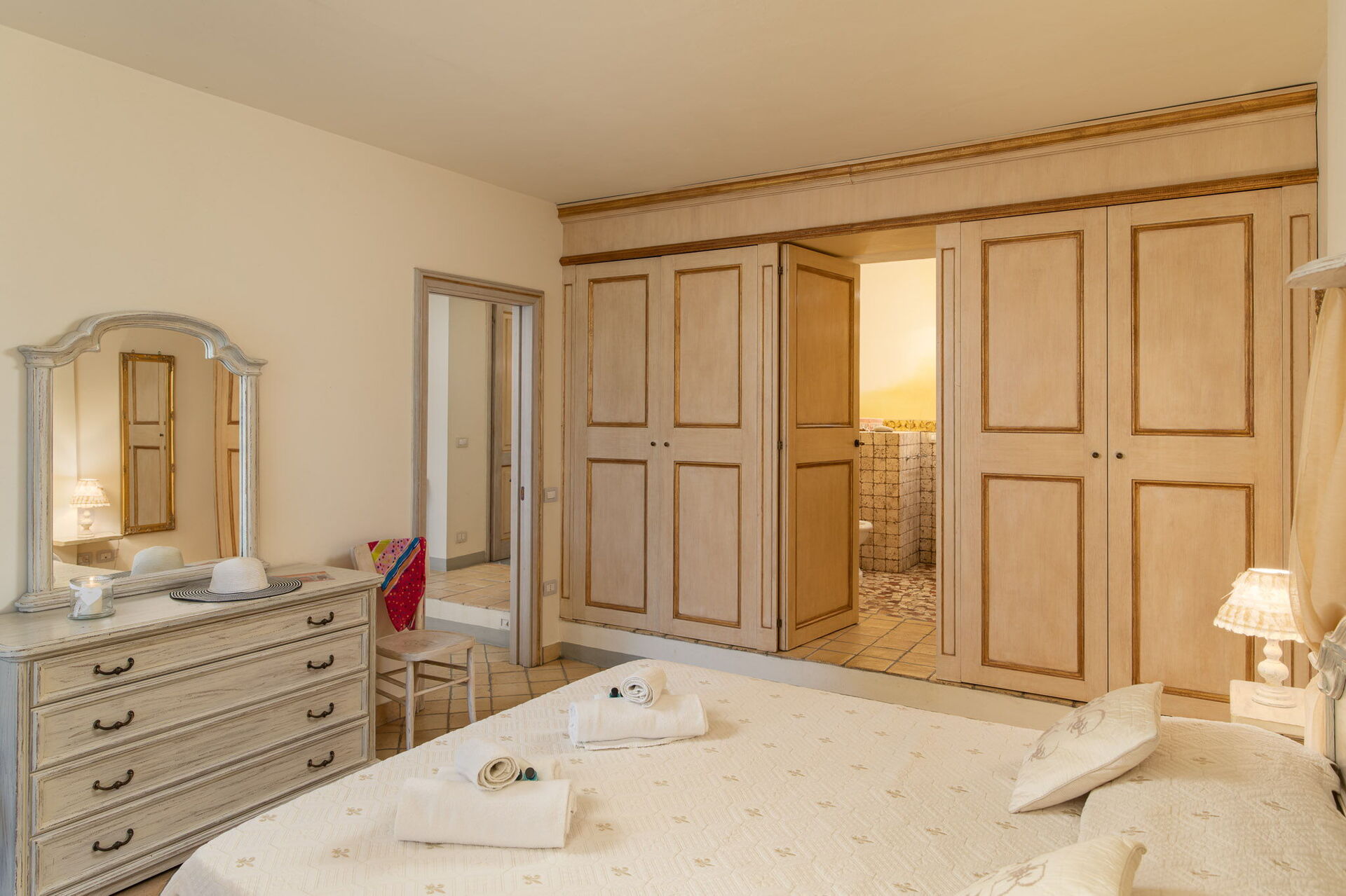 Camera da letto con bagno: letto matrimoniale (larghezza: 160m, lunghezza: 200m), culla, internet WIFI, internet WIFI, aria condizionata, poltrona, scrivania, lavandino, bidet, doccia, asciugacapelli, uscita sul giardino.