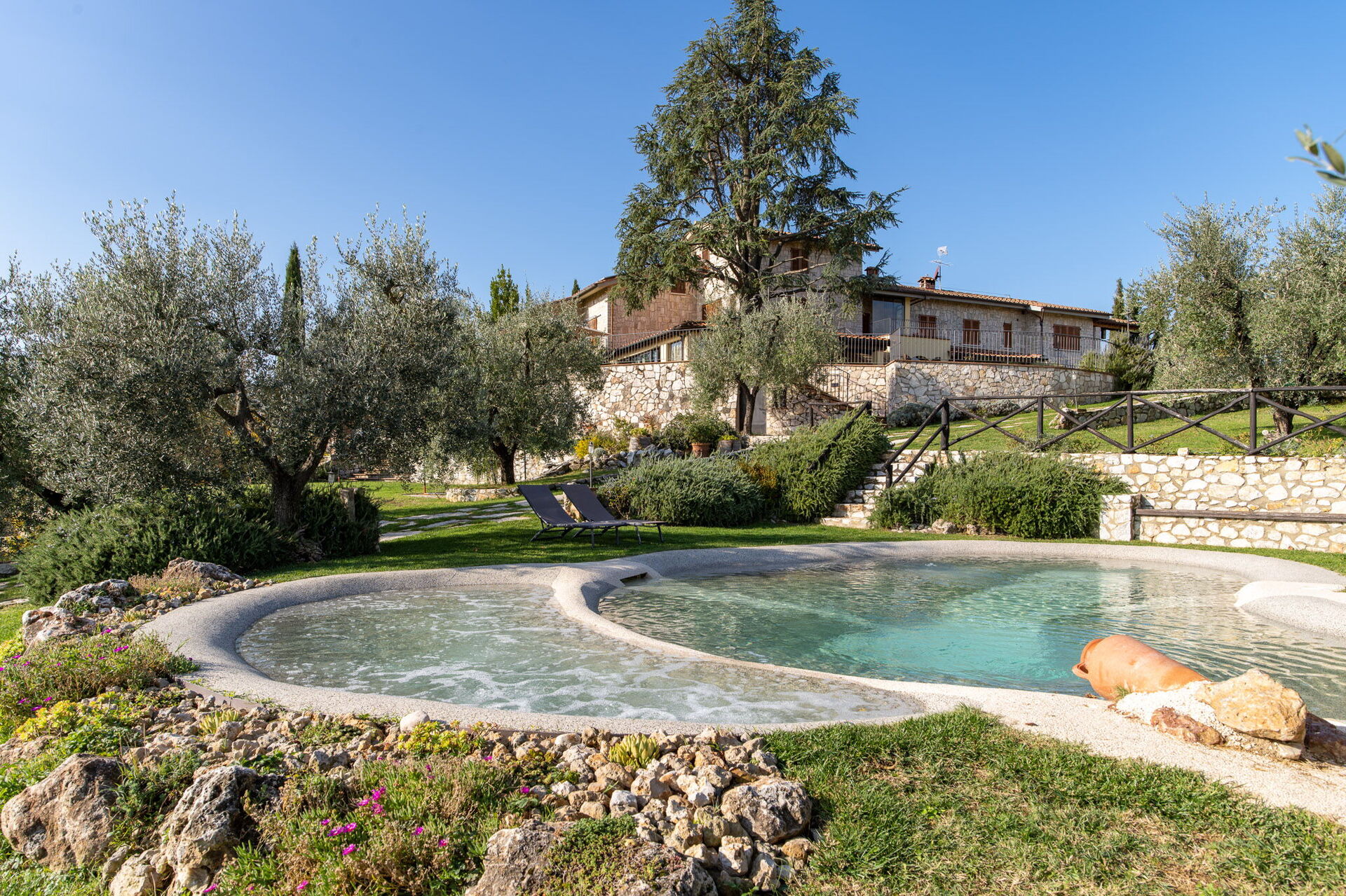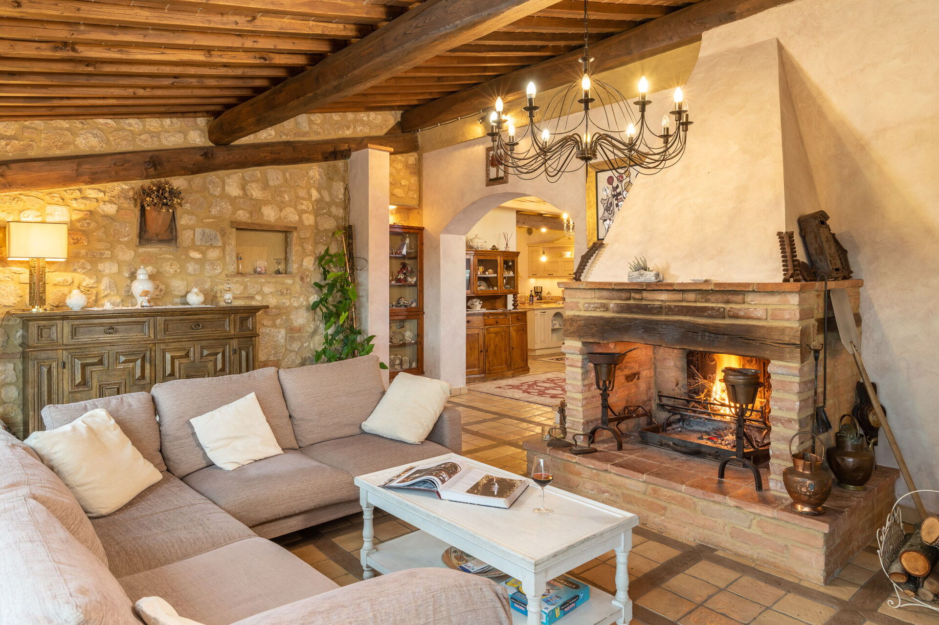 Giardino (2500 m2): piscina (privato/a, esterno/a), internet WIFI, barbeque, caminetto, possibilità di mangiare all'aperto, tavolo da pranzo (persone: 14), arredamento da giardino, arredamento da terrazza, sdraio.