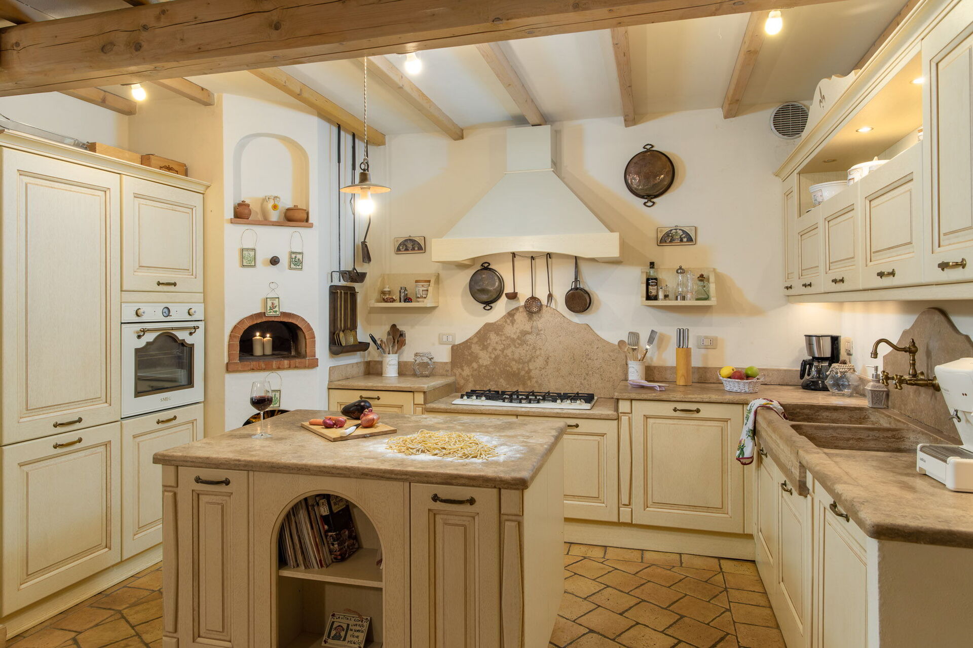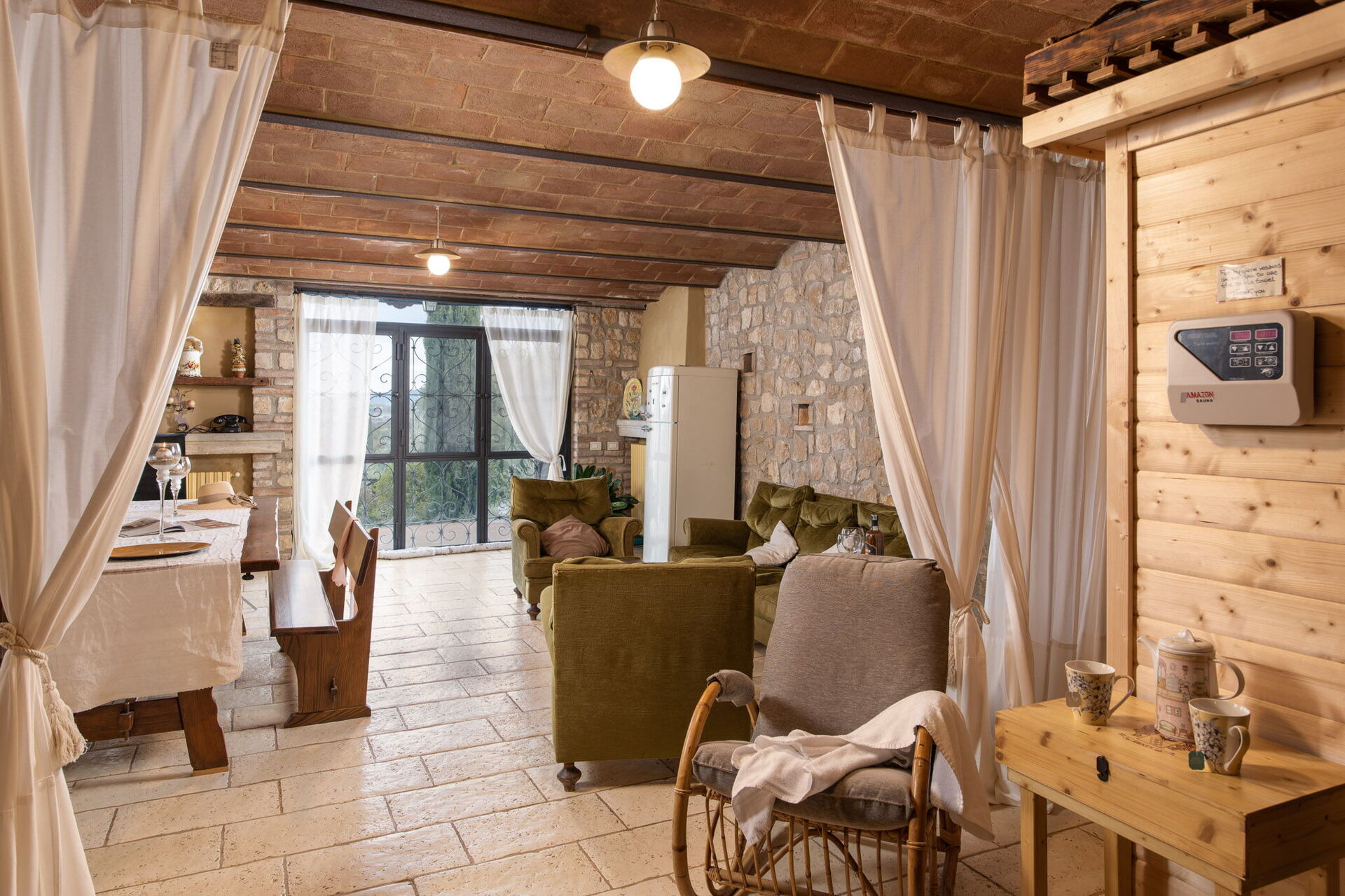 Cucina - soggiorno: cucina ben attrezzata, lavastoviglie, frigo, freezer, microonde, forno, tostapane, macchina da caffè (italiana), divano, poltrona, caminetto, internet WIFI, seggiolone, rilevatore di fumo, rilevatore di co2, uscita sul giardino, uscita sulla terrazza.