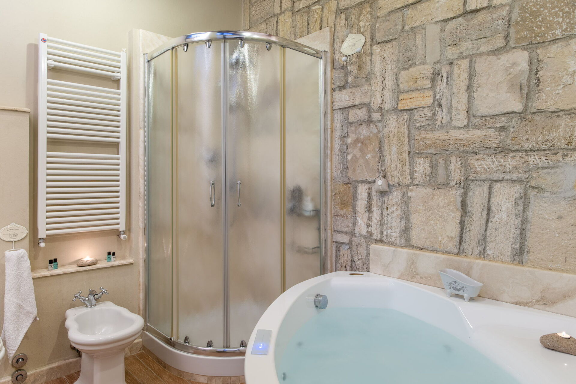 Camera da letto con bagno: letto matrimoniale (larghezza: 160m, lunghezza: 200m), internet WIFI, aria condizionata, poltrona, caminetto, vasca da bagno idromassaggio, lavandino doppio, bidet, doccia, asciugacapelli.