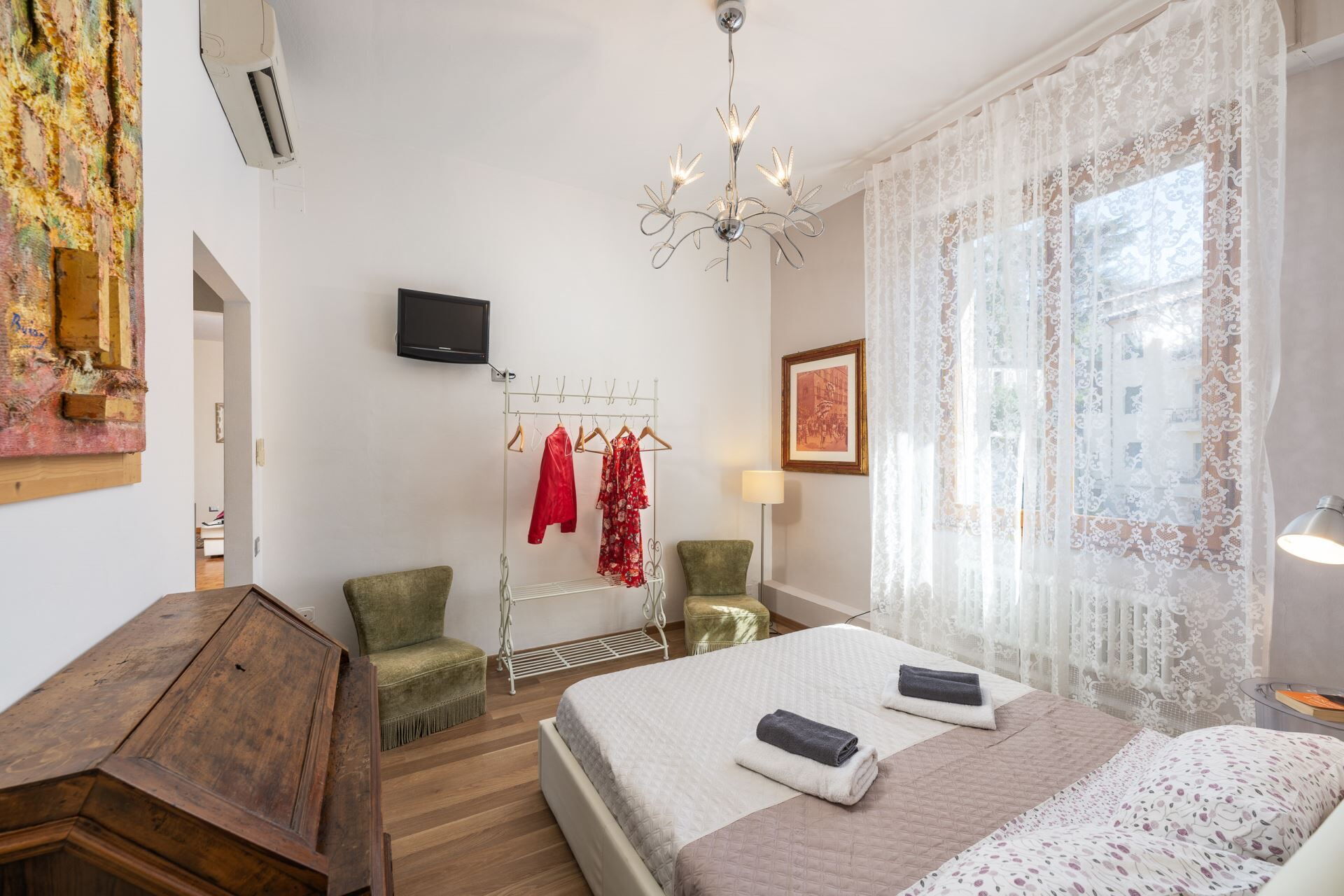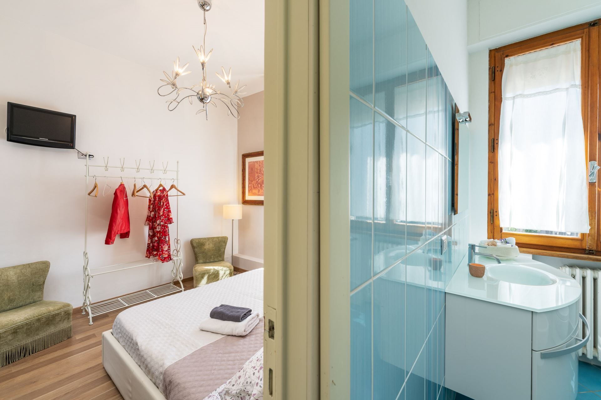 Camera da letto con bagno 2 (14 m2): letto matrimoniale (larghezza: 1.6m, lunghezza: 2m), internet WIFI, aria condizionata, due poltrone, scrivania, lavandino, wc, bidet, doccia, asciugacapelli, asciugatrice, lavatrice.