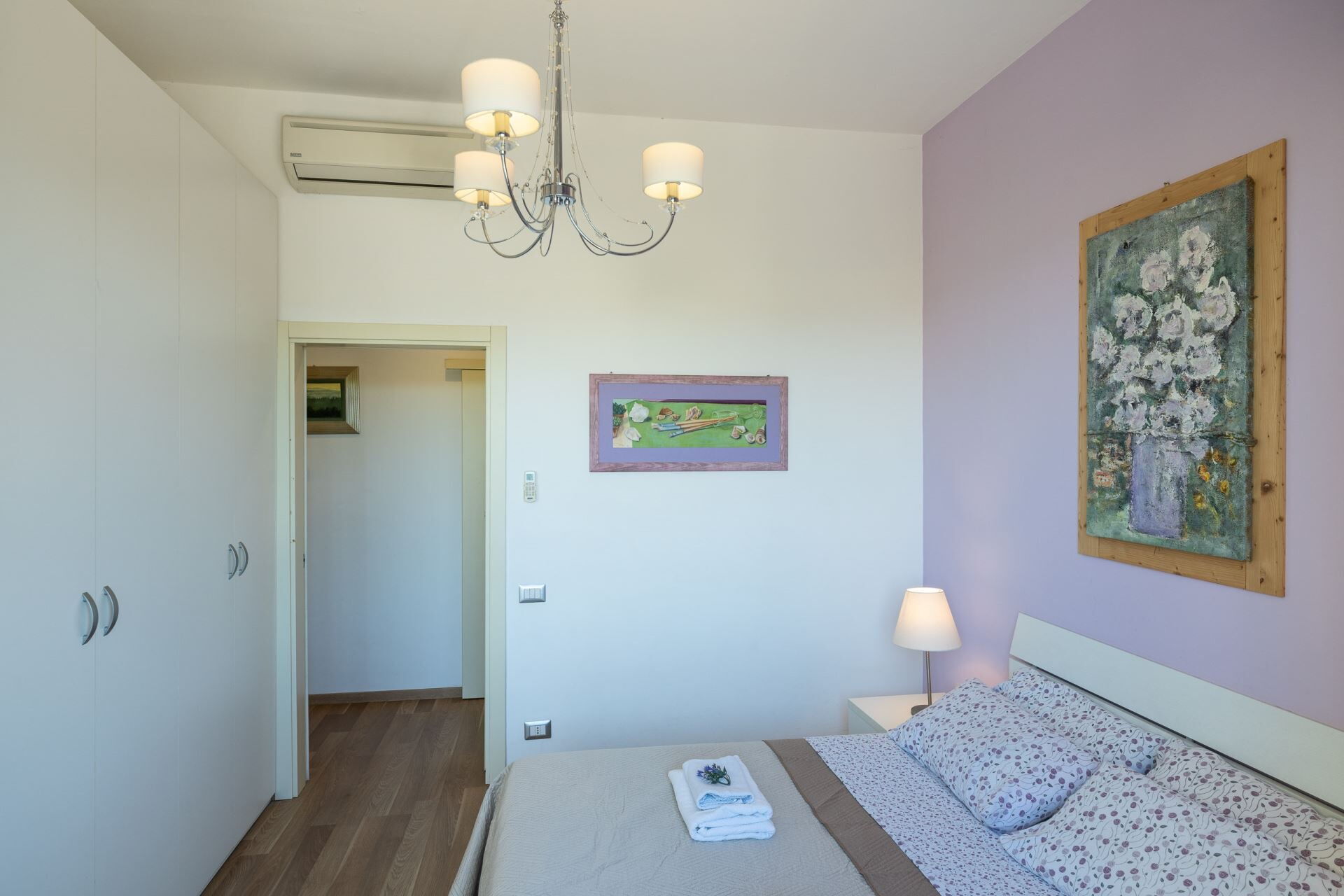 Camera da letto 2 (14 m2): letto matrimoniale (larghezza: 1.6m, lunghezza: 2m), aria condizionata, uscita sulla terrazza.