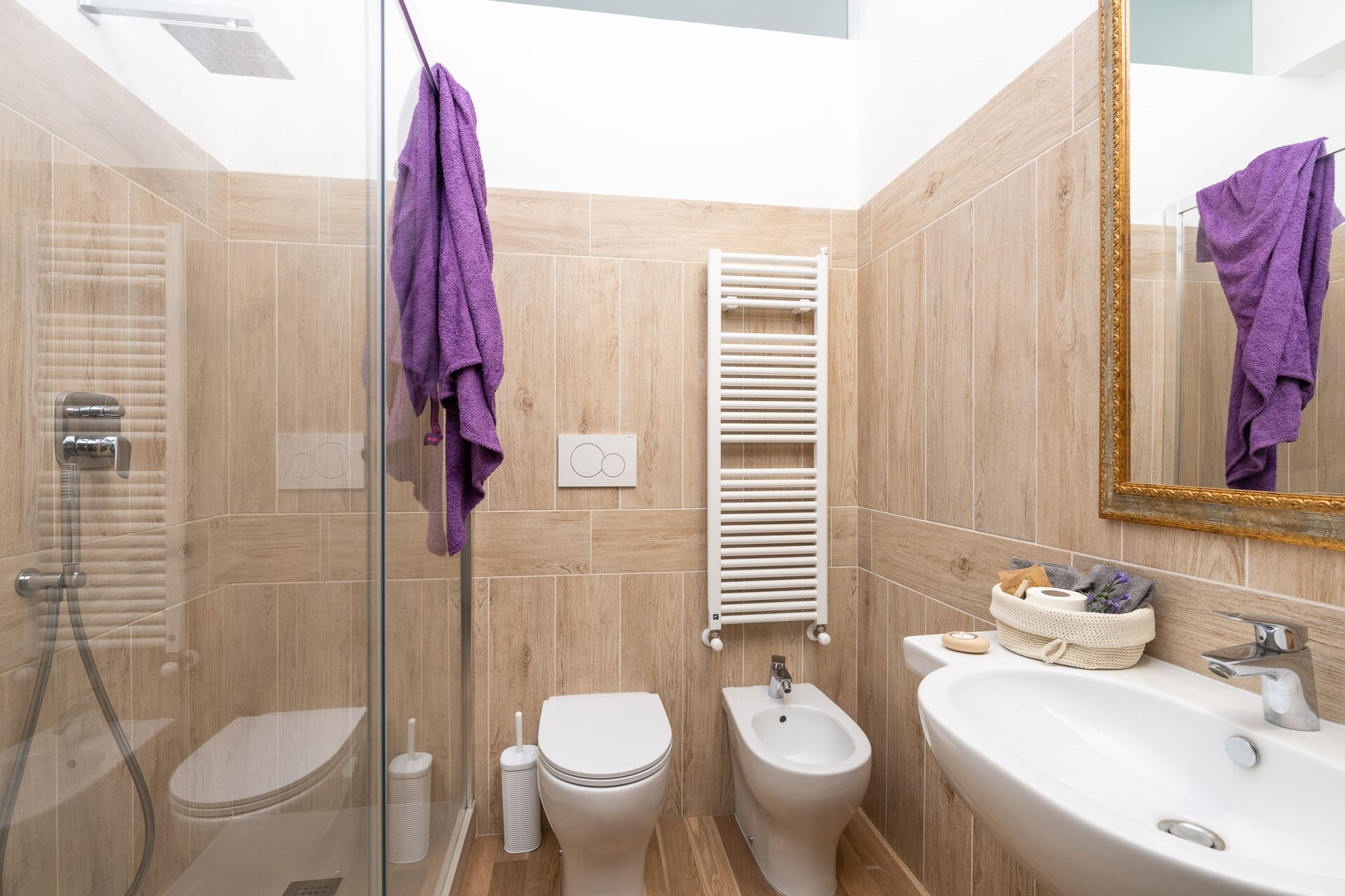 Camera da letto con bagno 1 (16 m2): letto matrimoniale (larghezza: 1.8m, lunghezza: 2m), internet WIFI, internet WIFI, aria condizionata, lavandino, wc, bidet, doccia, asciugacapelli, uscita sulla terrazza, uscita sulla veranda.