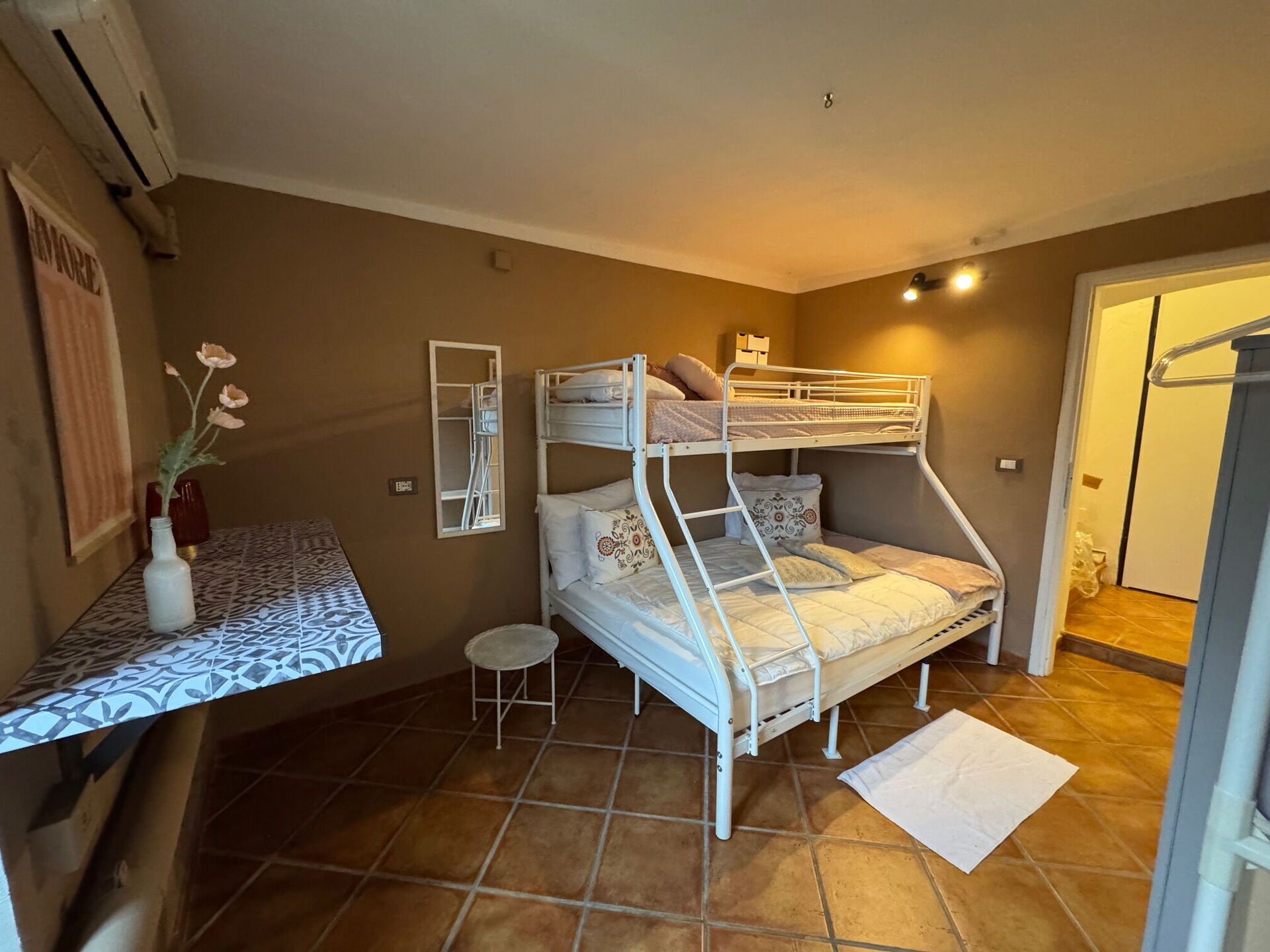 Camera da letto 2 (10 m2): letto a castello, ventilatore portatile.