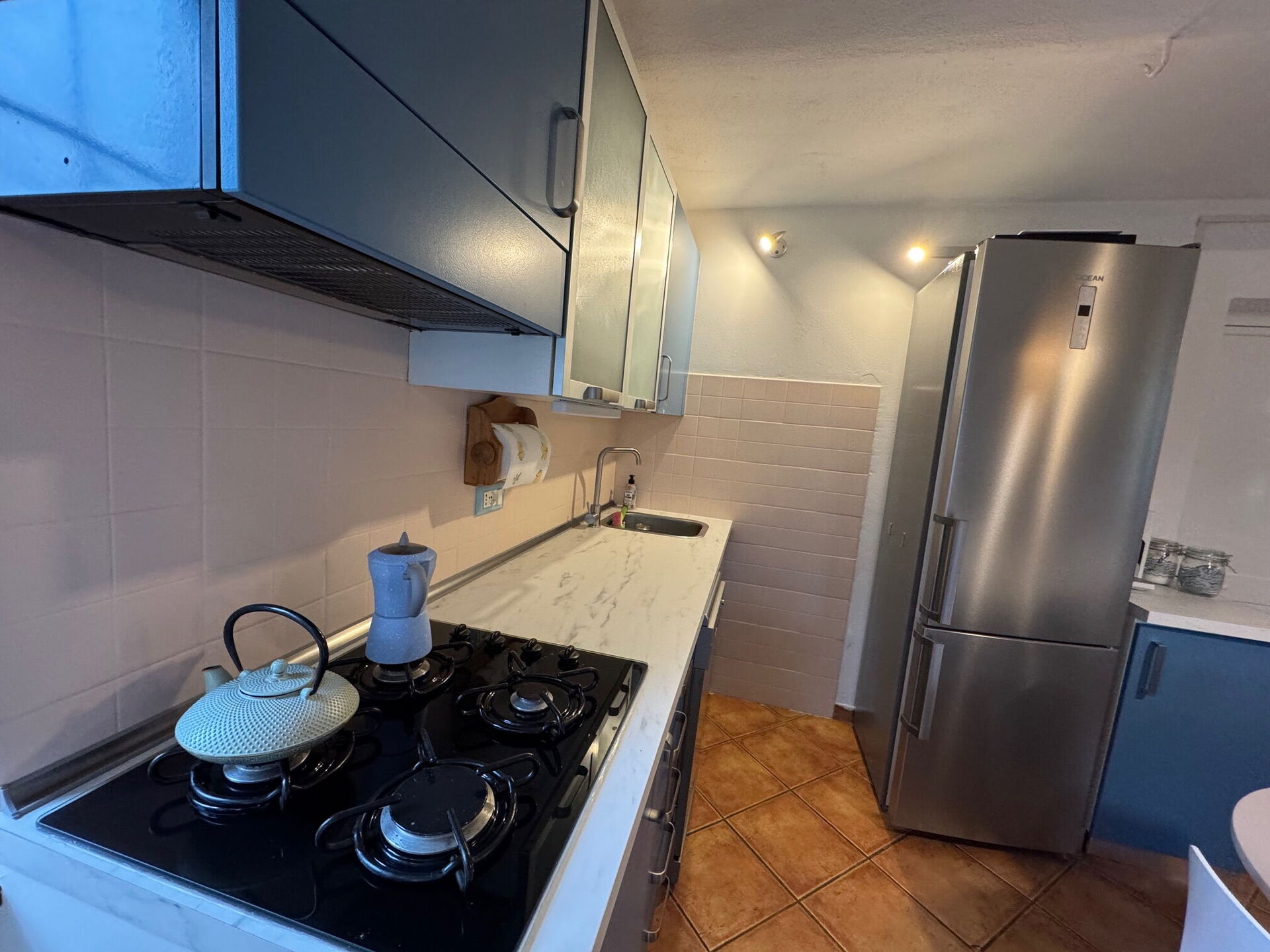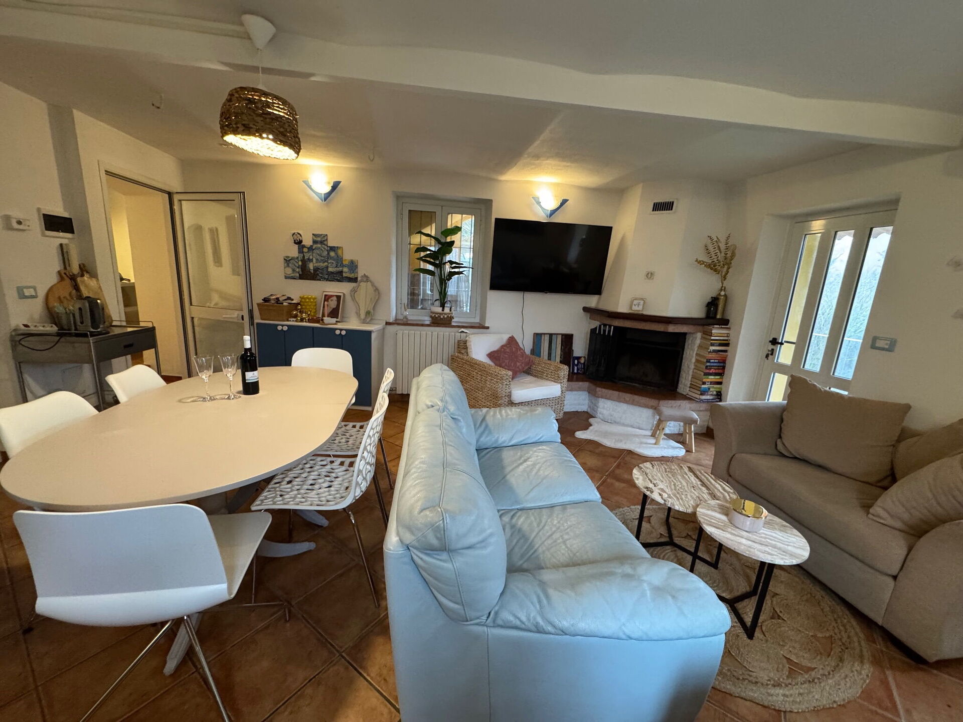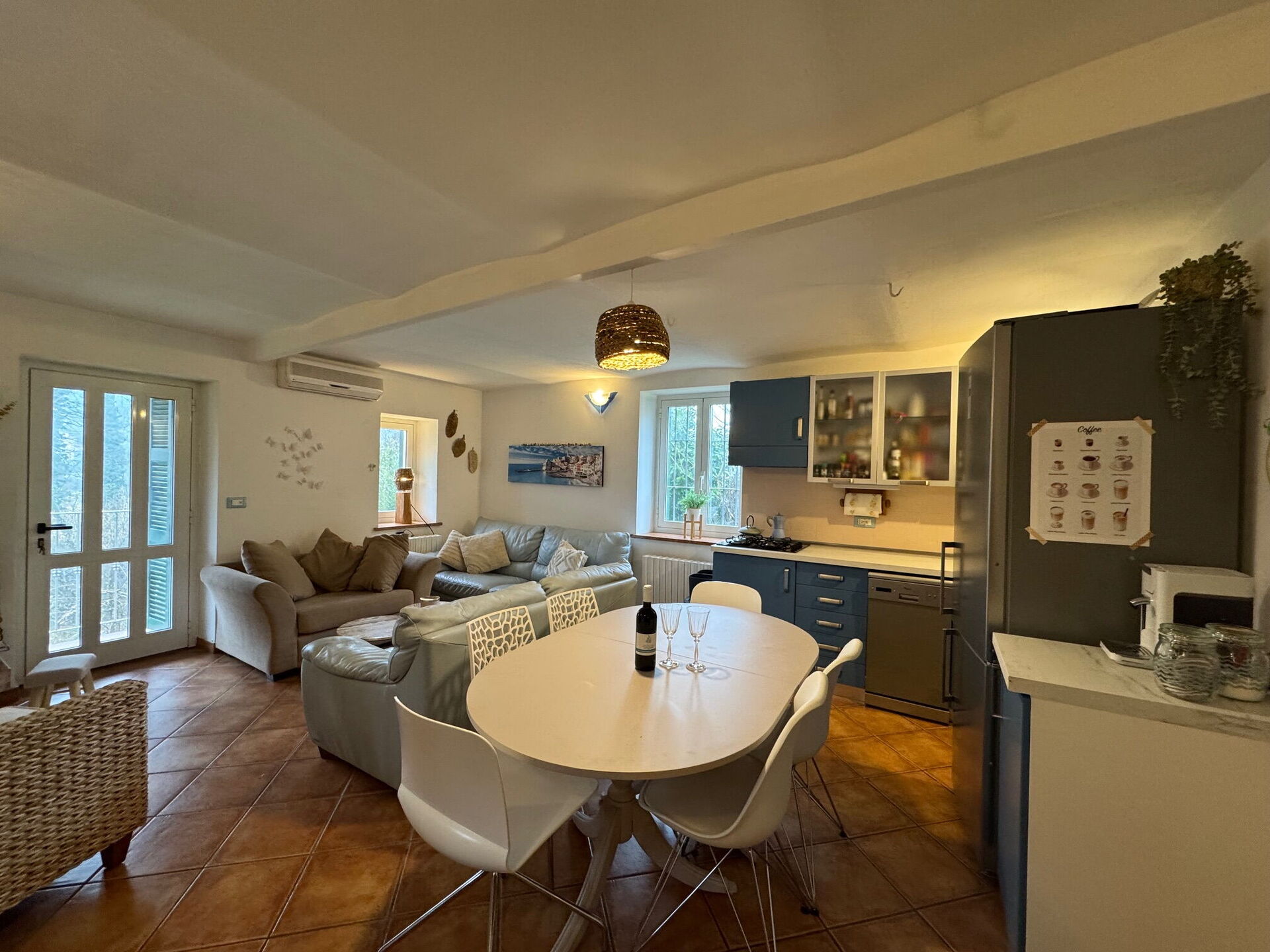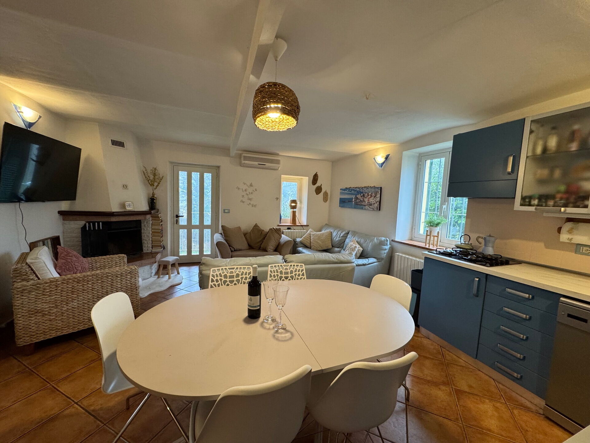 Cucina - soggiorno (18 m2): cucina ben attrezzata, tavolo da pranzo, lavastoviglie, frigo, freezer, piano cottura, forno, macchina da caffè (italiana), due divani, caminetto, internet WIFI, aria condizionata, uscita sul giardino, uscita sulla veranda.