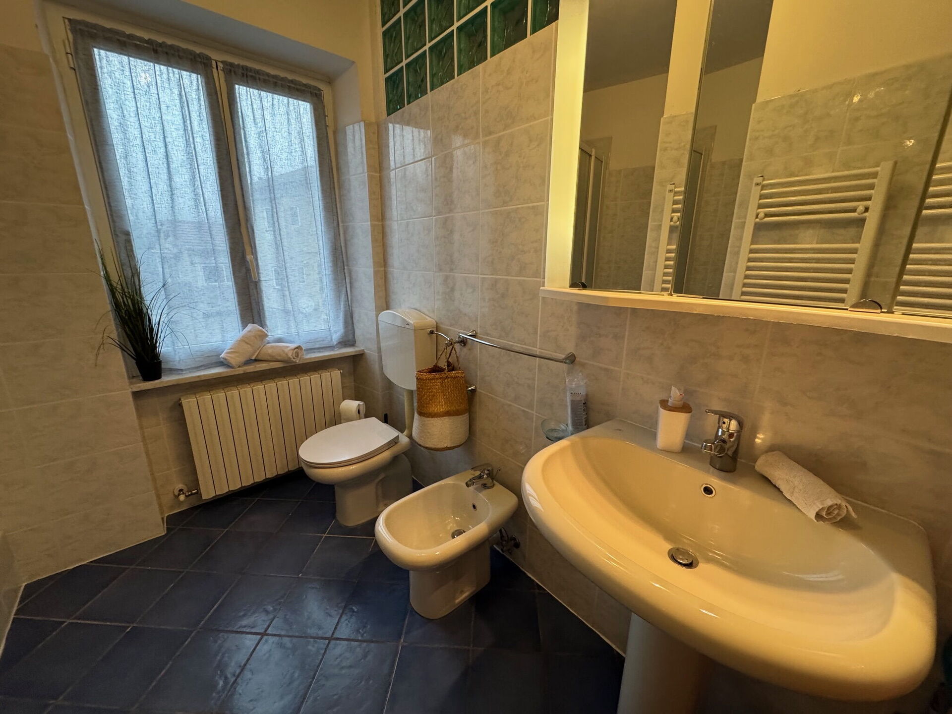 Bagno 1 (10 m2): lavandino, bidet, doccia, asciugacapelli, lavatrice.