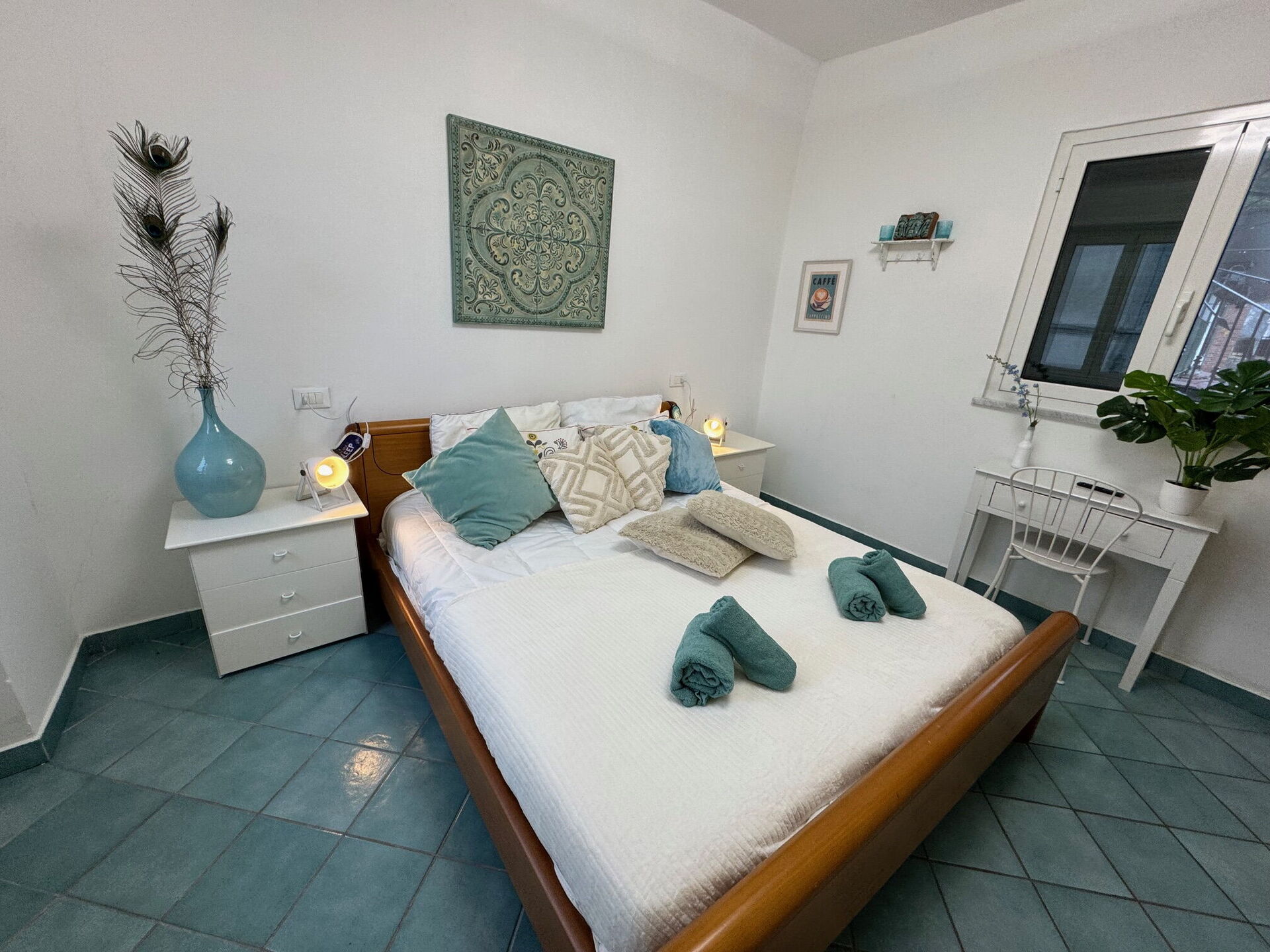 Camera da letto 3 (10 m2): letto matrimoniale, ventilatore a soffitto, scrivania.