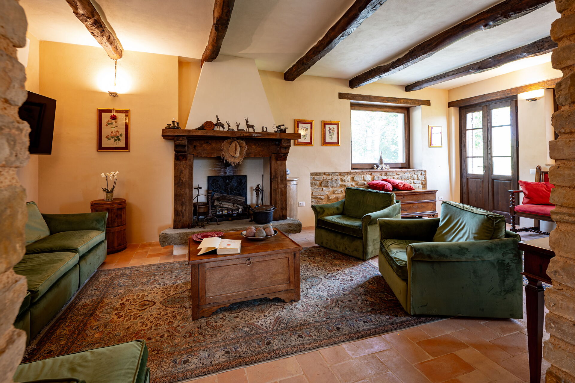 Soggiorno: due divani (persone: 7), due poltrone, caminetto, internet WIFI, aria condizionata, televisione, zanzariere, uscita sul giardino.