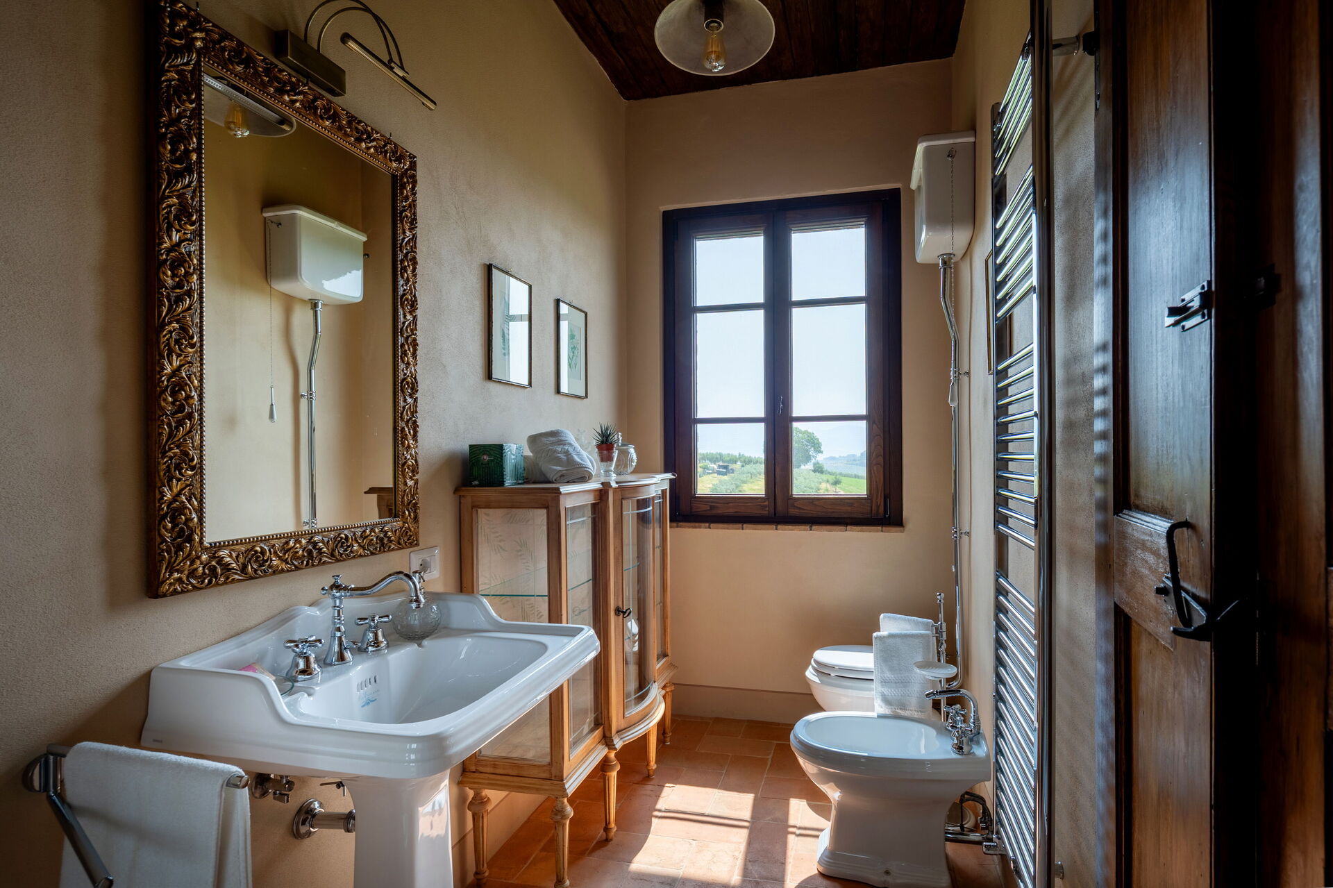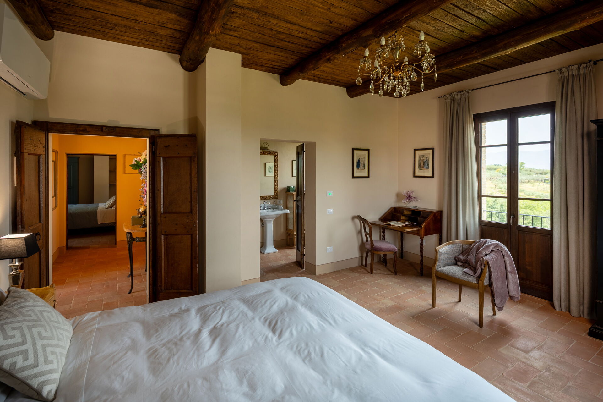 Camera da letto con bagno 2 (20 m2): letto king size (larghezza: 180m, lunghezza: 200m), internet WIFI, aria condizionata, zanzariere, poltrona, scrivania, lavandino, wc, bidet, doccia, asciugacapelli.