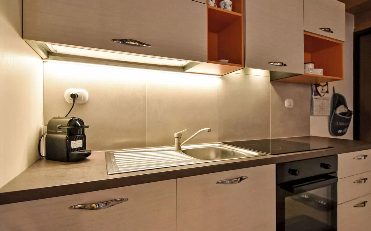 L'appartamento dispone di 3 camere e un'area totale di 68 metri quadrati. Si trova al 1° piano con una posizione rivolta a sud. La disposizione include un ampio soggiorno/sala da pranzo con tavolo da pranzo e TV, 1 camera matrimoniale e 1 camera con 1 letto singolo e 1 letto a castello 1 x 2. La cucina è attrezzata con forno, 4 piastre a induzione, tostapane, bollitore, microonde, macchina elettrica per il caffè e le capsule per la macchina del caffè (Nespresso) sono fornite gratuitamente.