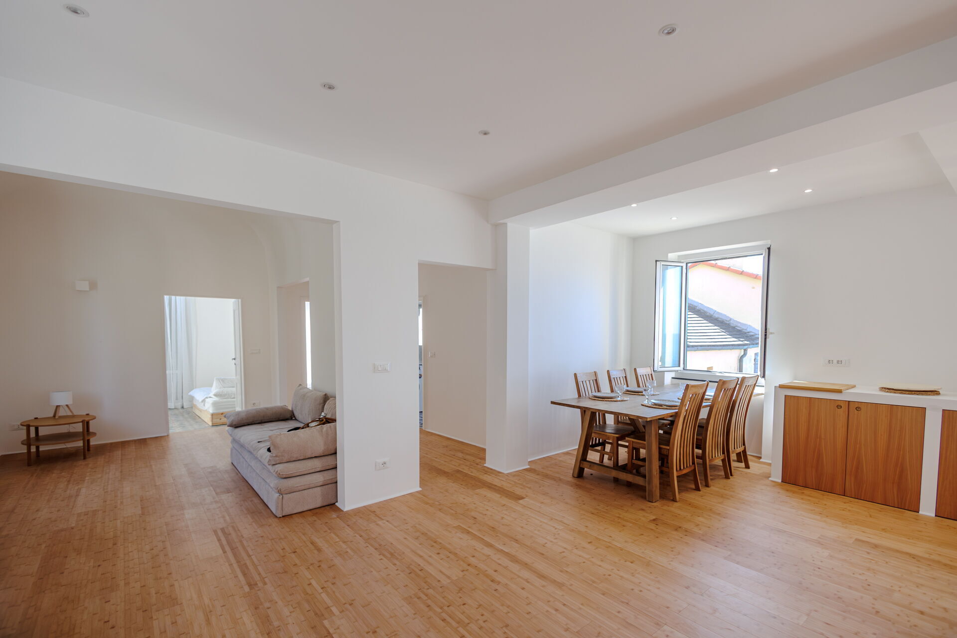 Cucina - soggiorno: cucina ben attrezzata, tavolo da pranzo, lavastoviglie, frigo, freezer, piano cottura, forno, macchina da caffè (italiana), divano letto matrimoniale, internet WIFI, aria condizionata, televisione, uscita sul balcone.