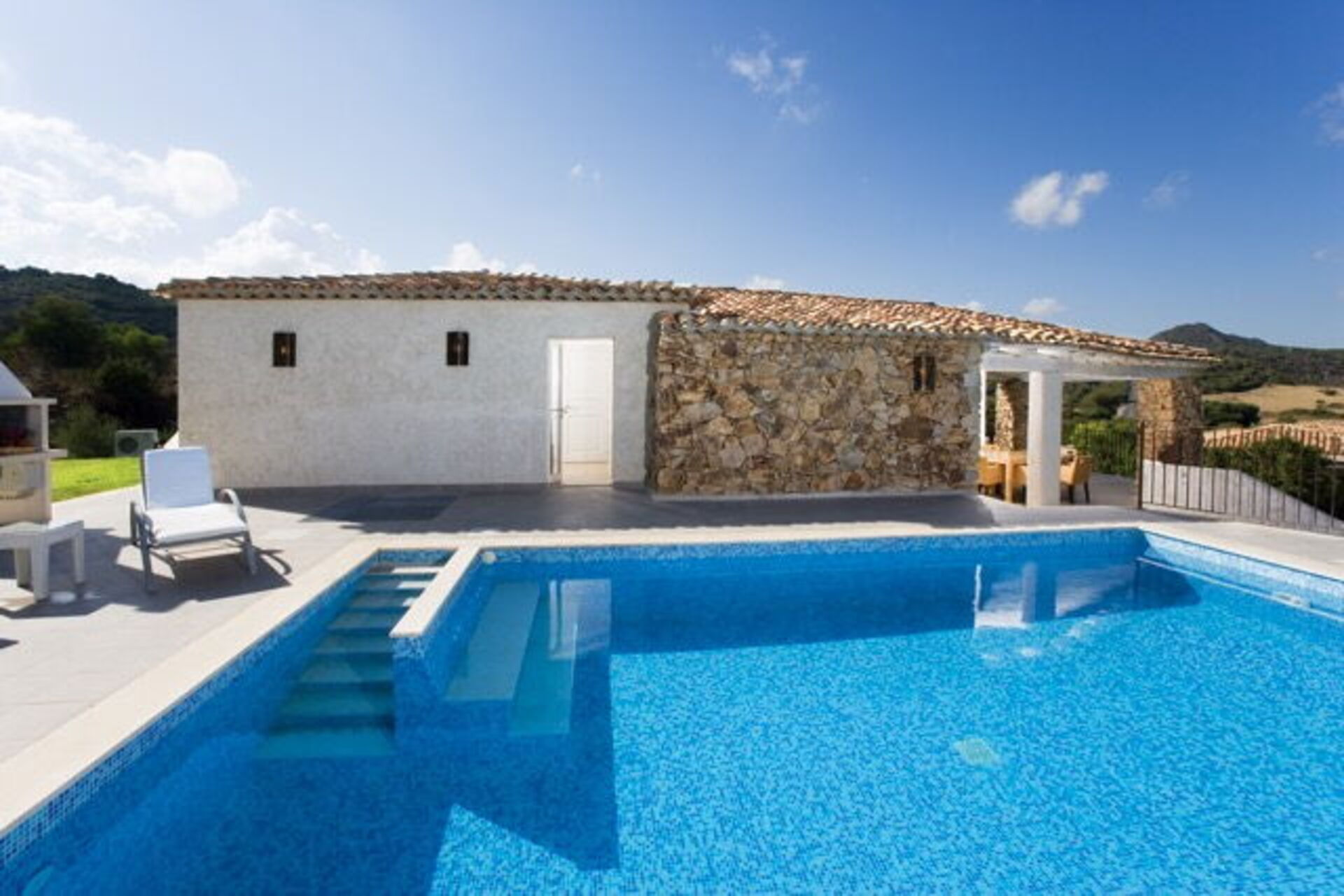 L'esterno della villa presenta un grande patio con un vasto giardino e piscina privata.