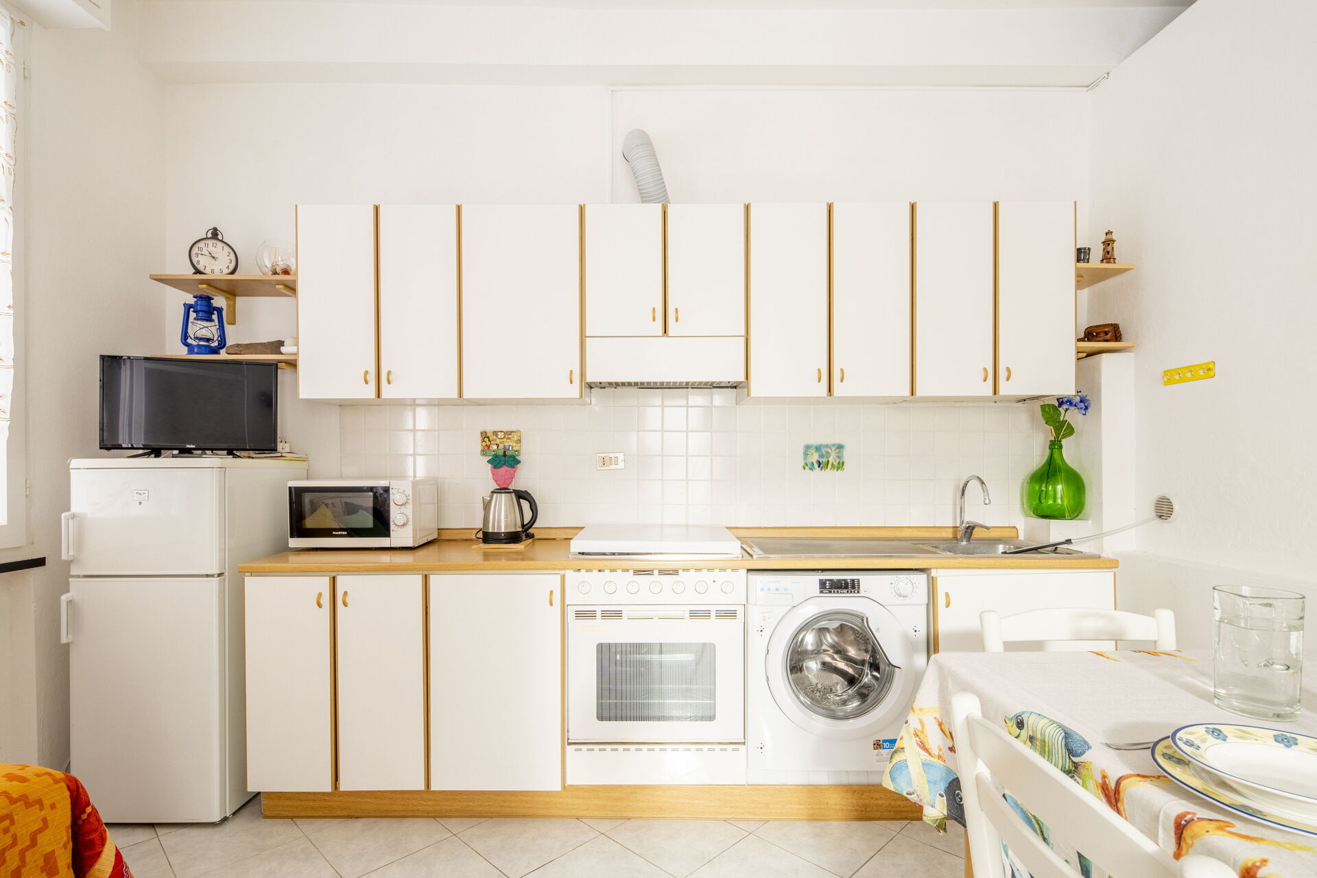 Cucina - soggiorno: cucina ben attrezzata, tavolo da pranzo, lavastoviglie, frigo, freezer, microonde, piano cottura, forno, macchina da caffè (italiana), lavatrice, due divani letto, internet WIFI, ventilatore a soffitto, rilevatore di fumo.