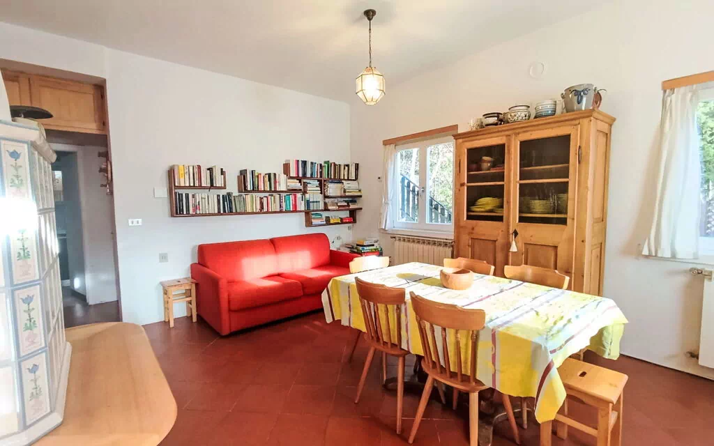 Villa Pia è una casa a schiera di 3 locali che si estende su 80 m2, situata al piano terra rialzato. La proprietà vacanze presenta arredi semplici e pratici in tutti gli ambienti. All'ingresso, troverete un corridoio di passaggio che conduce ai vari spazi abitativi. Il soggiorno e la sala da pranzo sono dotati di un divano letto e una stufa scandinava in legno che ha solo scopo decorativo, insieme a un televisore per il vostro intrattenimento. Un ripostiglio dedicato offre un comodo spazio per i bagagli. Le sistemazioni per la notte includono una camera matrimoniale e una stanza aggiuntiva arredata con un letto a castello per due persone. Troverete anche un'area salotto separata con il proprio televisore. La cucina a vista è dotata di forno, fornello a gas e microonde, e include un tavolo da pranzo per i vostri pasti. La proprietà include un bagno con doccia, bidet e WC. La casa a schiera offre vista sulle montagne.