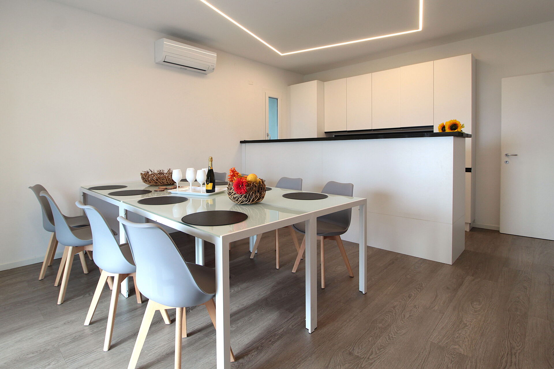 Cucina - soggiorno: cucina ben attrezzata, tavolo da pranzo, lavastoviglie, frigo, freezer, piano cottura, forno, macchina da caffè (italiana), internet WIFI, aria condizionata, uscita sul giardino.