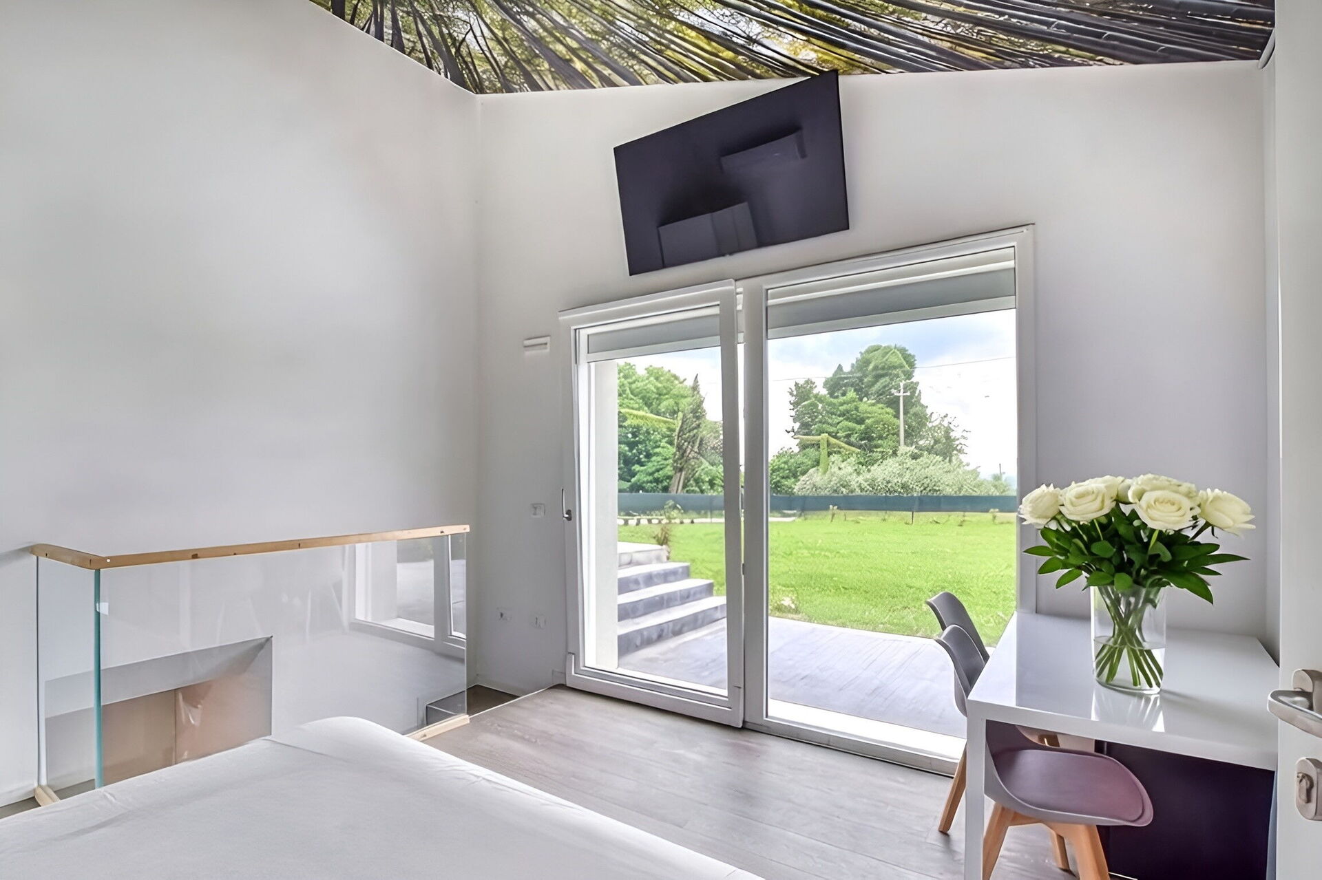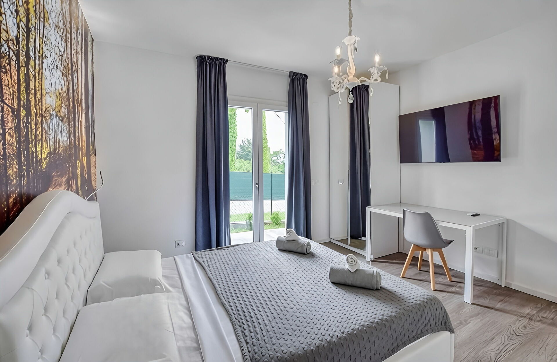 Camera da letto con bagno 1: letto matrimoniale, internet WIFI, aria condizionata, televisione, lavandino, wc, bidet, vasca da bagno, doccia, asciugacapelli, uscita sul giardino.