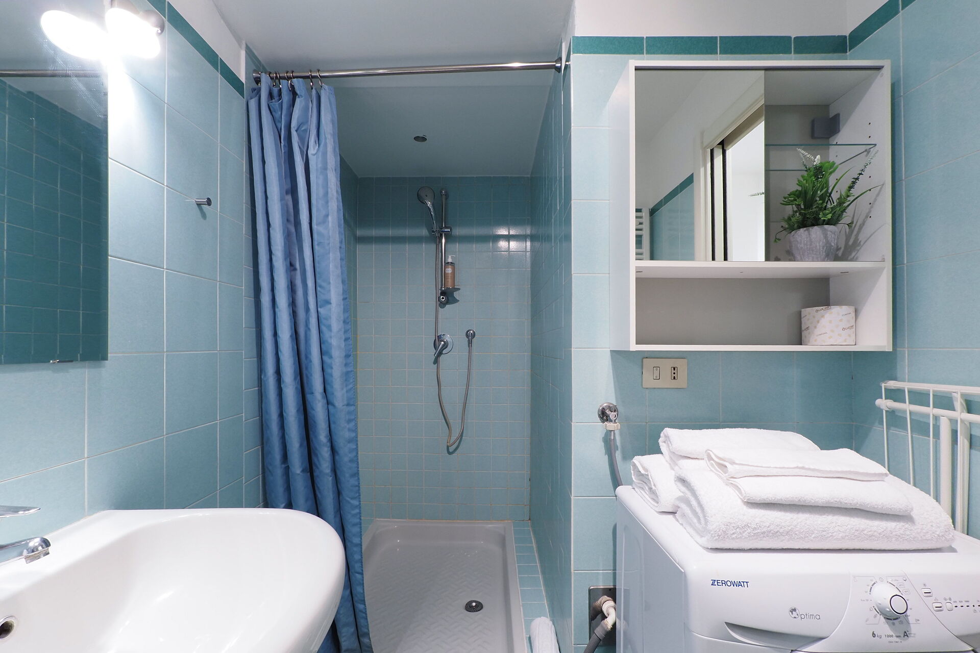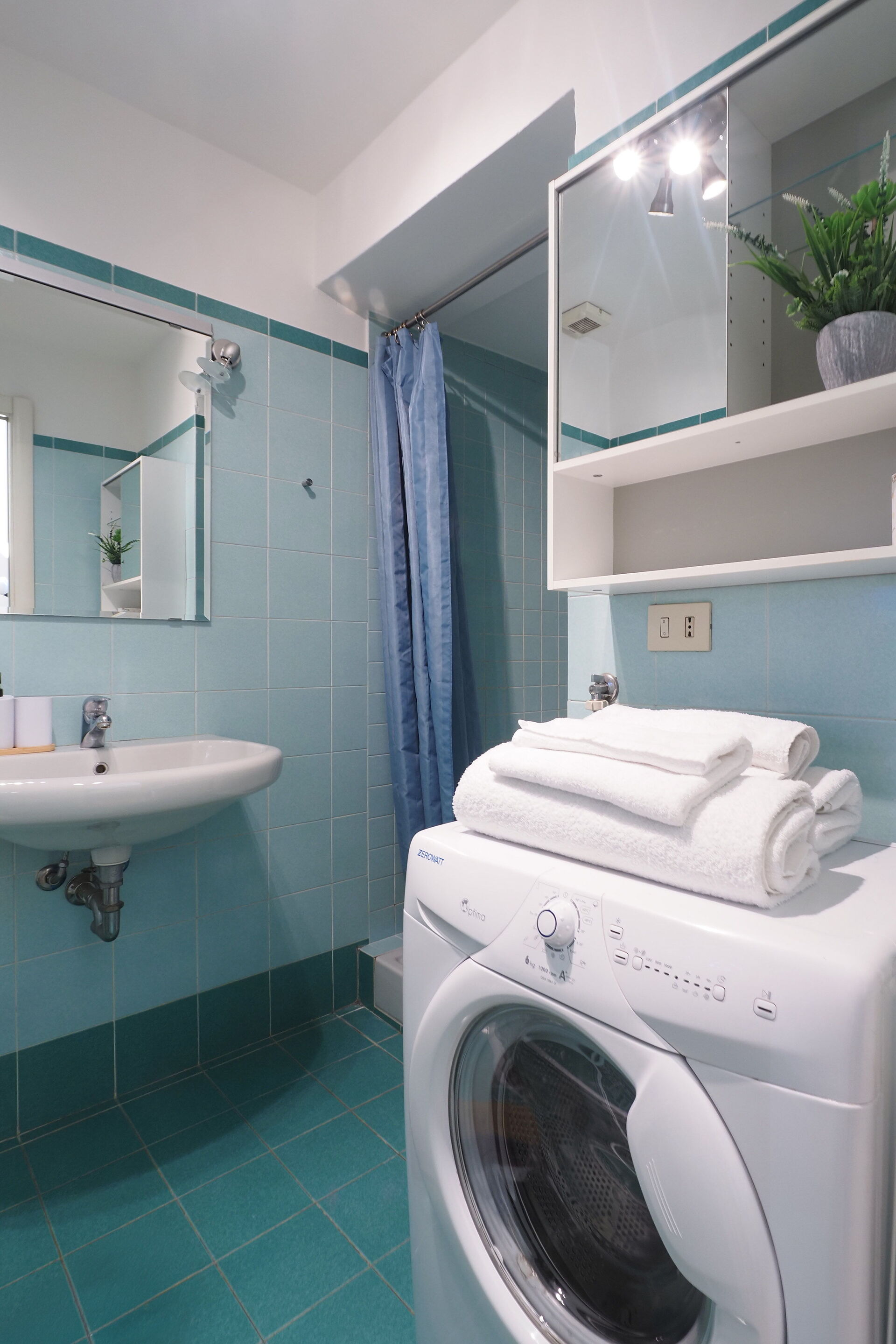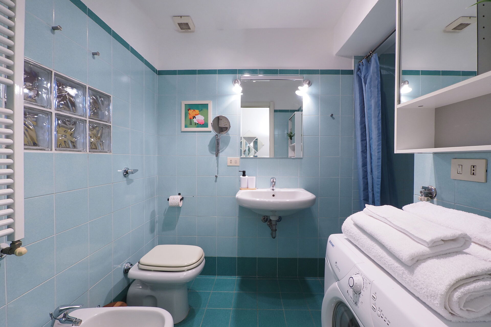 Bagno: lavandino, wc, bidet, doccia, asciugacapelli, lavatrice.