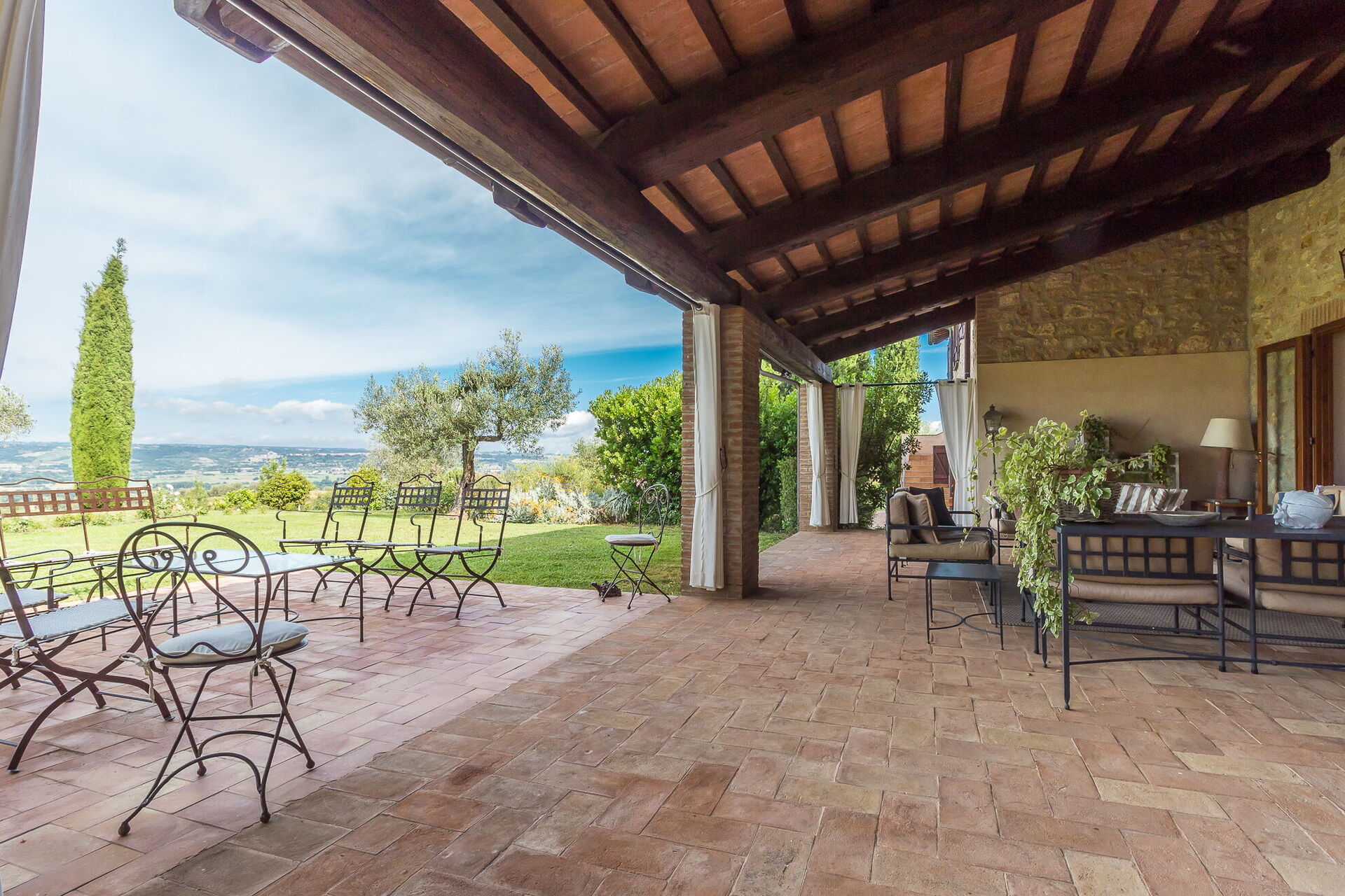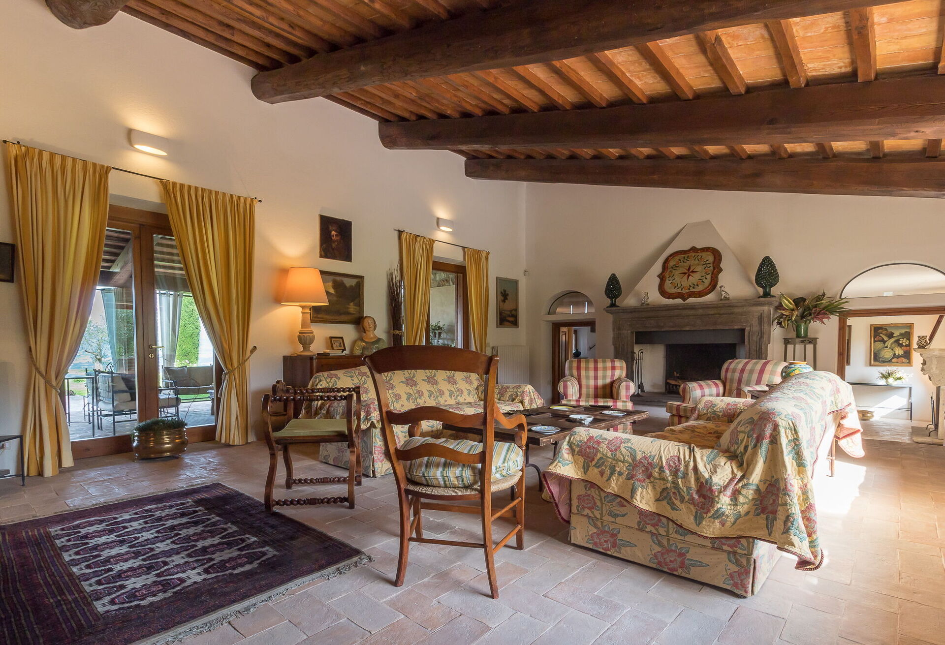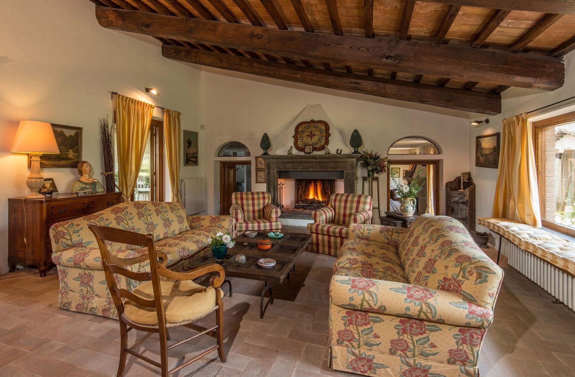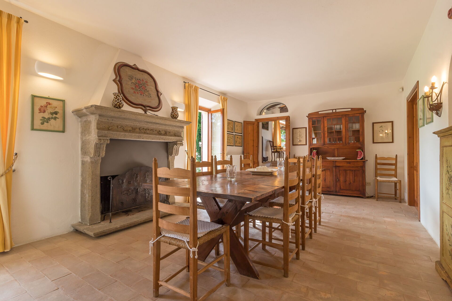 Troverete questa ampia casa vacanze progettata con cura per ospitare fino a 14 persone in 7 camere da letto e 7 bagni, distribuiti tra la casa principale e una dependance. La casa principale presenta un ingresso al piano terra che vi accoglie in un primo soggiorno arredato con un comodo divano Chesterfield e un paio di poltrone, offrendo posti a sedere per un massimo di 7 persone. Adiacente a questo spazio, scoprirete un ampio soggiorno con camino funzionante e comodi divani e poltrone che possono ospitare fino a 10 o 12 persone, con doppie porte che si aprono sulla loggia coperta dove potrete rilassarvi e godervi la vista. Accanto al soggiorno, un'ampia sala da pranzo con camino funzionante può ospitare fino a 14 persone. Il piano terra comprende anche una grande cucina con zona pranzo separata, camino funzionante e un tavolo per 8 persone, con doppie porte che si aprono su un patio da pranzo e un secondo soggiorno esterno. Un bagno per gli ospiti serve questo livello. Completa il piano terra una camera matrimoniale climatizzata con letto king size, salottino separato e cabina armadio, accompagnata da un bagno privato con vasca con doccetta e doccia separata. Il primo piano può ospitare fino a 8 persone e offre splendide viste sulle dolci colline e sulla campagna. Troverete una camera padronale con letto king size, camino funzionante e cabina armadio, dotata di bagno privato con doccia e doppio lavandino. Tre camere da letto aggiuntive su questo piano offrono sistemazioni flessibili con letti singoli che possono essere uniti per formare matrimoniali. Una di queste camere include una cabina armadio e i loro bagni privati dispongono di docce o vasca con doccetta. La dependance, disponibile a un costo aggiuntivo, offre 2 camere da letto climatizzate aggiuntive. Una camera doppia o matrimoniale con letti singoli che possono essere uniti ha doppie porte che conducono al giardino e un bagno privato con doccia. Una camera matrimoniale con letto queen size ha una porta che conduce al giardino e un bagno privato con doccia.