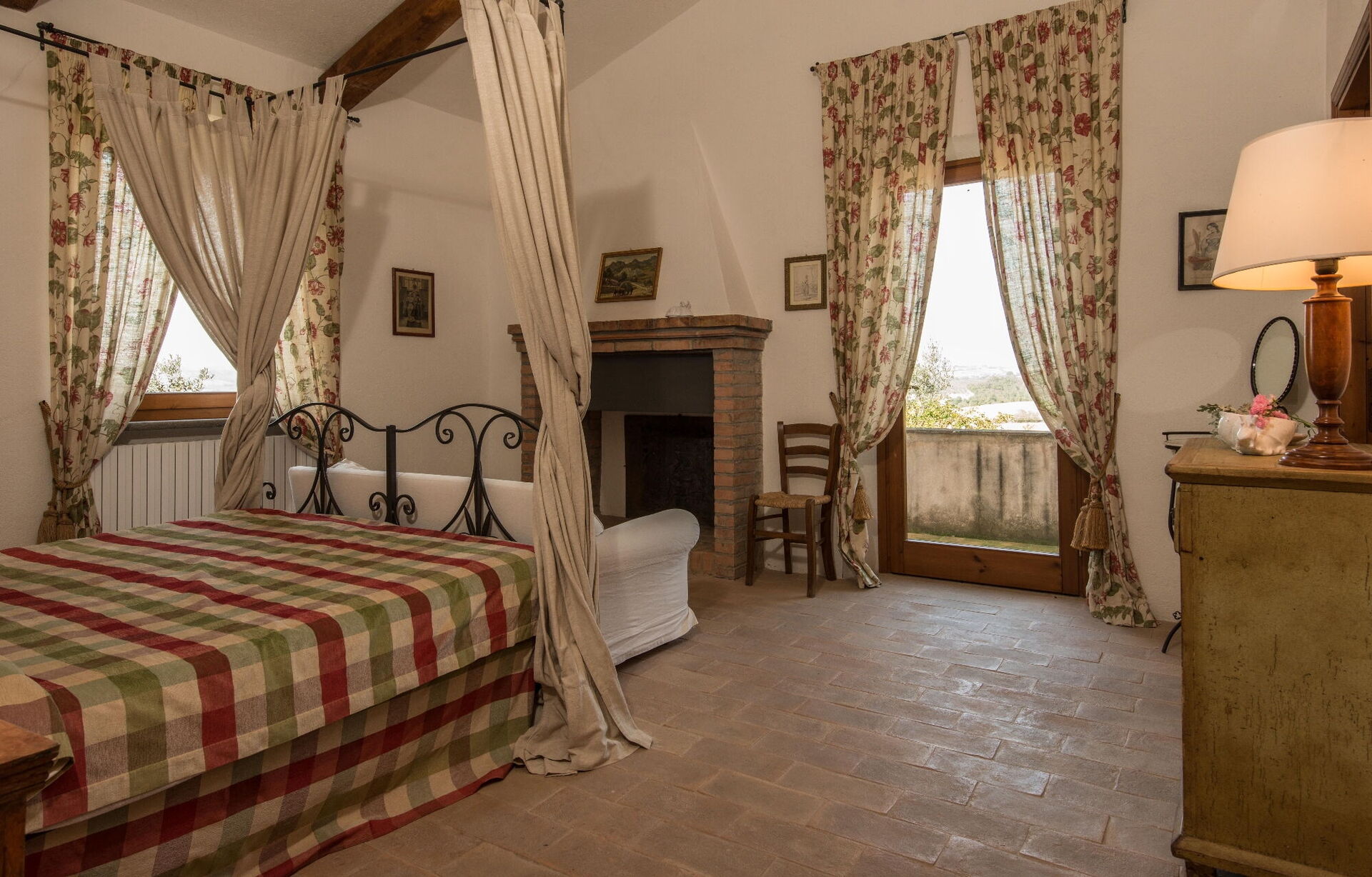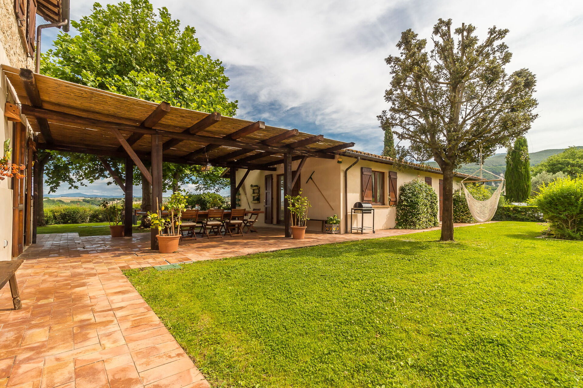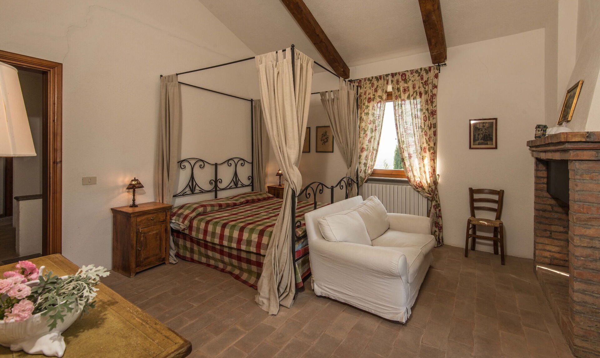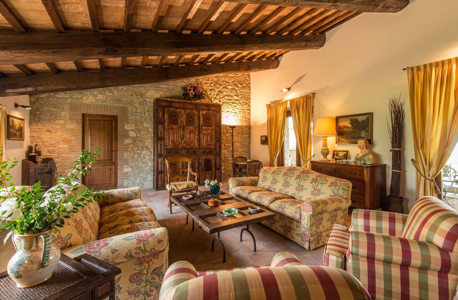 Troverete questa ampia casa vacanze progettata con cura per ospitare fino a 14 persone in 7 camere da letto e 7 bagni, distribuiti tra la casa principale e una dependance. La casa principale presenta un ingresso al piano terra che vi accoglie in un primo soggiorno arredato con un comodo divano Chesterfield e un paio di poltrone, offrendo posti a sedere per un massimo di 7 persone. Adiacente a questo spazio, scoprirete un ampio soggiorno con camino funzionante e comodi divani e poltrone che possono ospitare fino a 10 o 12 persone, con doppie porte che si aprono sulla loggia coperta dove potrete rilassarvi e godervi la vista. Accanto al soggiorno, un'ampia sala da pranzo con camino funzionante può ospitare fino a 14 persone. Il piano terra comprende anche una grande cucina con zona pranzo separata, camino funzionante e un tavolo per 8 persone, con doppie porte che si aprono su un patio da pranzo e un secondo soggiorno esterno. Un bagno per gli ospiti serve questo livello. Completa il piano terra una camera matrimoniale climatizzata con letto king size, salottino separato e cabina armadio, accompagnata da un bagno privato con vasca con doccetta e doccia separata. Il primo piano può ospitare fino a 8 persone e offre splendide viste sulle dolci colline e sulla campagna. Troverete una camera padronale con letto king size, camino funzionante e cabina armadio, dotata di bagno privato con doccia e doppio lavandino. Tre camere da letto aggiuntive su questo piano offrono sistemazioni flessibili con letti singoli che possono essere uniti per formare matrimoniali. Una di queste camere include una cabina armadio e i loro bagni privati dispongono di docce o vasca con doccetta. La dependance, disponibile a un costo aggiuntivo, offre 2 camere da letto climatizzate aggiuntive. Una camera doppia o matrimoniale con letti singoli che possono essere uniti ha doppie porte che conducono al giardino e un bagno privato con doccia. Una camera matrimoniale con letto queen size ha una porta che conduce al giardino e un bagno privato con doccia.