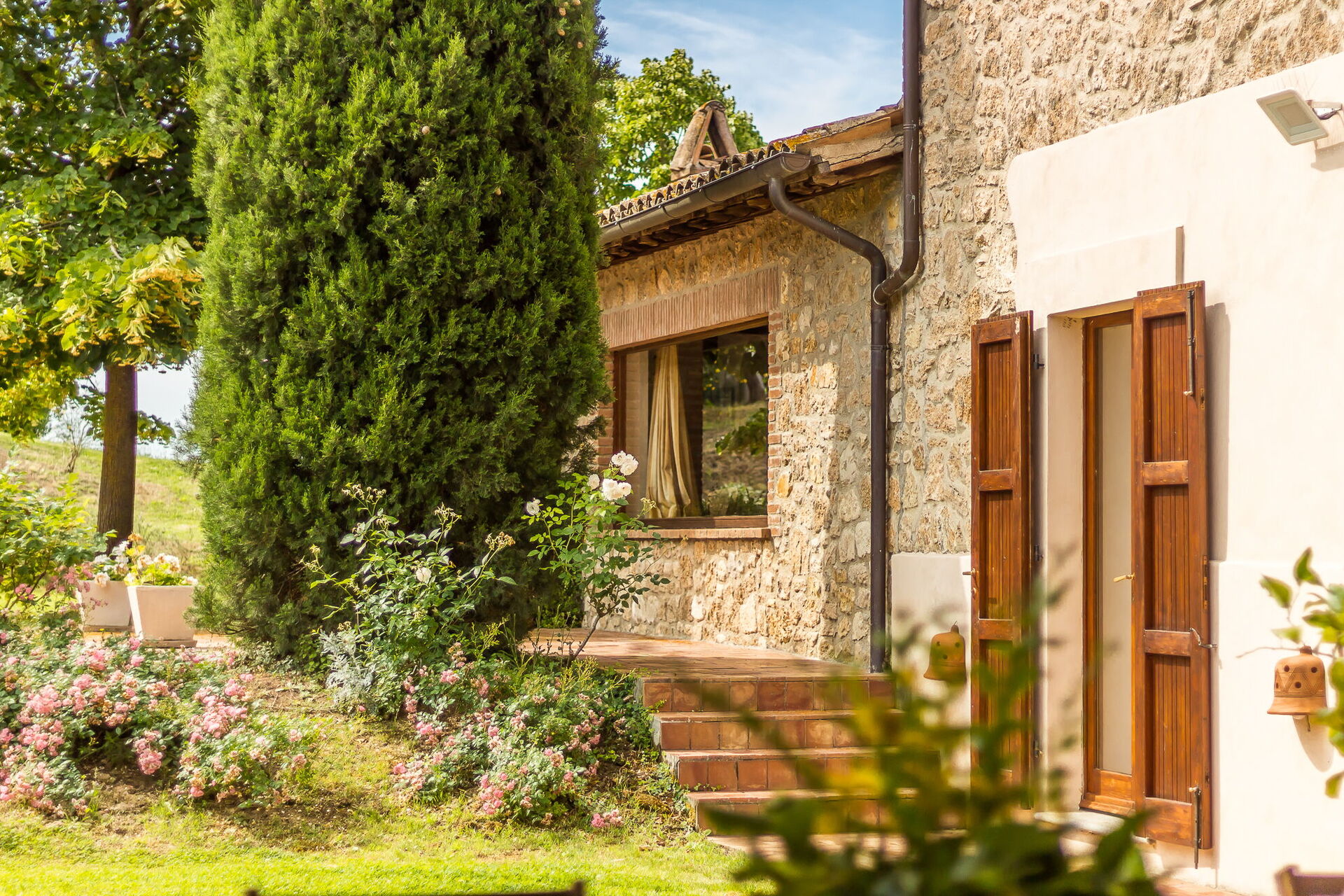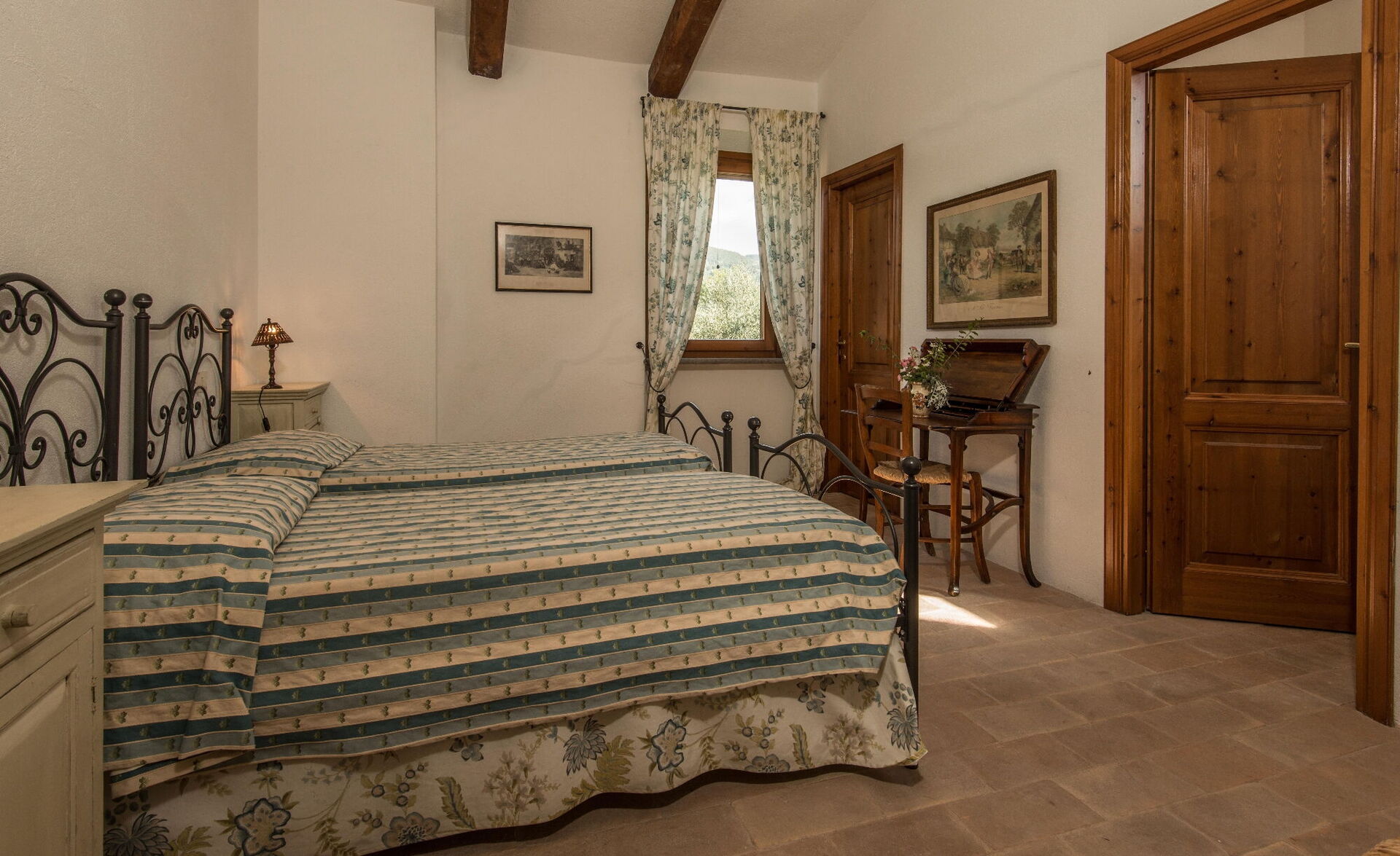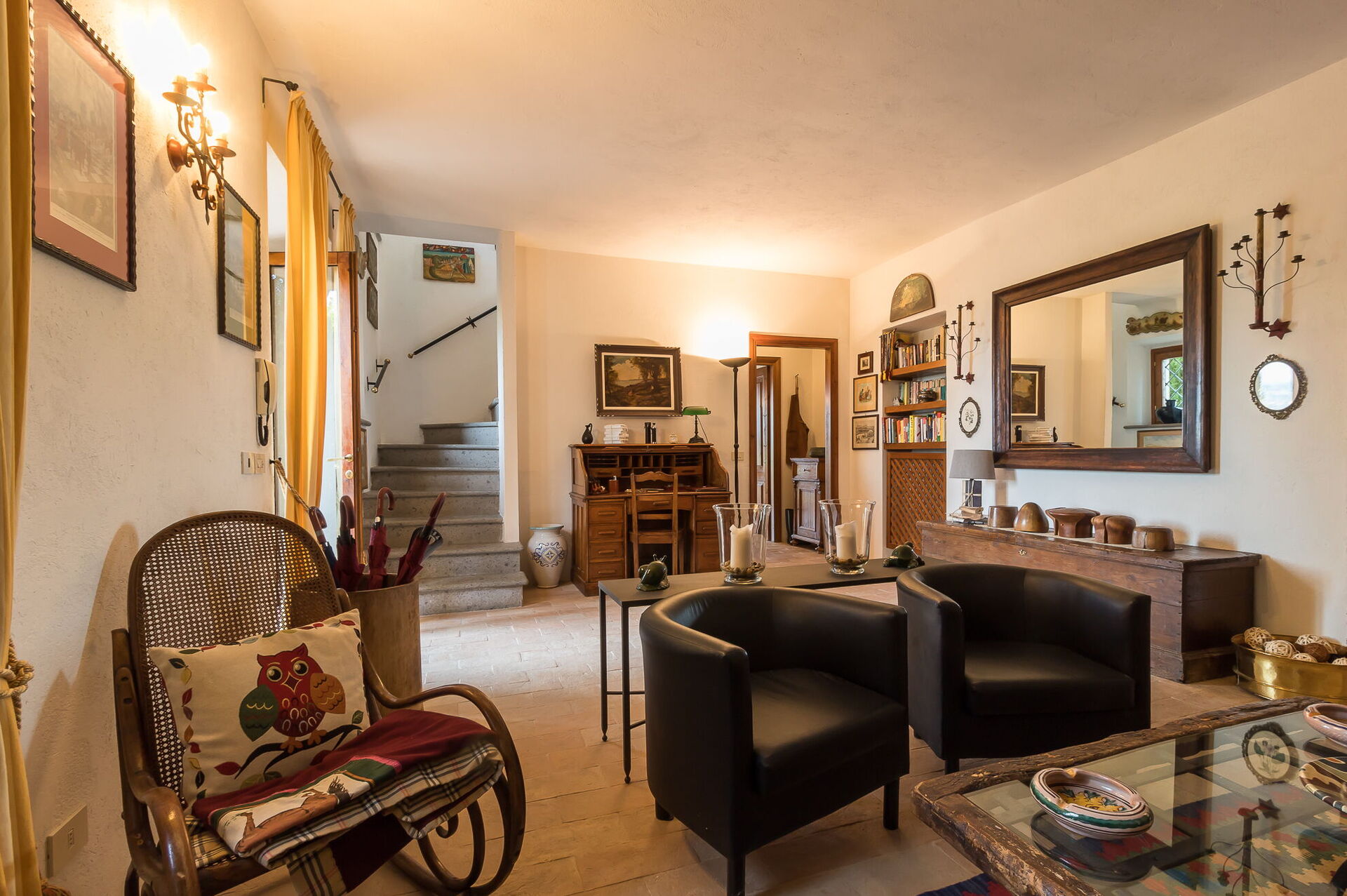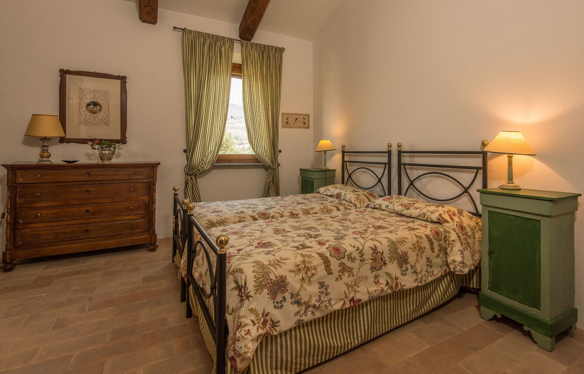 Troverete questa ampia casa vacanze progettata con cura per ospitare fino a 14 persone in 7 camere da letto e 7 bagni, distribuiti tra la casa principale e una dependance. La casa principale presenta un ingresso al piano terra che vi accoglie in un primo soggiorno arredato con un comodo divano Chesterfield e un paio di poltrone, offrendo posti a sedere per un massimo di 7 persone. Adiacente a questo spazio, scoprirete un ampio soggiorno con camino funzionante e comodi divani e poltrone che possono ospitare fino a 10 o 12 persone, con doppie porte che si aprono sulla loggia coperta dove potrete rilassarvi e godervi la vista. Accanto al soggiorno, un'ampia sala da pranzo con camino funzionante può ospitare fino a 14 persone. Il piano terra comprende anche una grande cucina con zona pranzo separata, camino funzionante e un tavolo per 8 persone, con doppie porte che si aprono su un patio da pranzo e un secondo soggiorno esterno. Un bagno per gli ospiti serve questo livello. Completa il piano terra una camera matrimoniale climatizzata con letto king size, salottino separato e cabina armadio, accompagnata da un bagno privato con vasca con doccetta e doccia separata. Il primo piano può ospitare fino a 8 persone e offre splendide viste sulle dolci colline e sulla campagna. Troverete una camera padronale con letto king size, camino funzionante e cabina armadio, dotata di bagno privato con doccia e doppio lavandino. Tre camere da letto aggiuntive su questo piano offrono sistemazioni flessibili con letti singoli che possono essere uniti per formare matrimoniali. Una di queste camere include una cabina armadio e i loro bagni privati dispongono di docce o vasca con doccetta. La dependance, disponibile a un costo aggiuntivo, offre 2 camere da letto climatizzate aggiuntive. Una camera doppia o matrimoniale con letti singoli che possono essere uniti ha doppie porte che conducono al giardino e un bagno privato con doccia. Una camera matrimoniale con letto queen size ha una porta che conduce al giardino e un bagno privato con doccia.