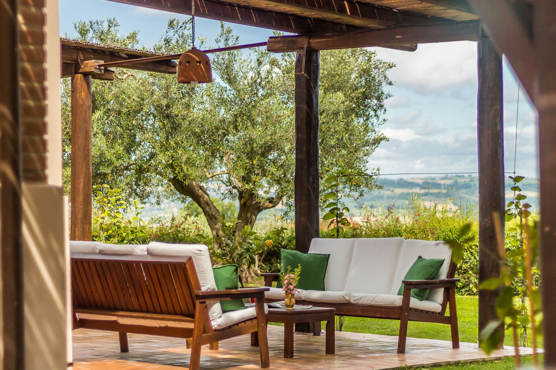 Summer living room with comfortable sofas and armchairs. Stunning view over the countryside!