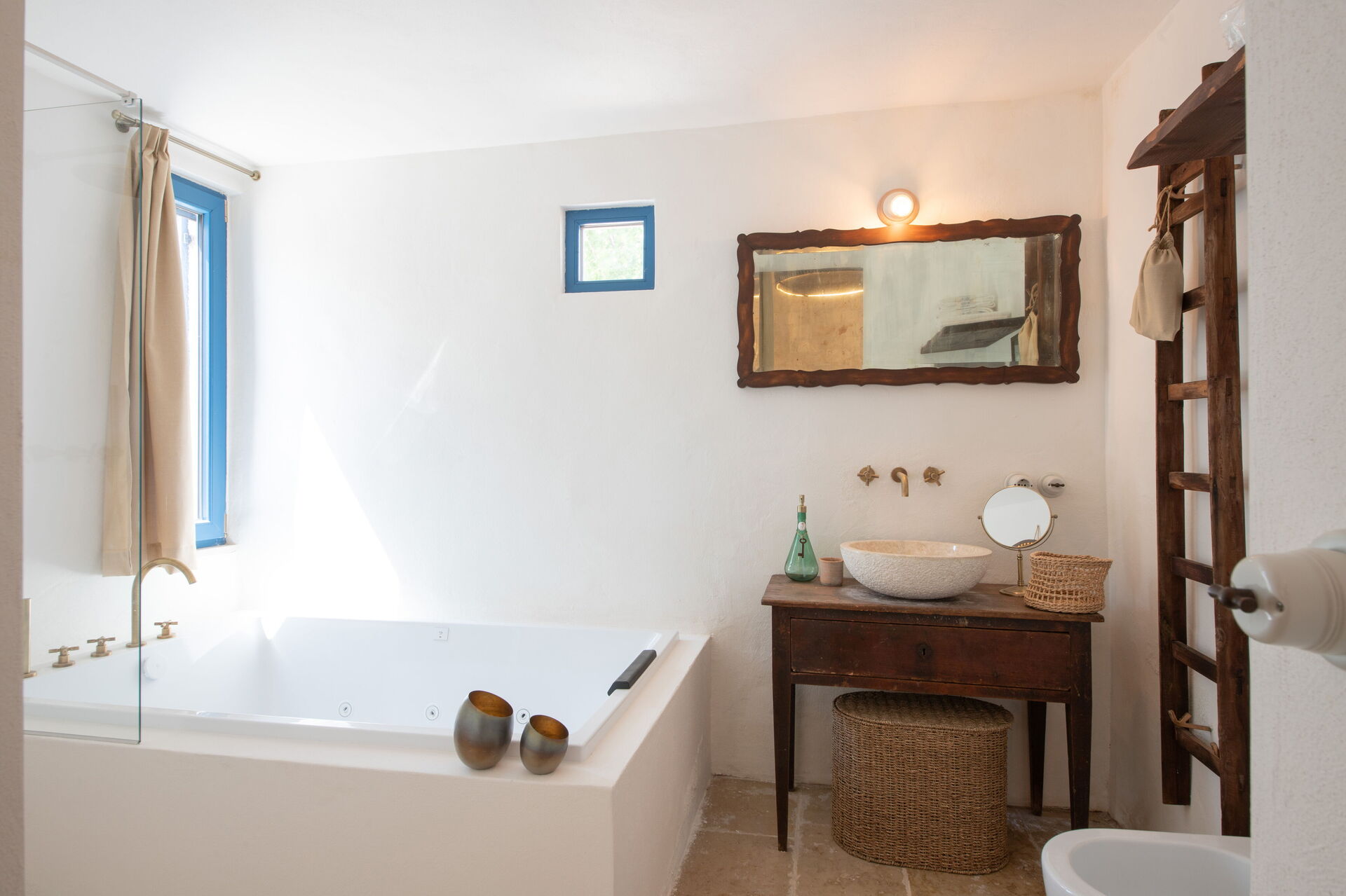 Camera da letto con bagno 1: letto matrimoniale, internet WIFI, aria condizionata, vasca da bagno idromassaggio, lavandino, wc, bidet, doccia, asciugacapelli.