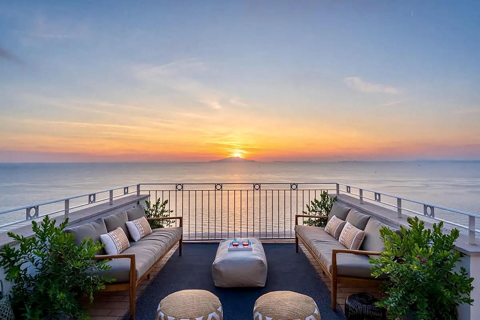 Una delle caratteristiche più notevoli di Casa Oscar è la grande terrazza privata, accessibile direttamente dalla zona living, arredata con divani da giardino, tavolo e sedie. La terrazza offre viste panoramiche ininterrotte sul Golfo di Napoli e sulle isole di Capri, Ischia e Procida. L'accesso alla proprietà dal livello stradale richiede 1 rampa di scale.
