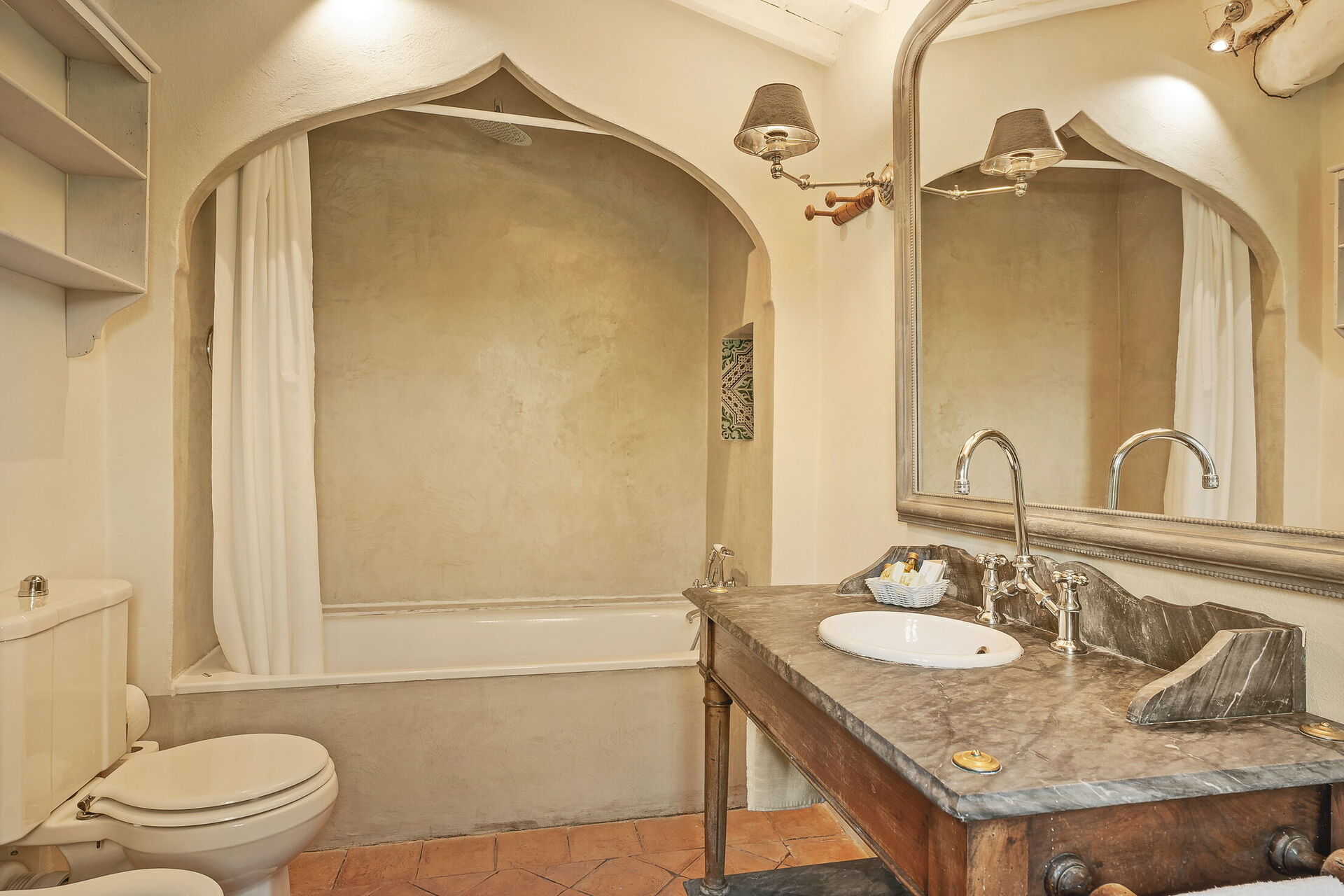 Camera da letto con bagno 1: letto matrimoniale, internet WIFI, aria condizionata, ventilatore a soffitto, poltrona, lavandino, wc, bidet, vasca da bagno, doccia, asciugacapelli.