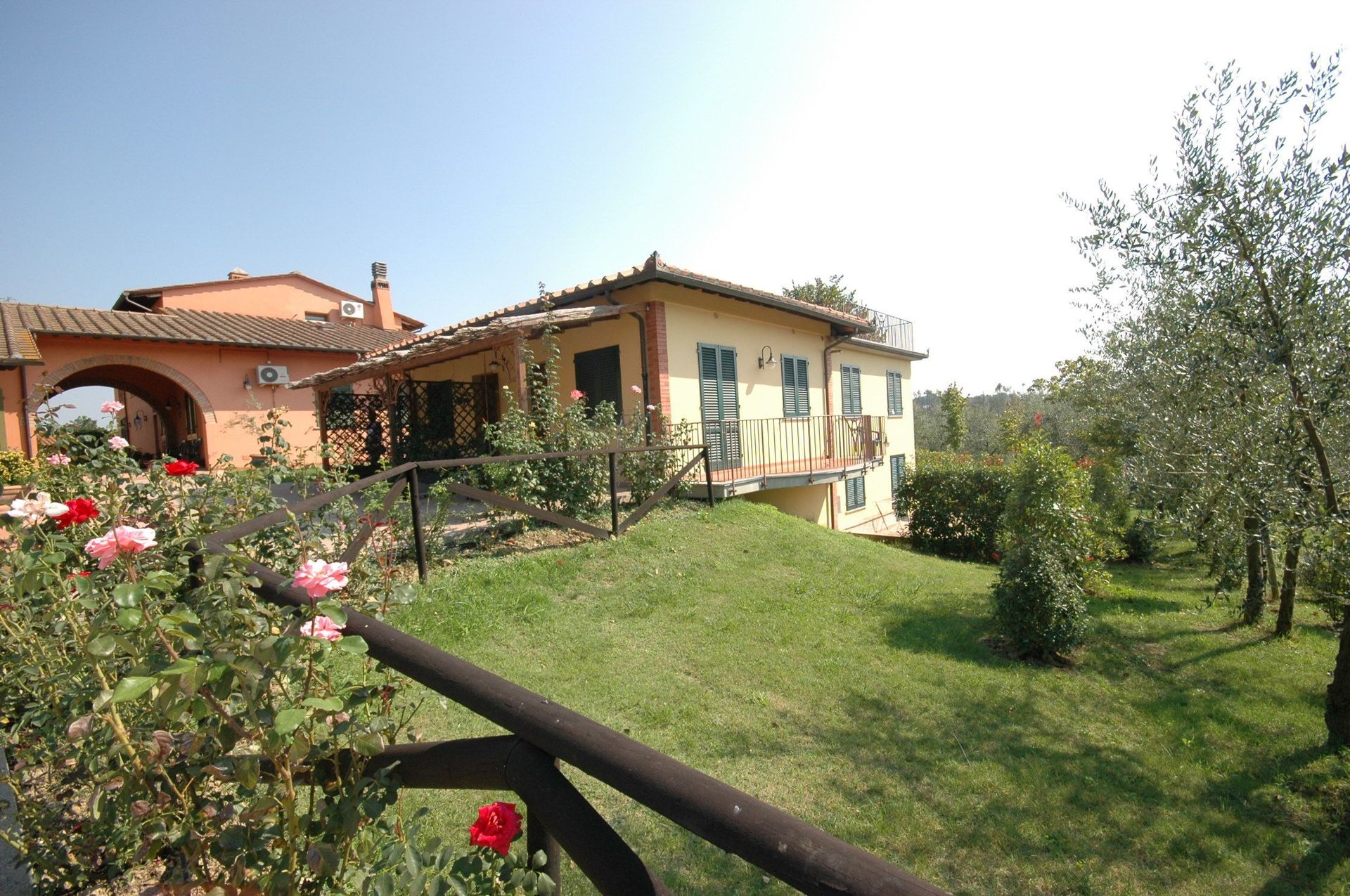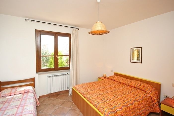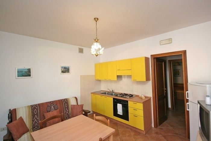 Piano terreno: ingresso su soggiorno con divano letto matrimoniale, zona pranzo e angolo cottura (forno), camera matrimoniale con letto singolo extra, bagno con doccia.