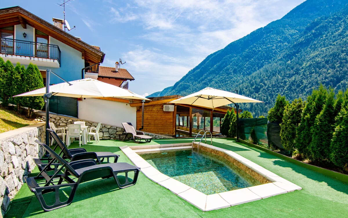 Il giardino condiviso offre uno spazio tranquillo dove rilassarsi e godere dell'aria fresca di montagna, con arredo da giardino a disposizione. La piscina esterna condivisa consente di rinfrescarsi durante i mesi più caldi. Una piscina interna riscaldata, condivisa, misura 4 x 10 metri con profondità di 130 cm ed è disponibile dal 1° giugno al 15 settembre, con orario di apertura dalle 10:00 alle 19:00. Una terrazza condivisa è disponibile per godere del panorama circostante. Un sentiero con gradini conduce all'ingresso della casa.