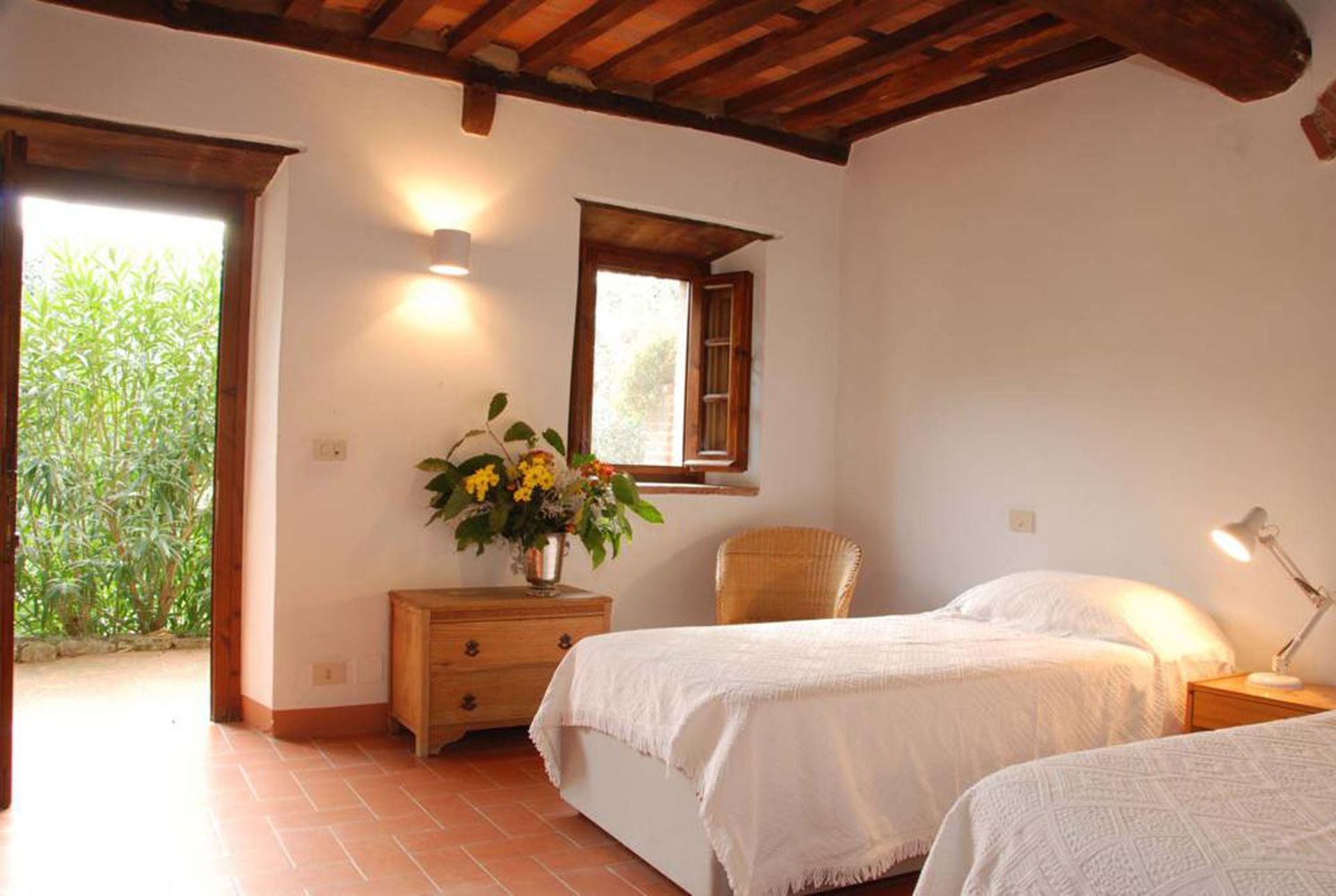 Camera da letto 1: due letti singoli, internet WIFI, ventilatore portatile, uscita sul giardino.