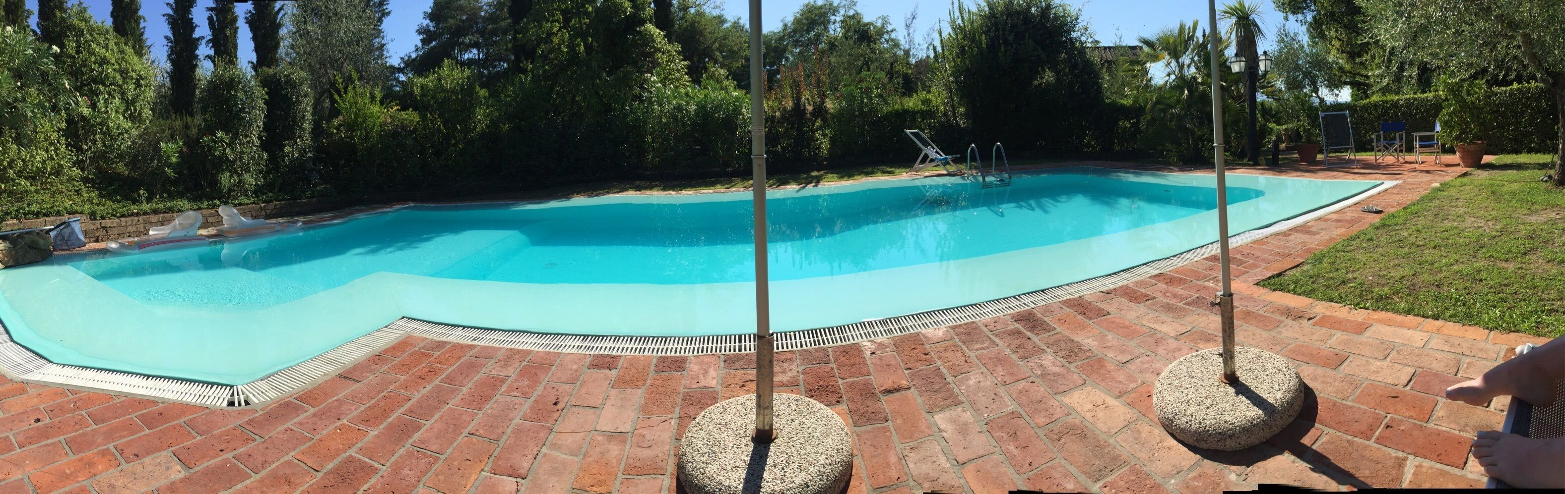 La casa, situata nel medesimo podere de Le Rondini (anch'essa parte della nostra offerta), è circondata da un grandissimo giardino ben mantenuto, dotato di una piscina particolarmente ampia se rapportata alle dimensioni della villa. La piscina è depurata con filtro ad acqua salata, senza uso di cloro. Il giardino è completamente recintato, quindi ideale per famiglie con bambini, e dispone anche di un'area giochi per bimbi.