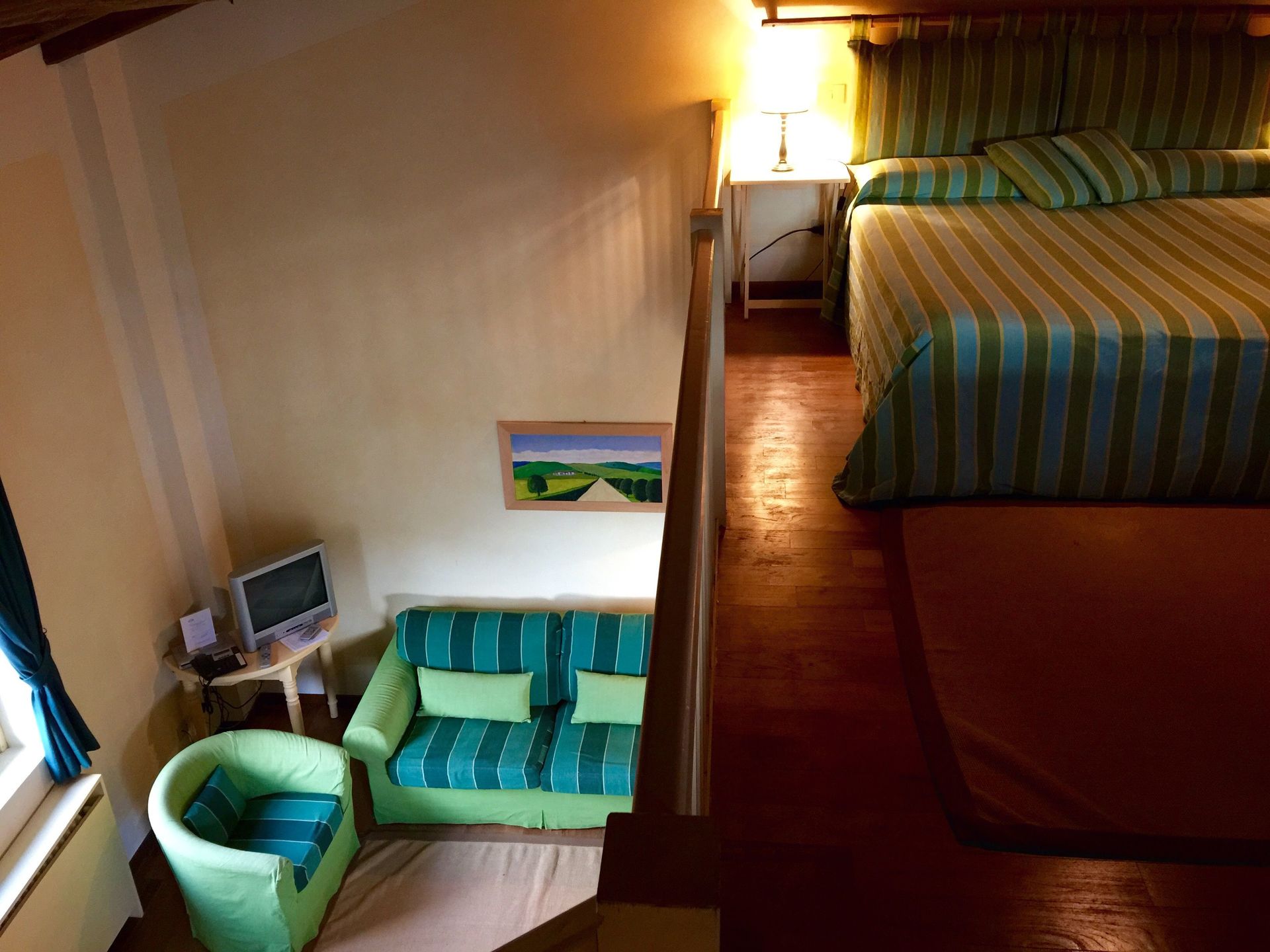 suite porporasoggiorno con letto singolo e sul soppalco 1 letto matrimoniale e due letti singoli, bagno con doccia e vasca.