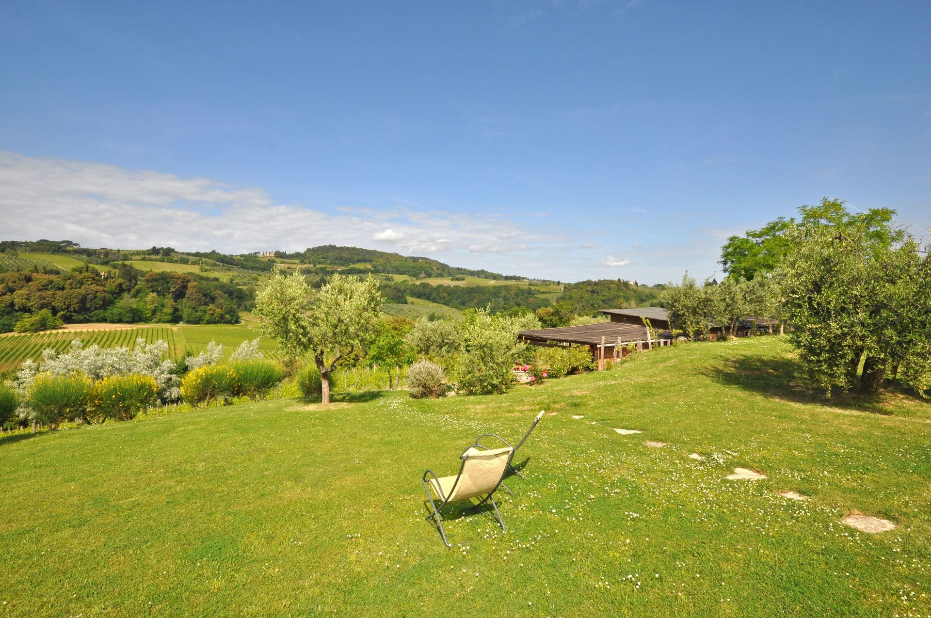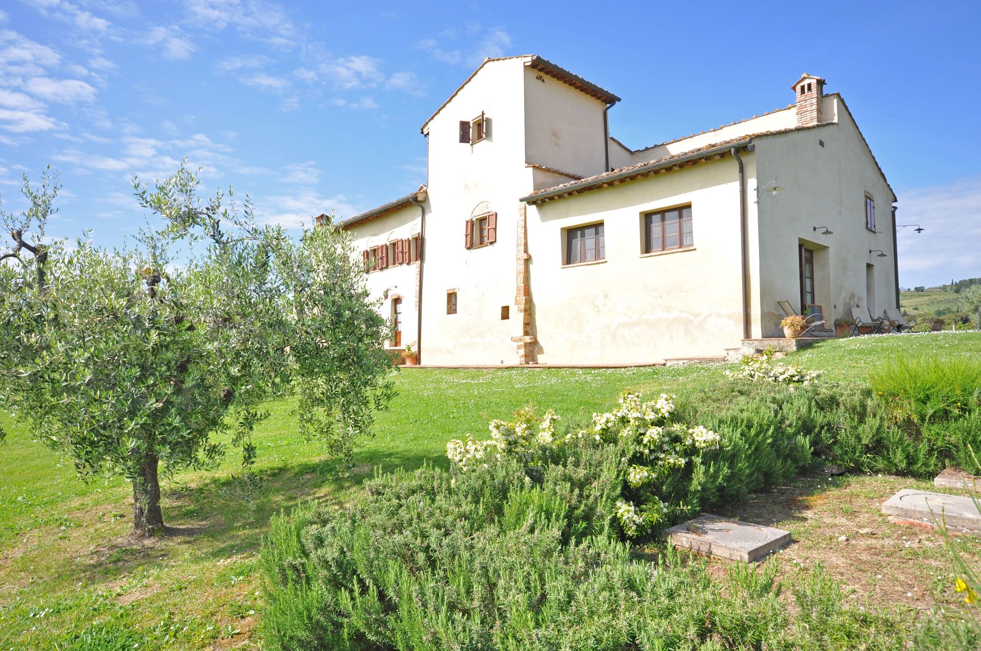 [English translation courtesy of Easy Reserve] Hello, we have stayed two weeks in August 2011 in the BLUE house. The temperature during these two weeks was over 30°C every day. La Marronaia is located about 2 km outside the charming town San Gimignano, Tuscany where it's at its best. It's lovely rural life among the vineyards and olive groves. The houses are spacious with practical furnishings. There are only three apartments, so it is quiet. There is a large swimming pool for the necessary cooling. Each cottage also has outdoor furniture. Silvia and Luigi, the Italian owners, live above the apartment with their family, two dogs and 13 cats. They are really very hospitable, we felt very welcome and at home.