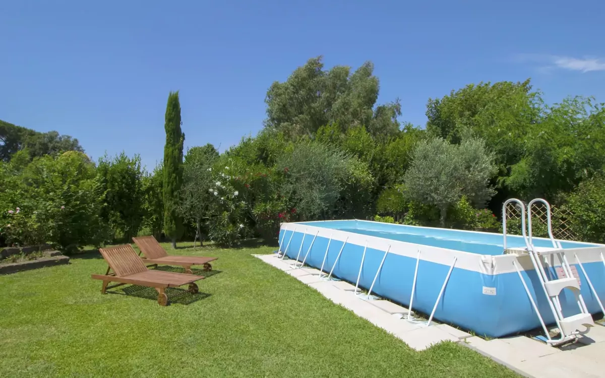 Il giardino di 900 m² è completamente recintato e paesaggistico con prato curato e un'area naturale per la fauna selvatica. La piscina privata è una struttura fuori terra che misura 5 x 2 metri con profondità di 122 cm, disponibile dal 1° maggio al 30 settembre. Un'area patio arredata con mobili da giardino offre uno spazio confortevole per il relax e la socializzazione all'aperto. Un barbecue è disponibile in loco per cene all'aperto.