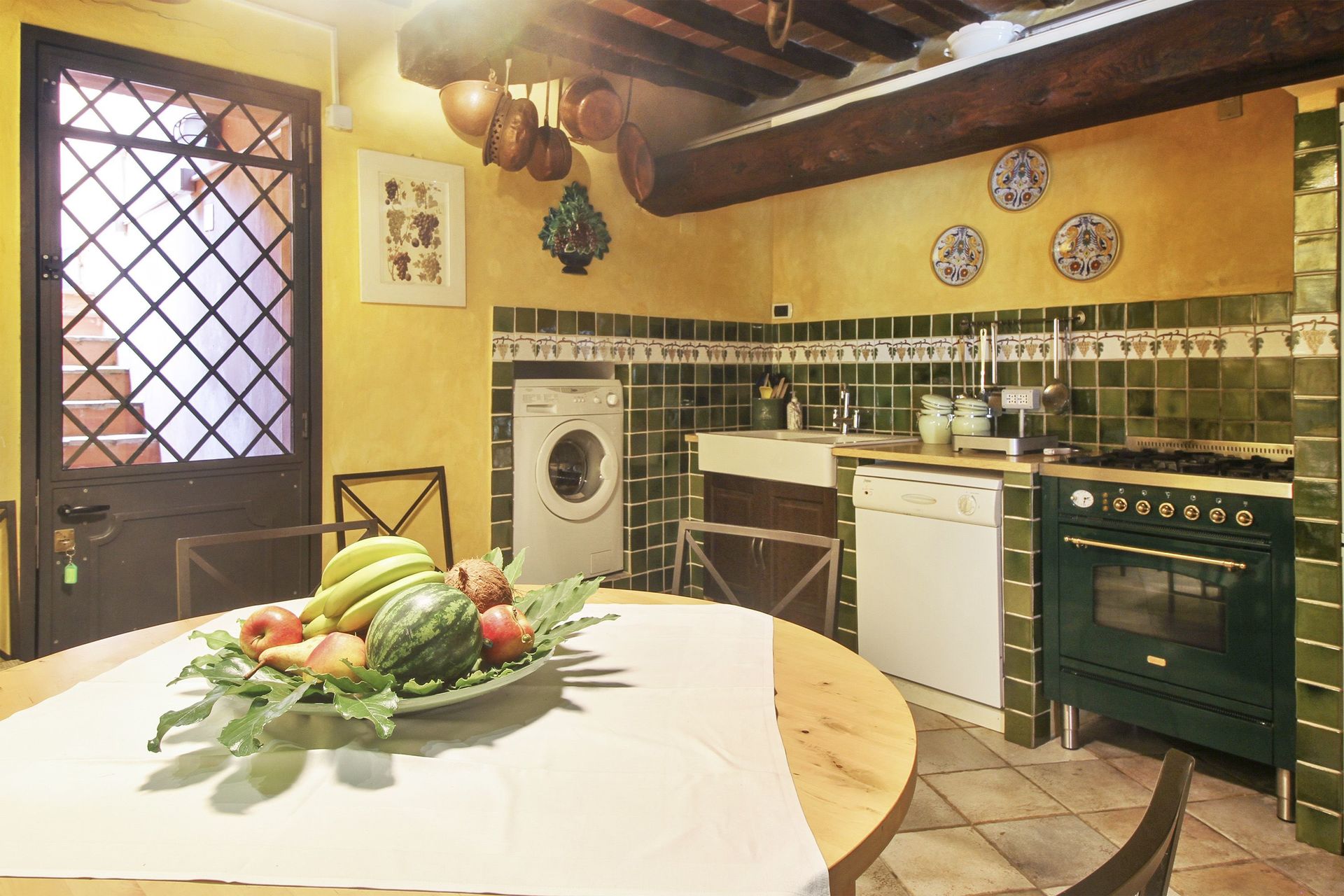 Piano terreno: ingresso, soggiorno (TV-sat., stereo) con accesso al primo piano, cucina aperta (forno, freezer, piccolo microonde, lavastoviglie, lavatrice, macchina caffè americano, ferro e asse da stiro) con tavolo da pranzo (6pers.) e accesso sull’esterno.