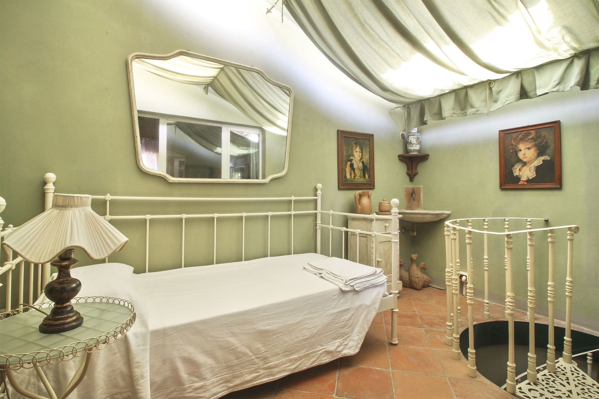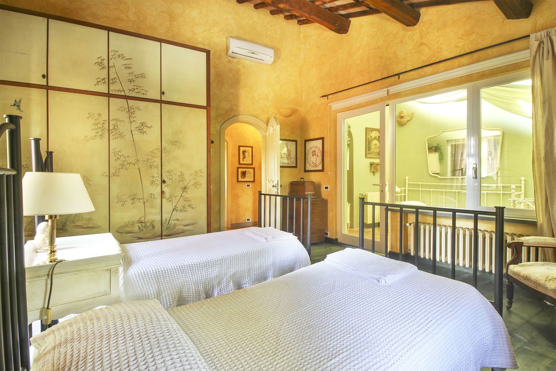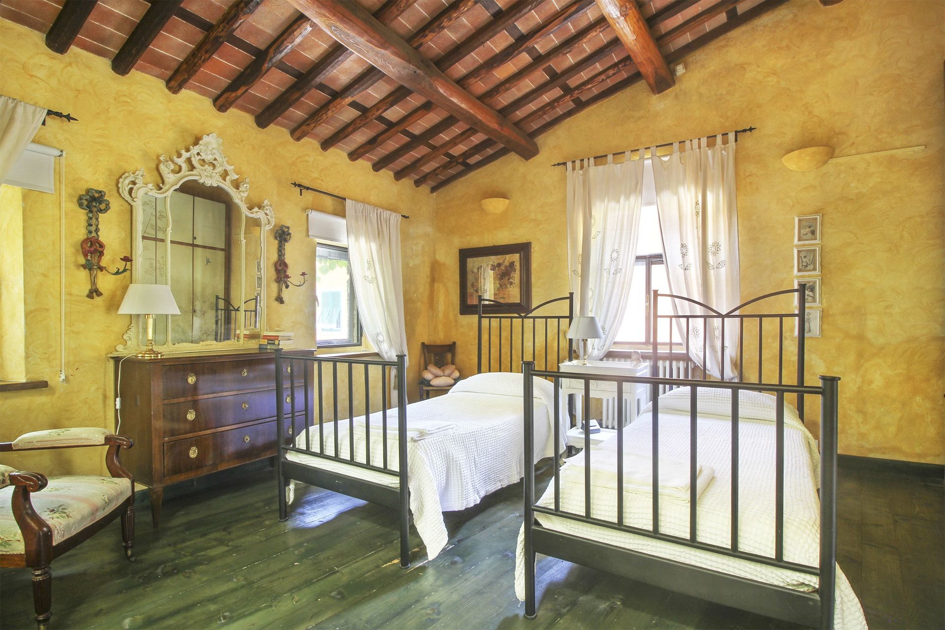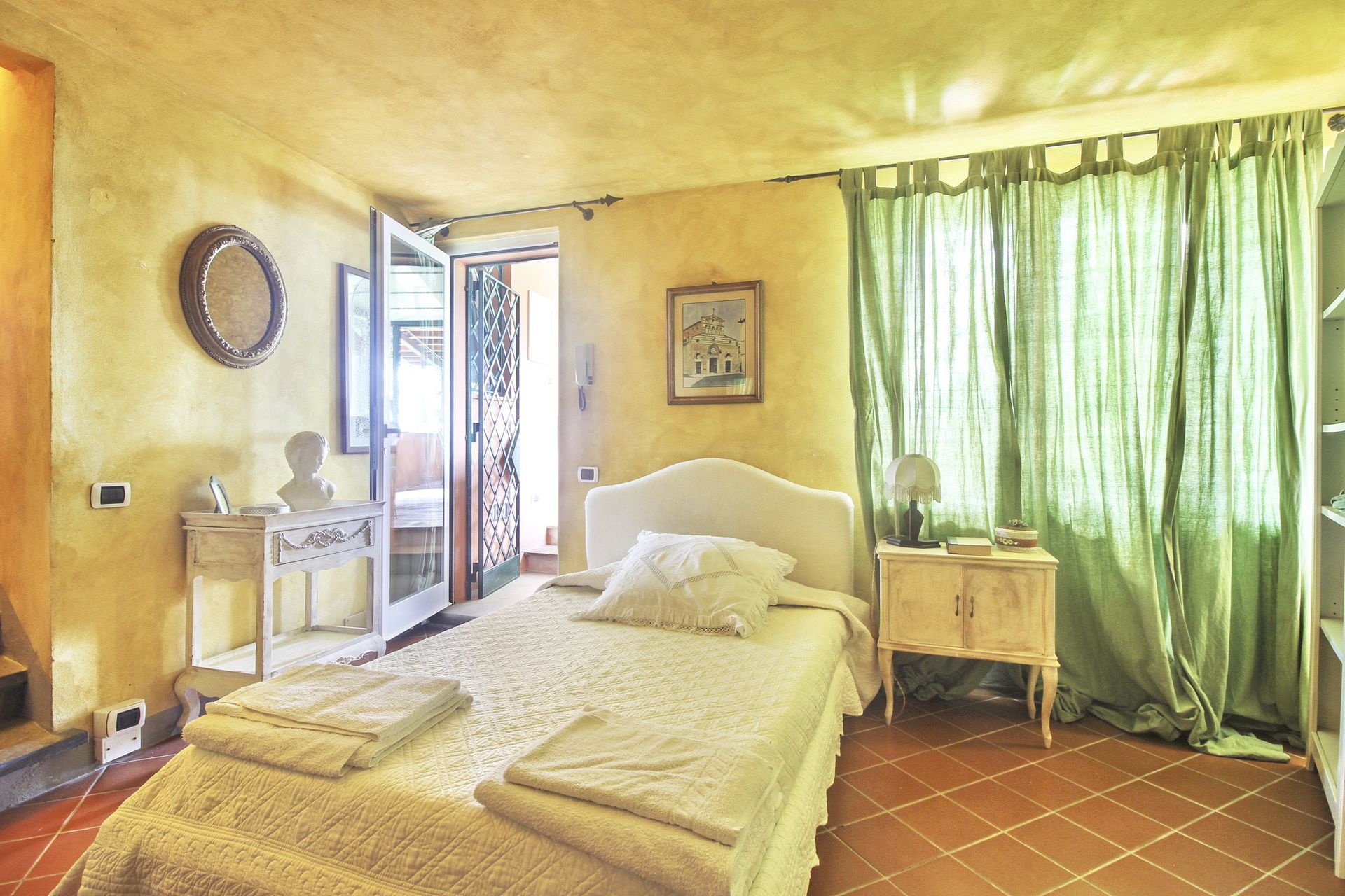 1° Piano (accesso tramite una scala a chiocciola oppure dall’esterno): salottino-camera con letto da una piazza e mezzo e accesso ad una piccola veranda chiusa con vetrate (5 m2) a attrezzata con tavolo per due persone, piccolo cucinotto di passaggio (piccolo forno elettrico, freezer) con accesso alla veranda, grande camera matrimoniale con accesso su una terrazza coperta (10 m2) e bagno privato con doccia, camera con 2 letti singoli, camera di passaggio con letto singolo (finestra a tetto), bagno con vasca.