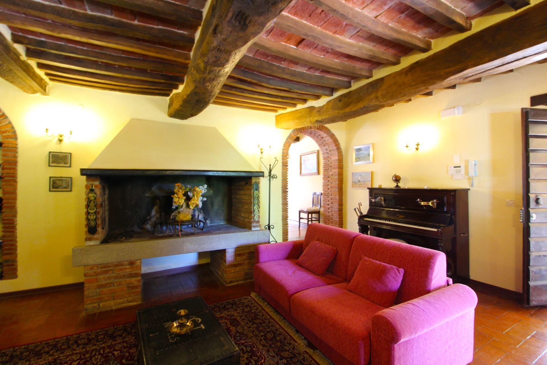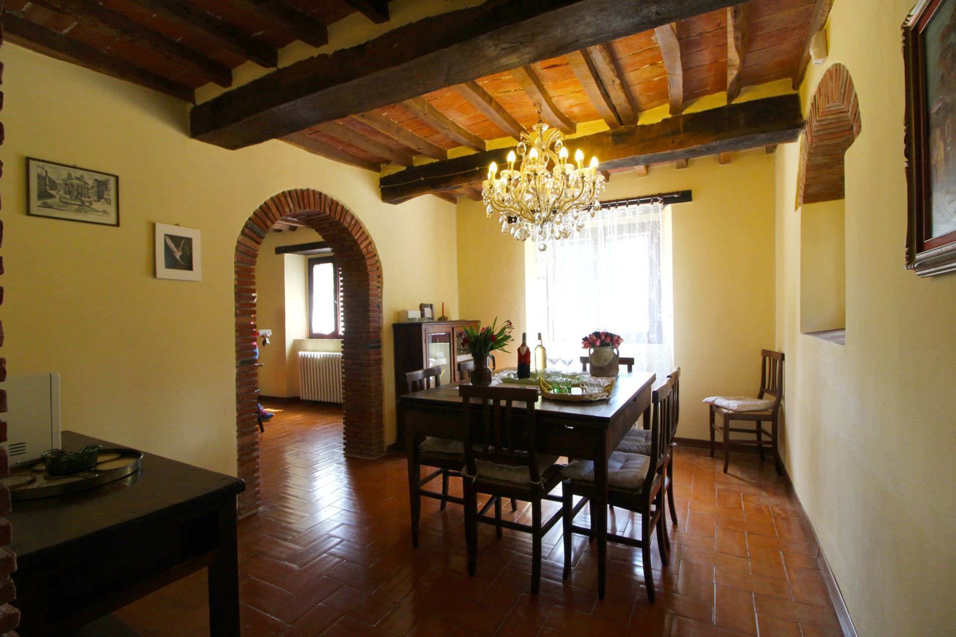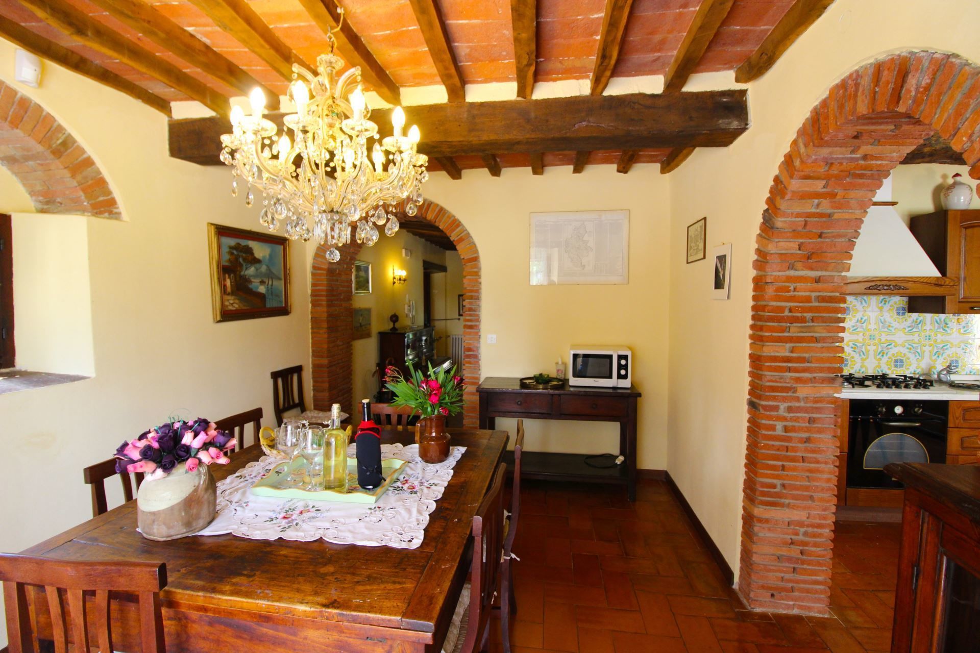 PIANO TERRA: salotto con ampio camino, divano letto matrimoniale e pianoforte, piccolo bagno di servizio (lavandino e wc), salendo uno scalino si accede alla sala da pranzo e attraverso un caratteristico arco di mattoni, alla cucina, dalla quale si accede al porticato arredato con tavolo e sedie.