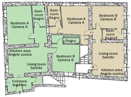 On the first floor. Each apartment has a combined living-room/kitchen and two double bedrooms, each with bathroom (one with shower and one with tub in EAST, both with shower in WEST).