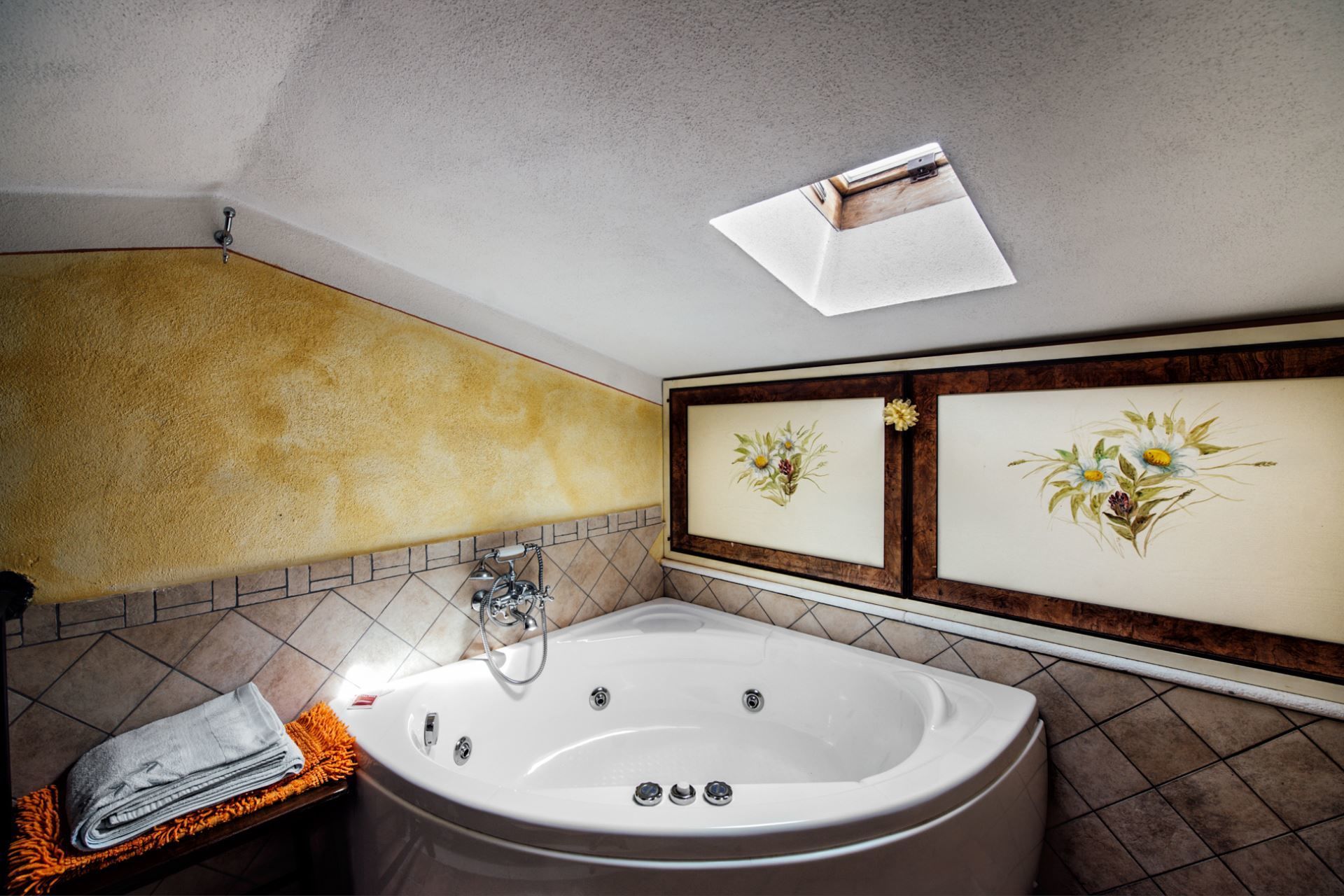 Appartamento a piano terra nella casa Il Granaio con ingresso da pergola privata attrezzata con tavolo e sedie per mangiare fuori, piccolo salotto con divano letto alla francese, camera matrimoniale, bagno con doccia, cucina-pranzo, soggiorno con divano letto matrimoniale, camera matrimoniale con bagno privato con doccia e vasca idromassaggio.