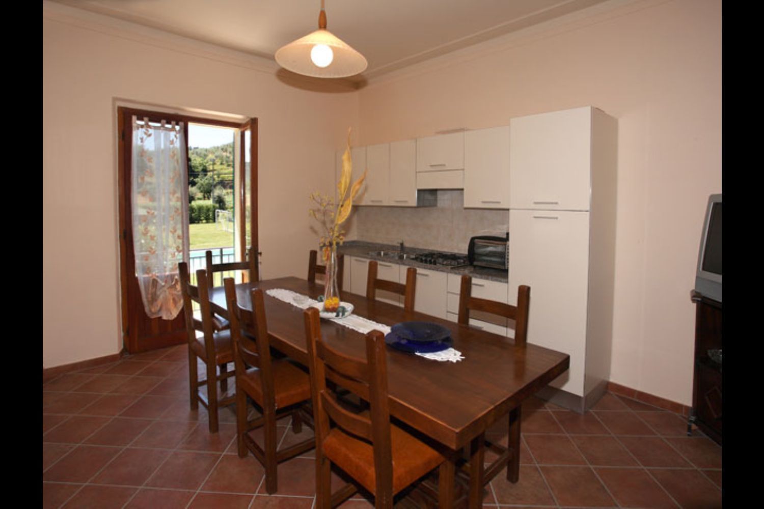 L’appartamento, accogliente e ben arredato, è situato a piano primo del casolare ed usufruisce di una comoda scala privata che scende in giardino dal lato piscina. A piano terra abitano i proprietari che con la loro discreta presenza saranno un sicuro punto di riferimento per ogni informazione e necessità.